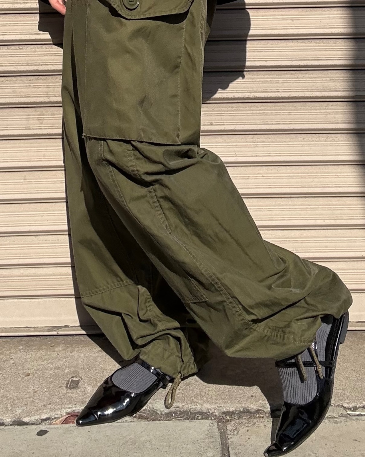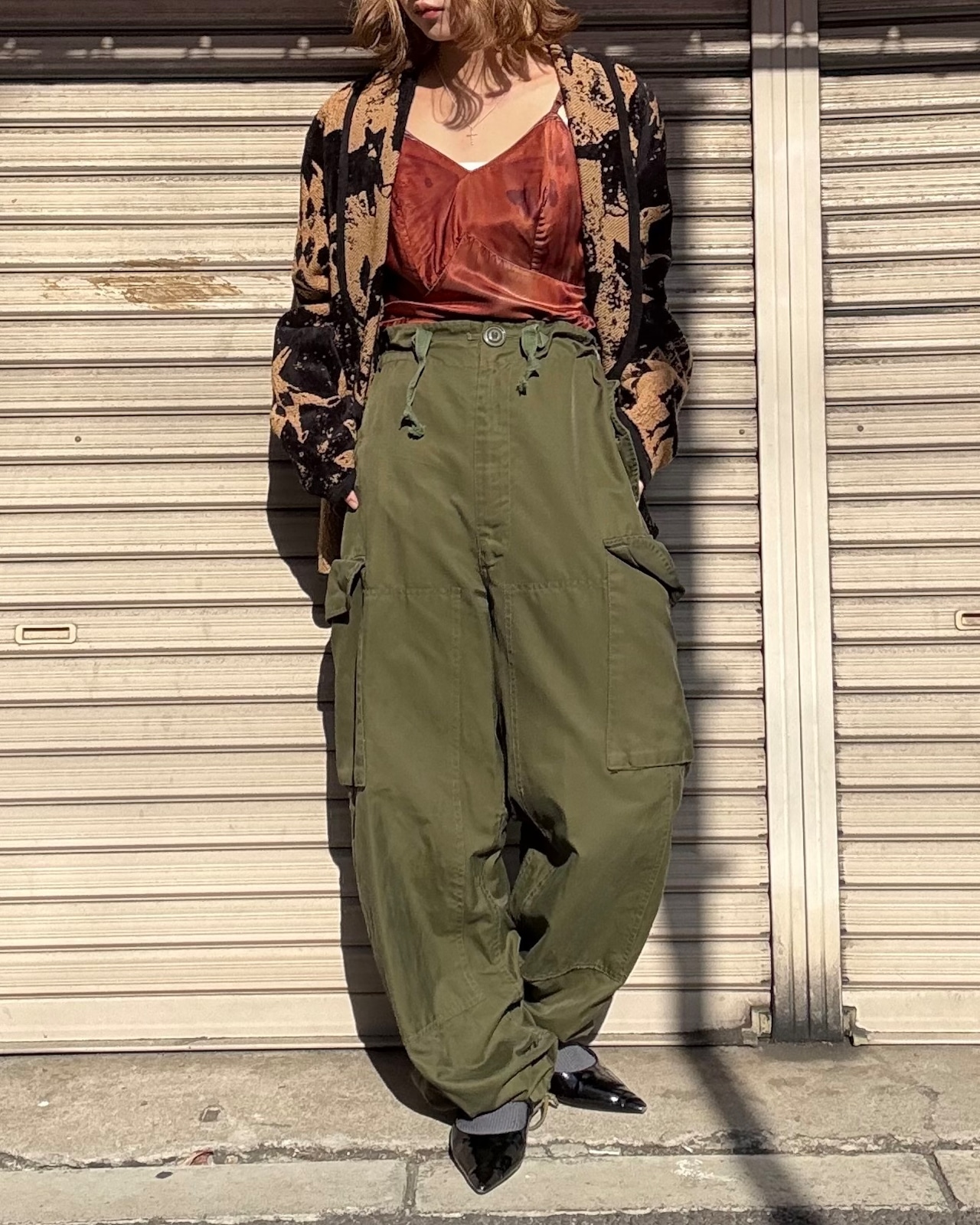 サイドの大胆なビッグポケットがポイントで、裾をキュッと絞り丸みのあるシルエットにするのがおすすめの着こなしです。