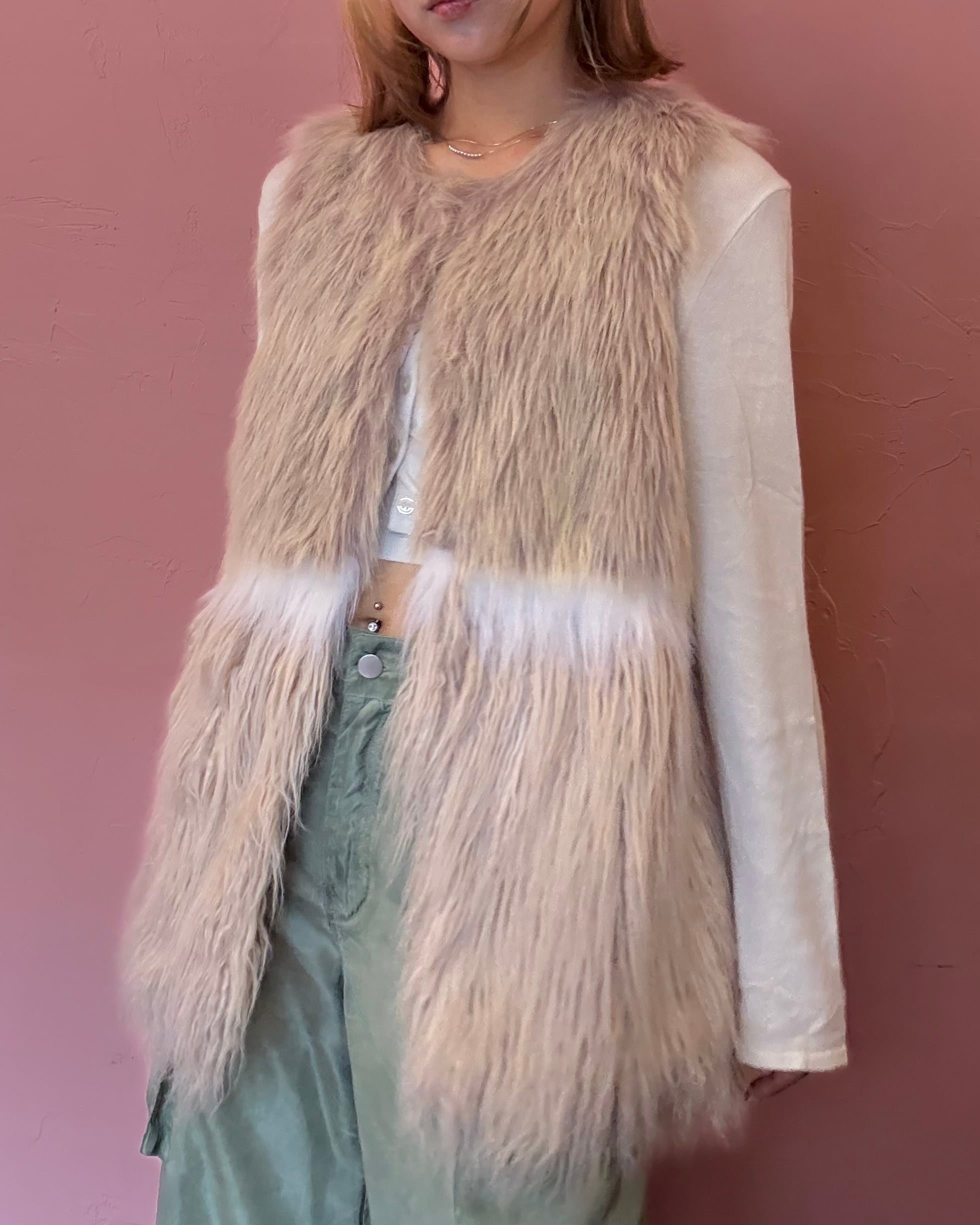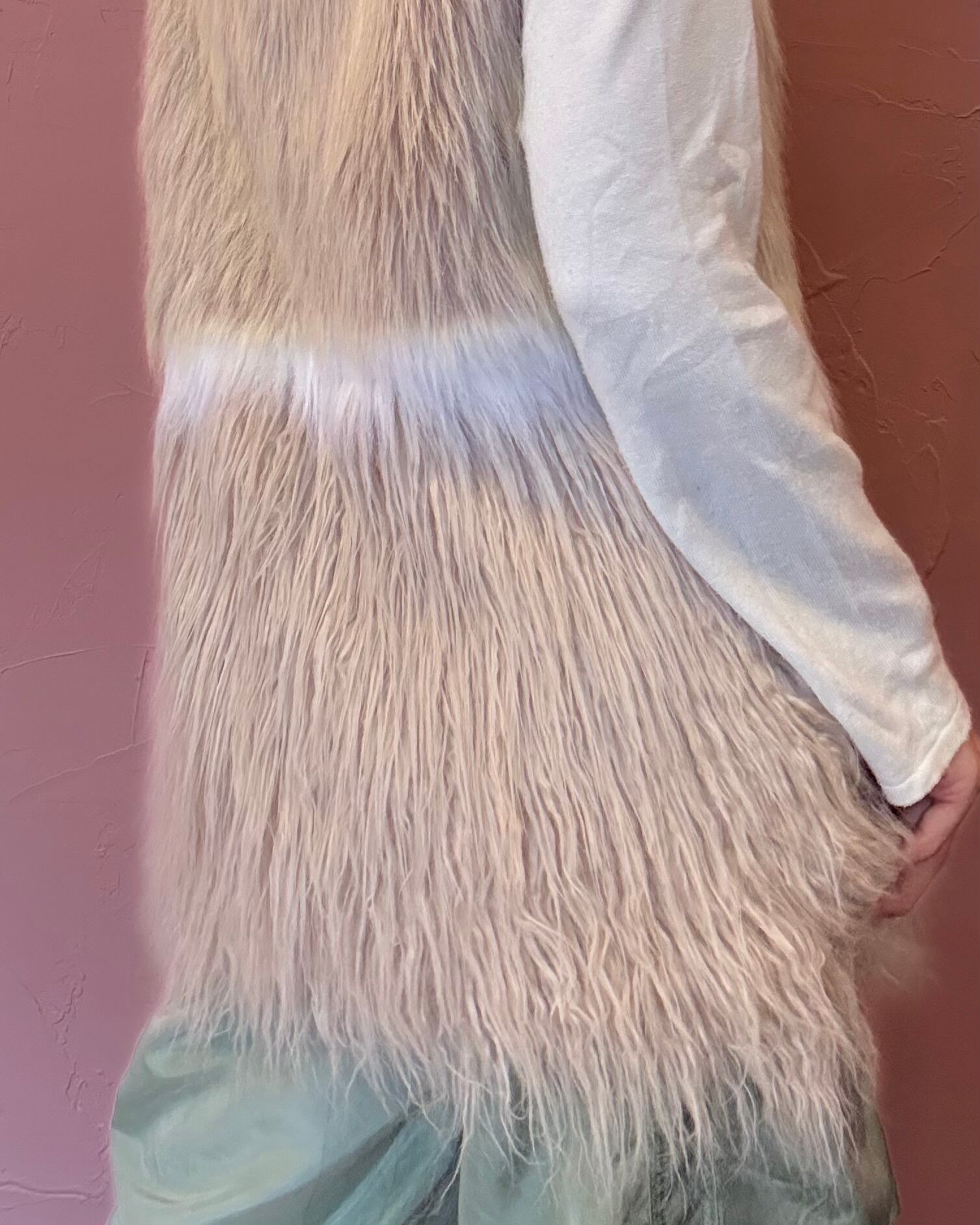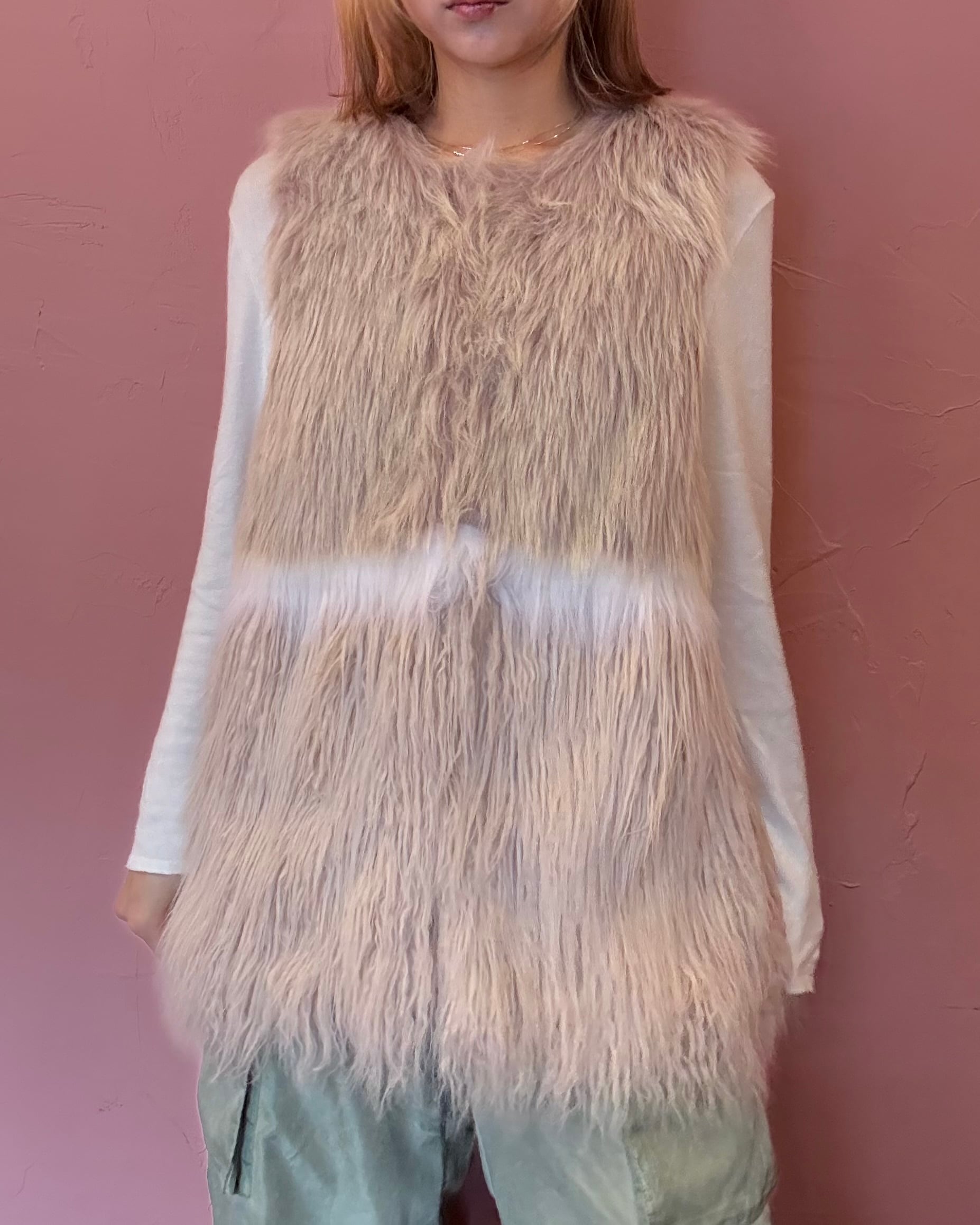 ベージュピンクとホワイトの淡いカラーが、特徴のフェイクファーベスト。