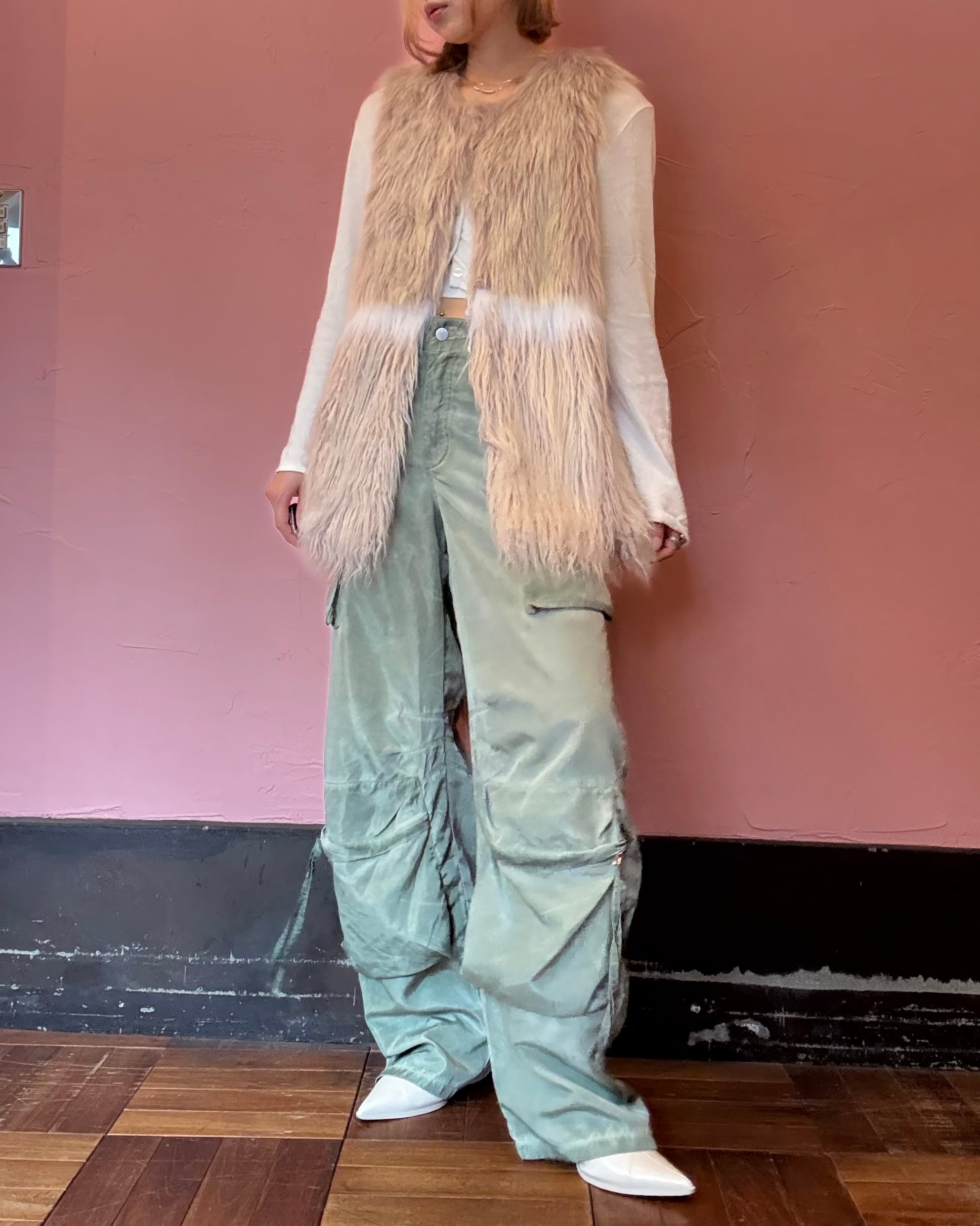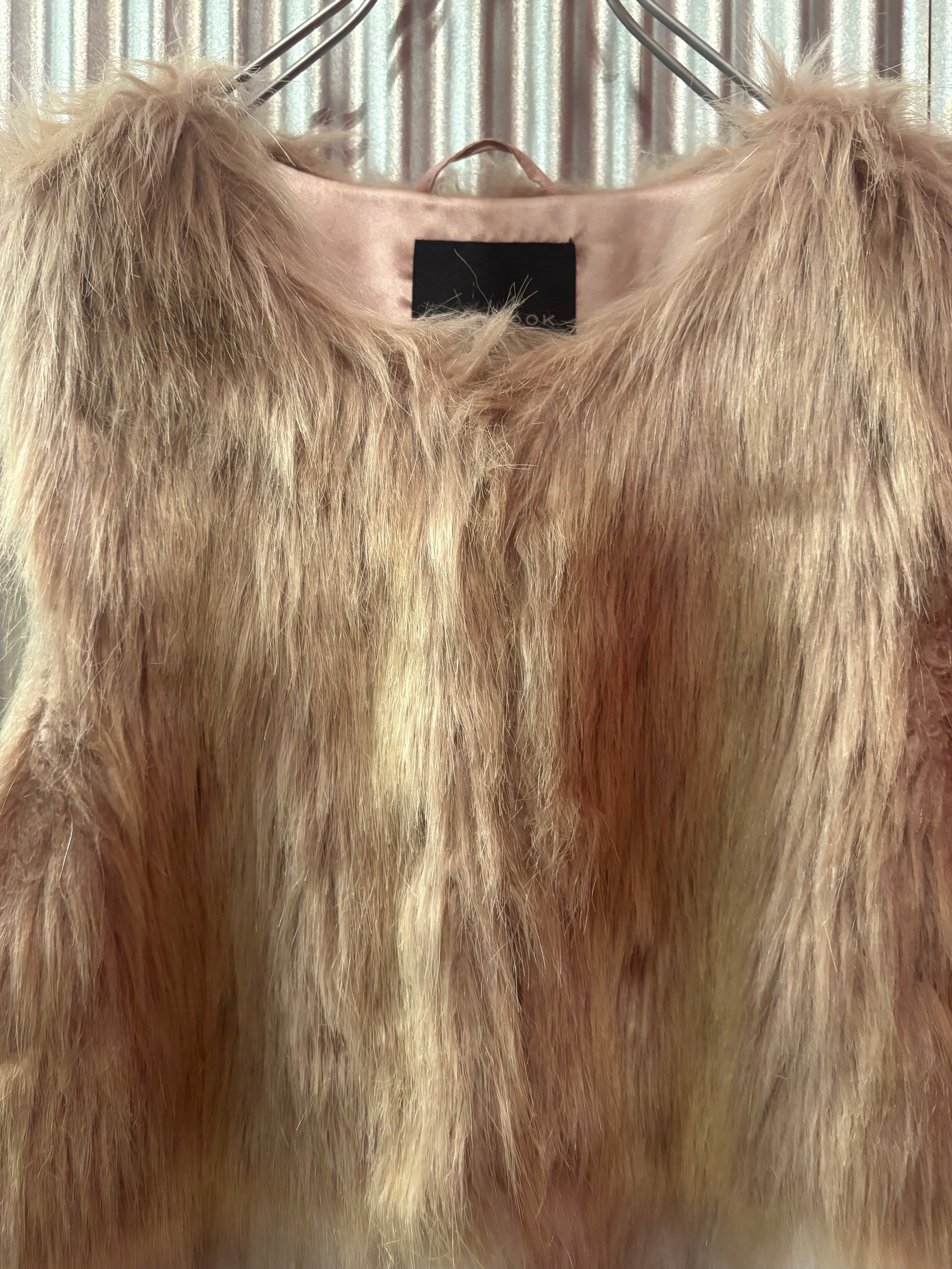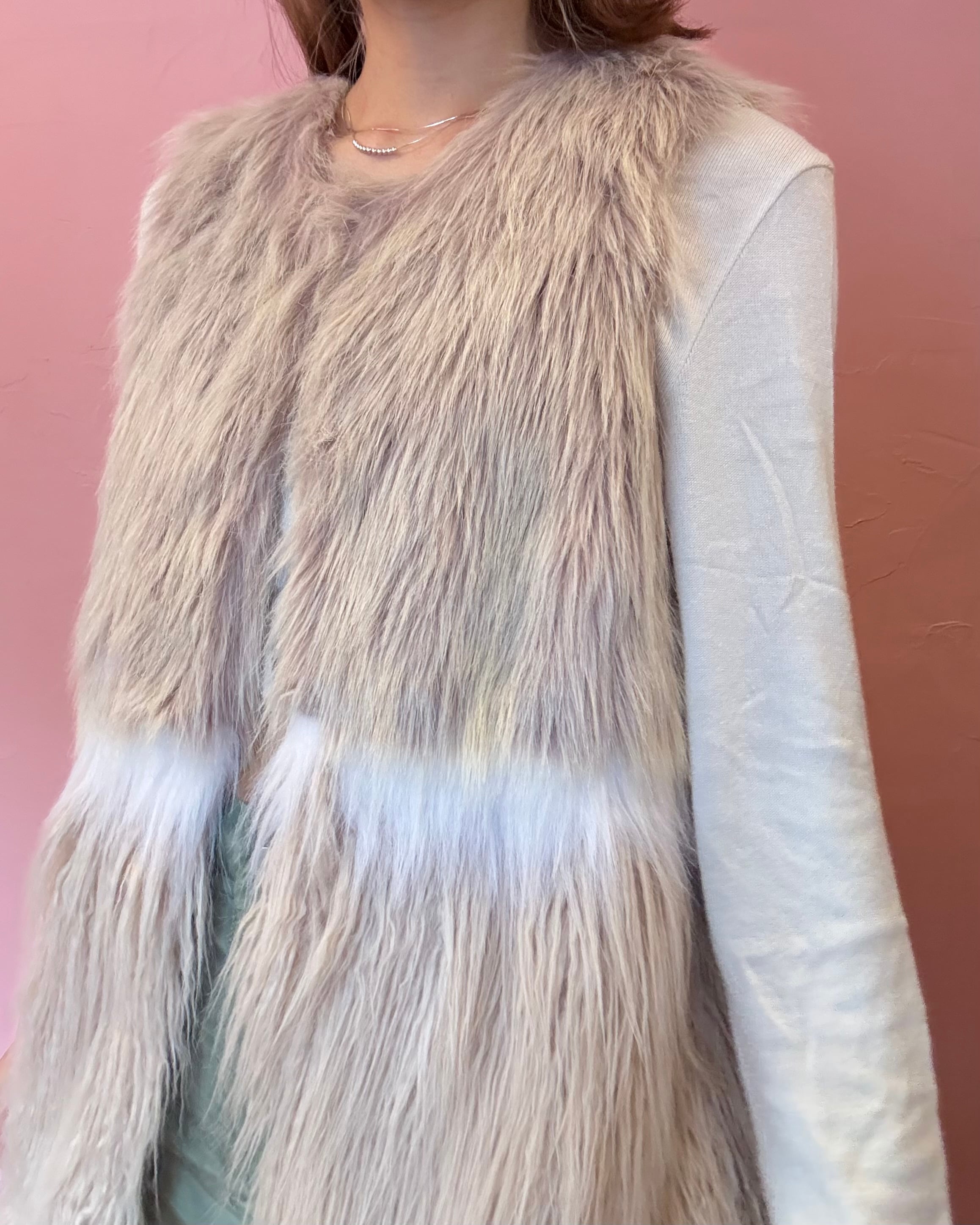 ベージュピンクとホワイトの淡いカラーが、特徴のフェイクファーベスト。