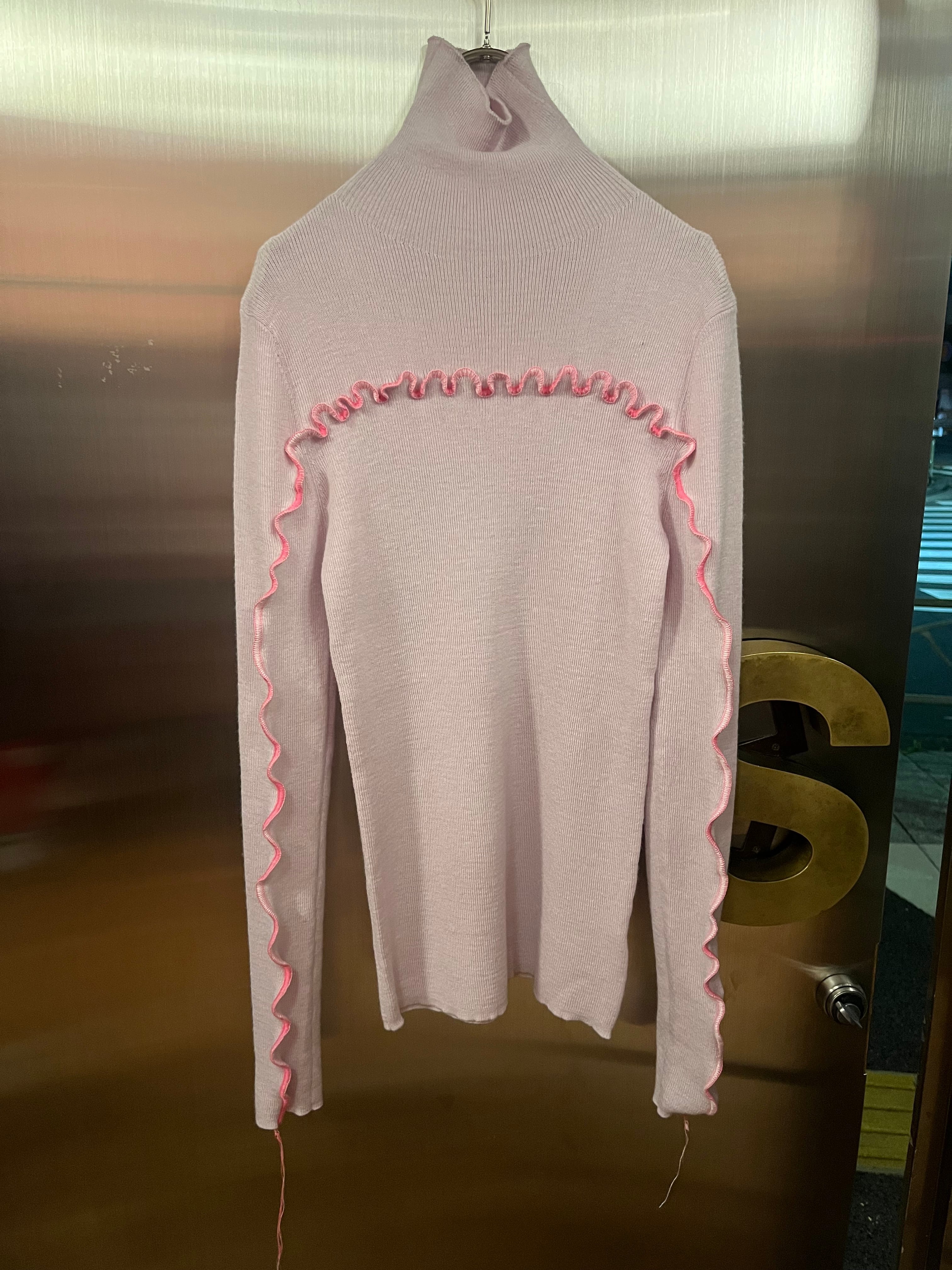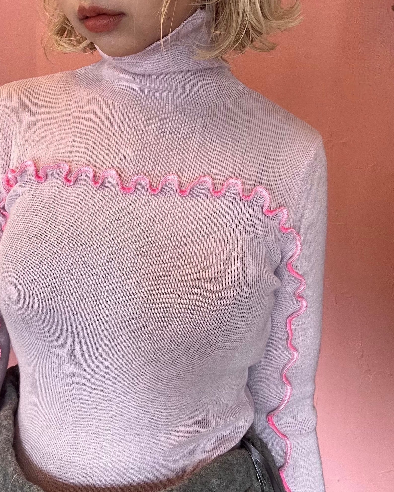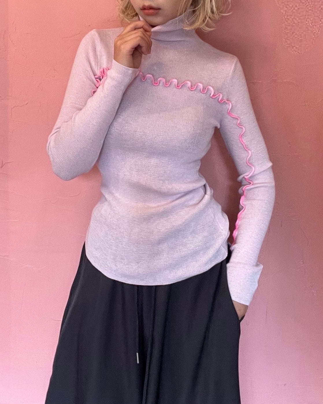 袖から繋がるベビーピンクのステッチがシンプルでさりげないかわいさ。