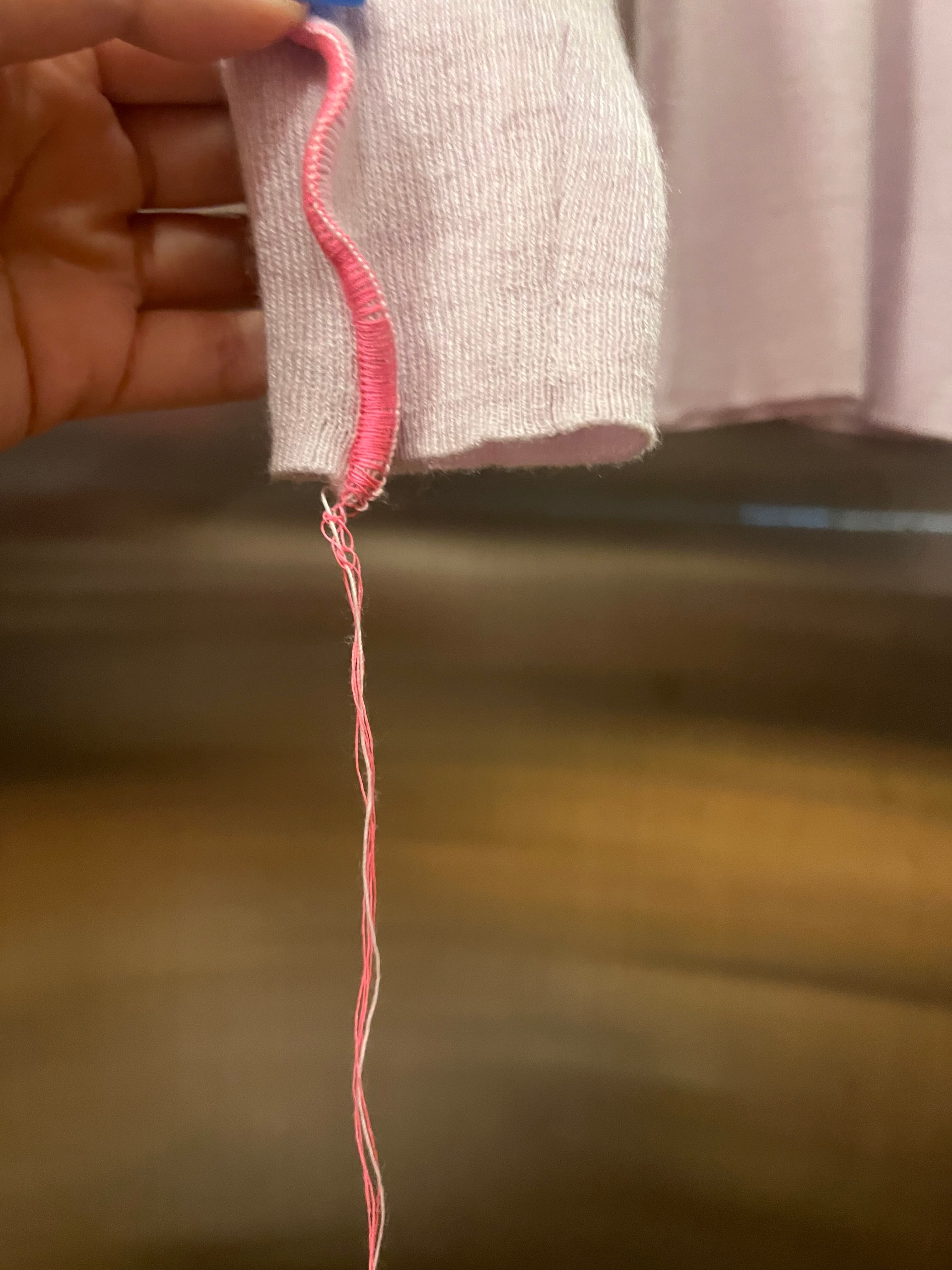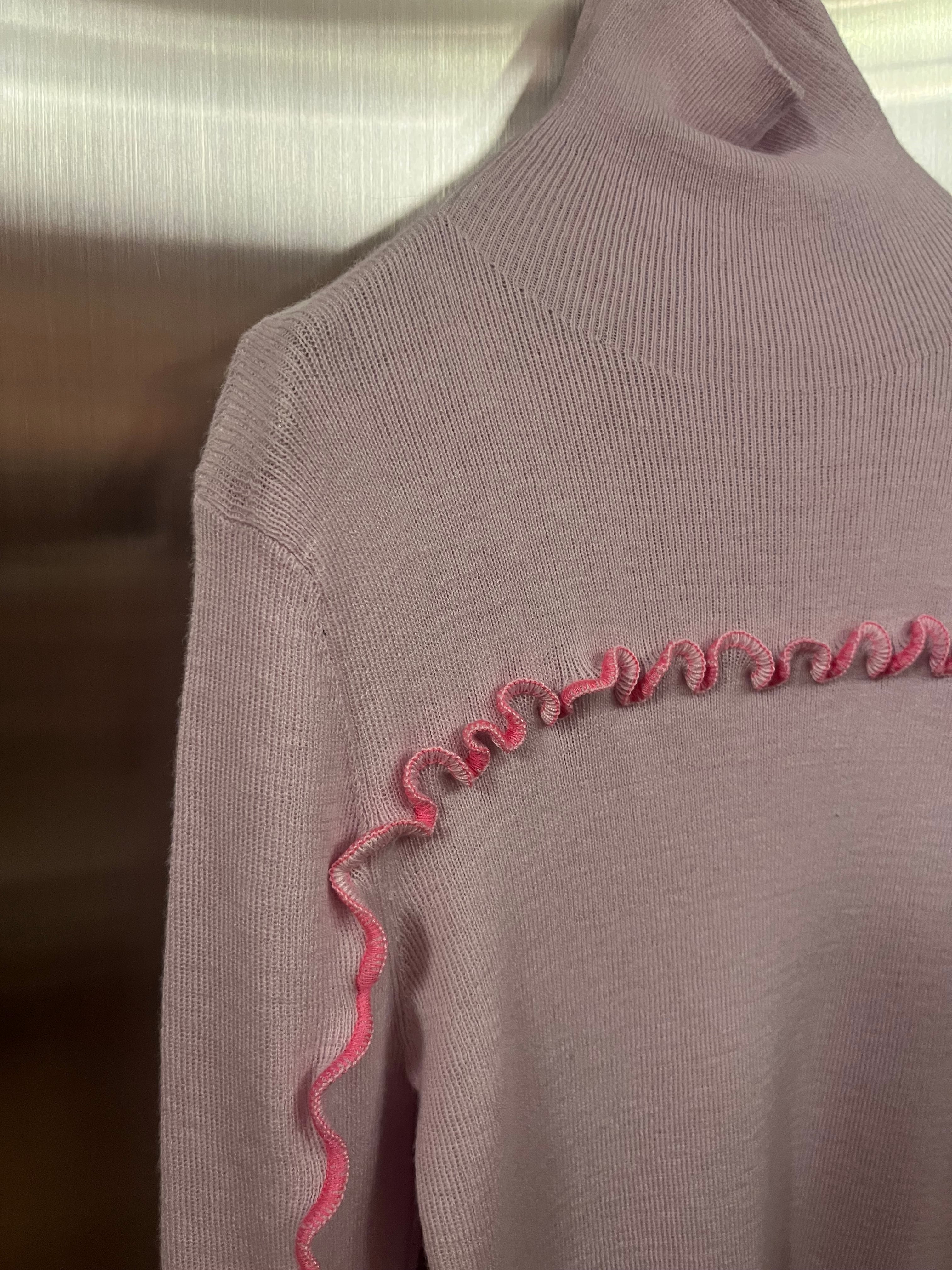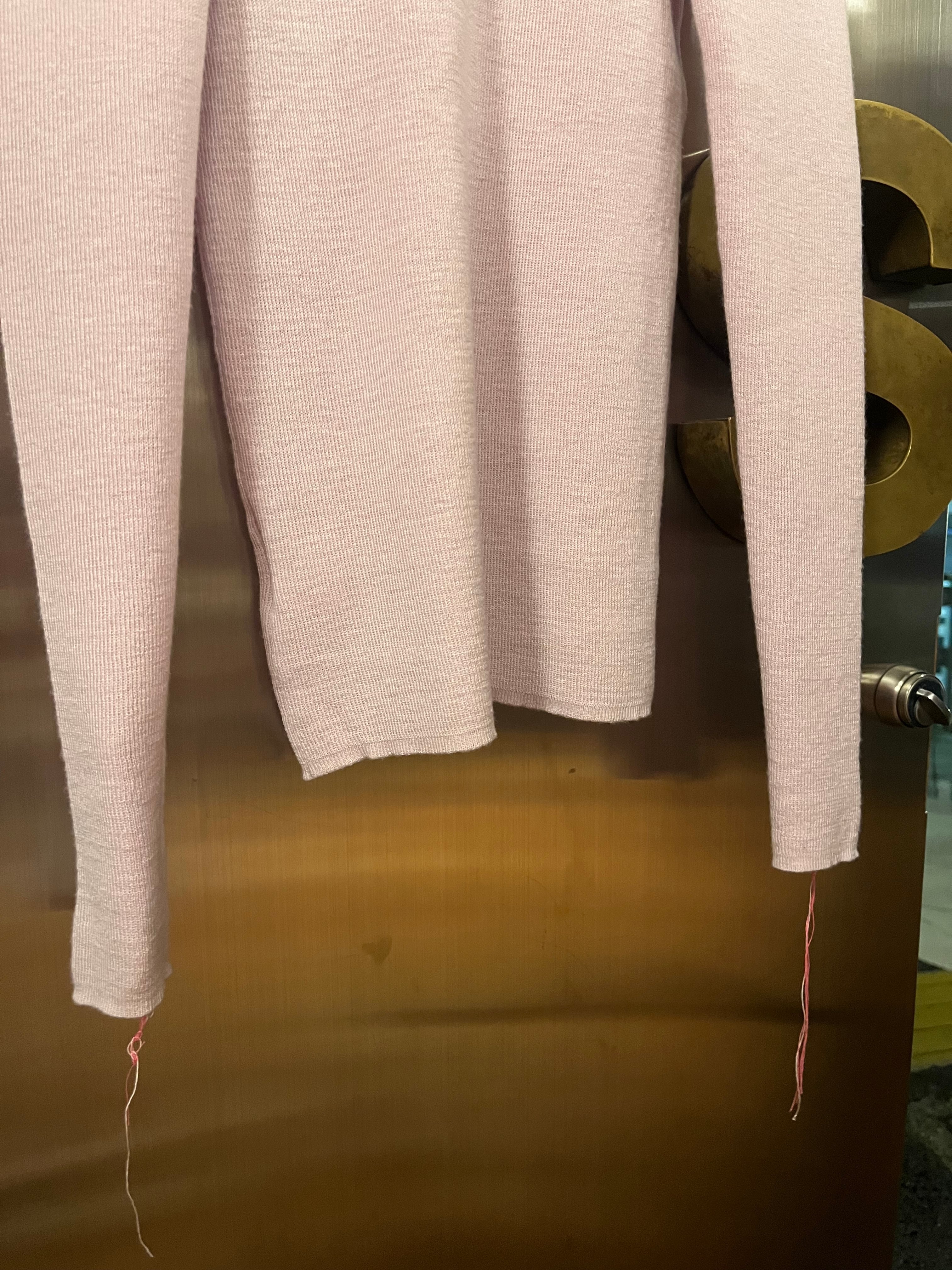 袖から繋がるベビーピンクのステッチがシンプルでさりげないかわいさ。