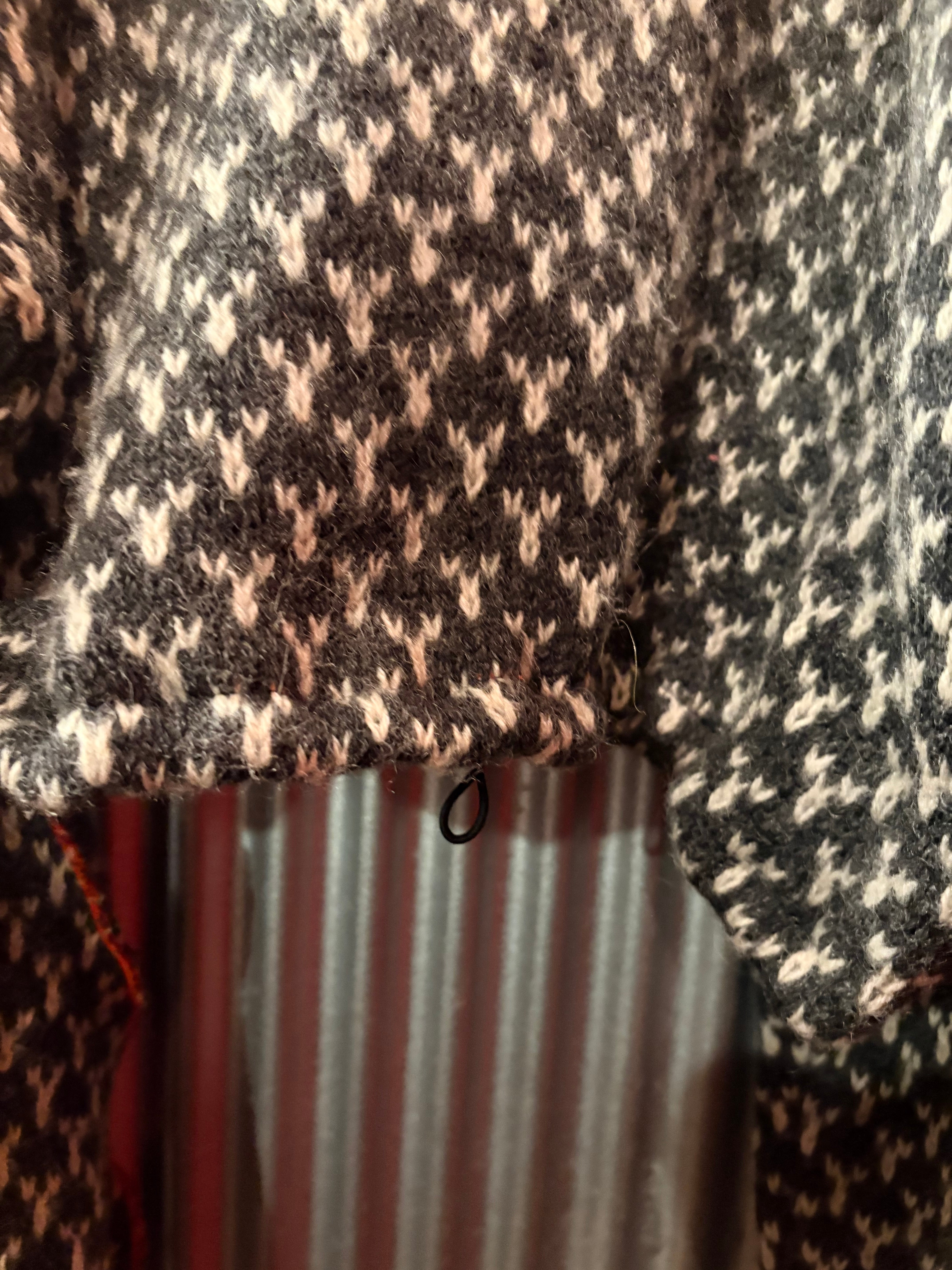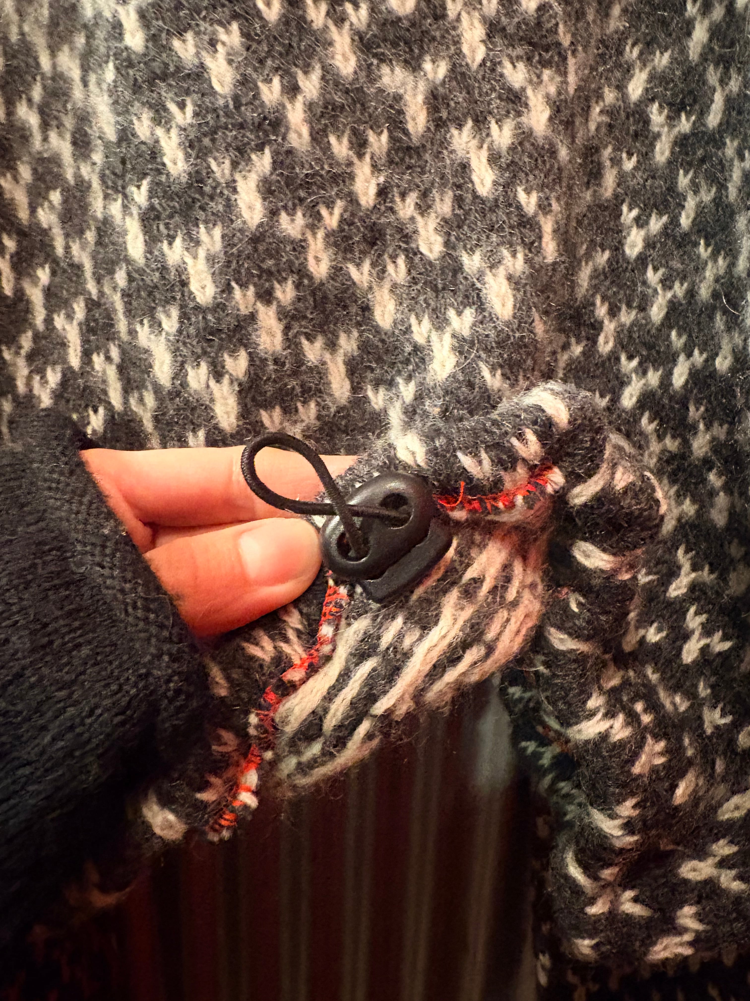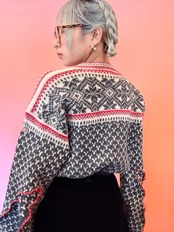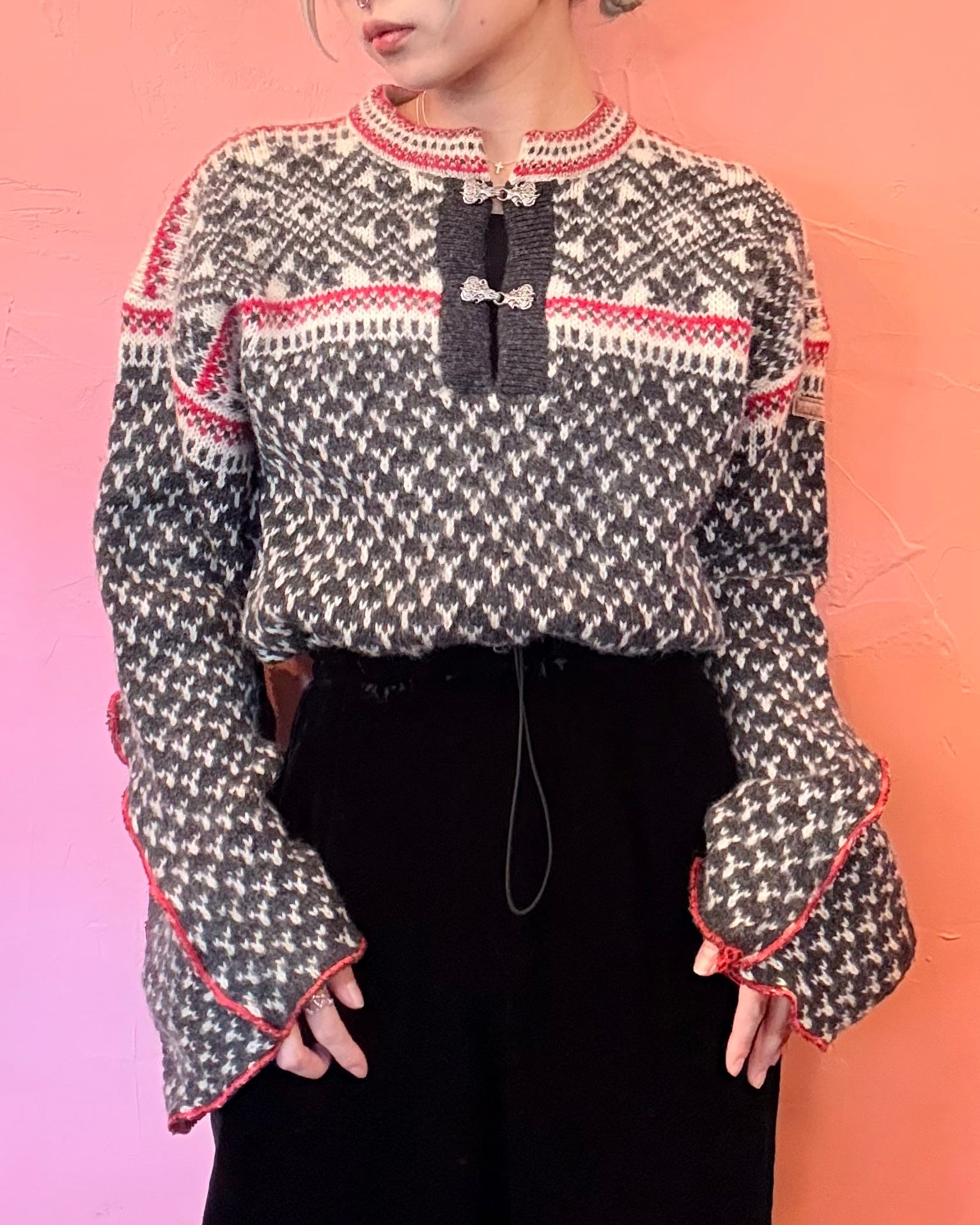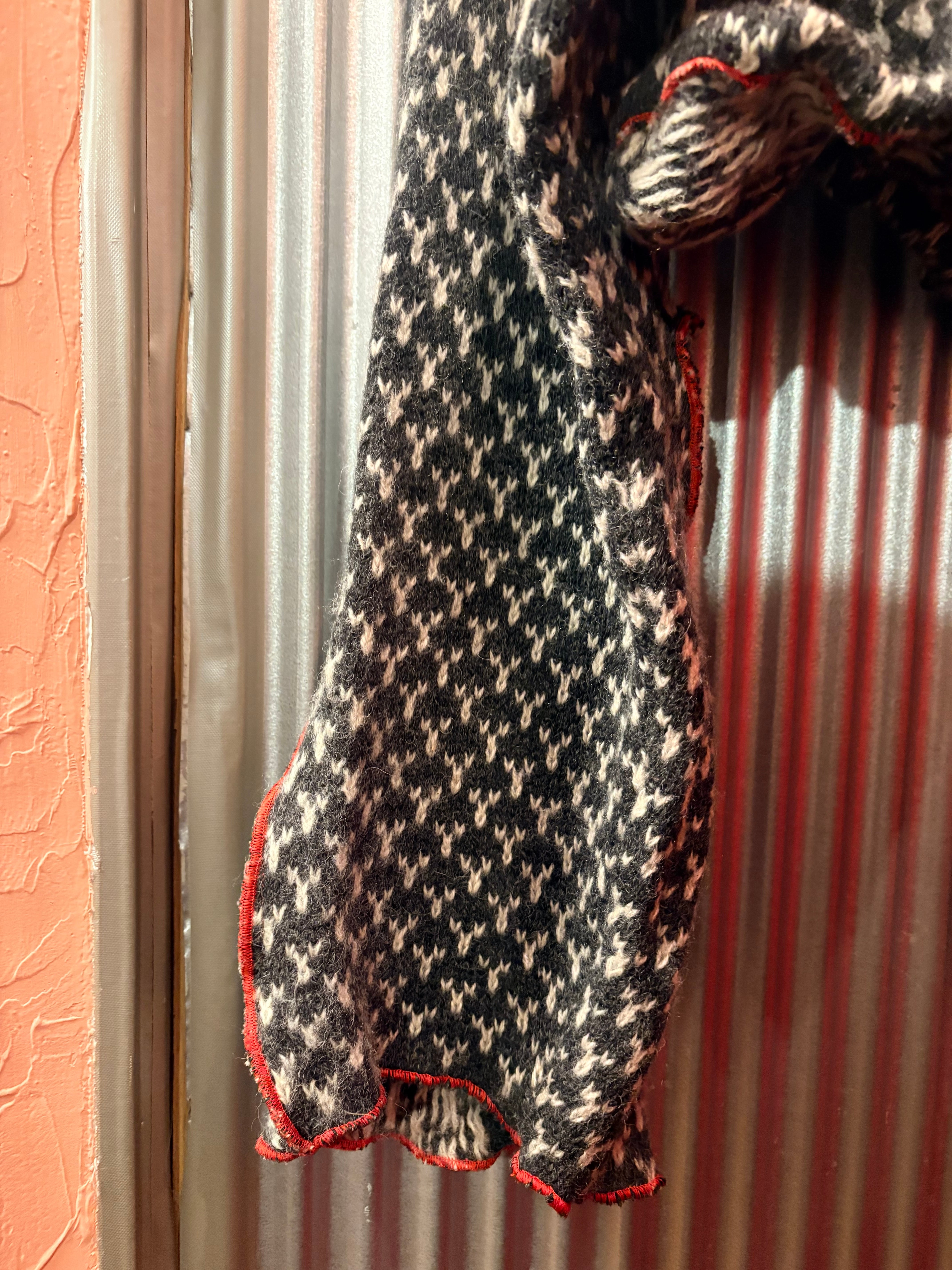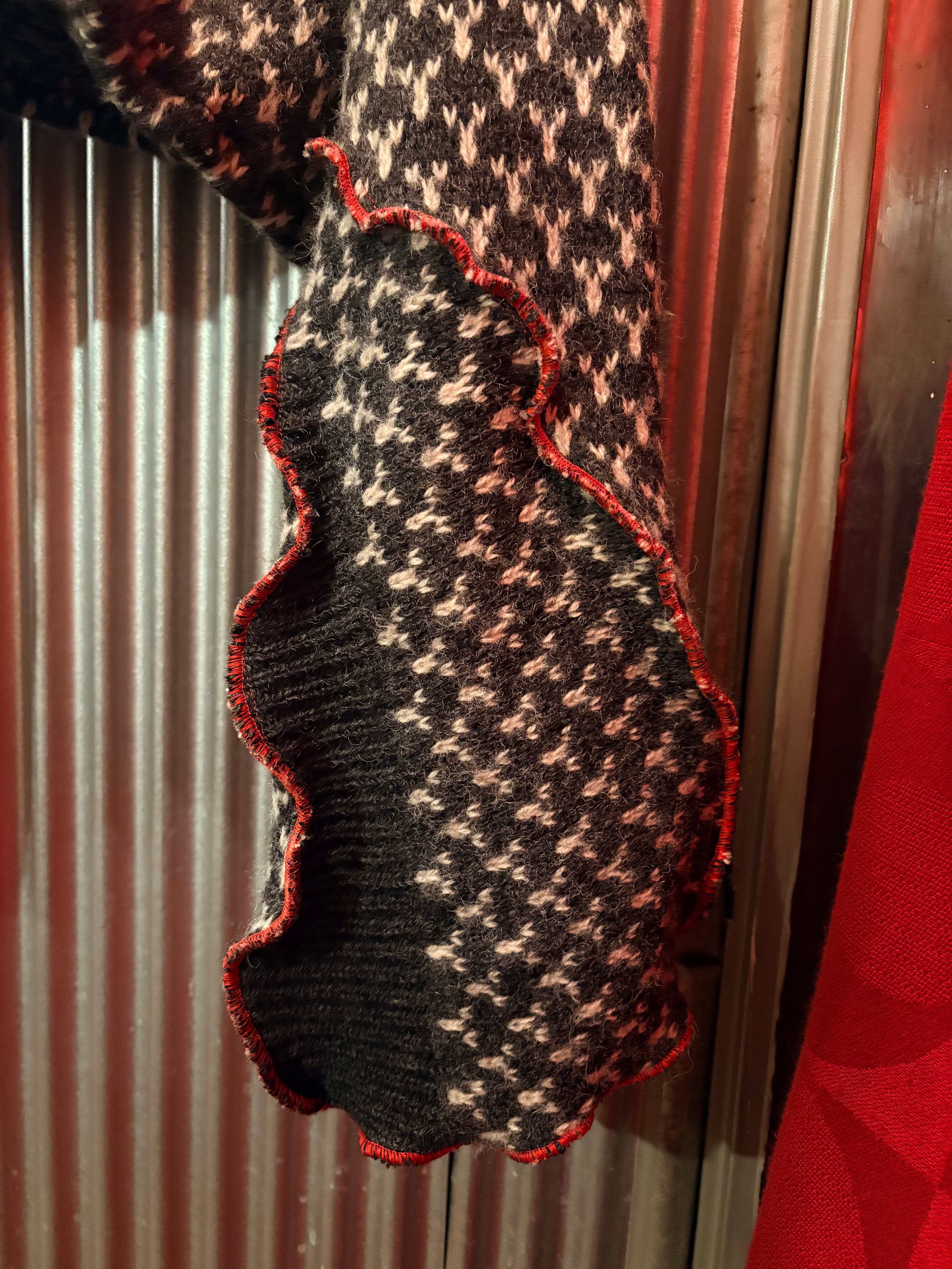 袖のステッチは、ボディのニットのカラーに合わせた赤が◎