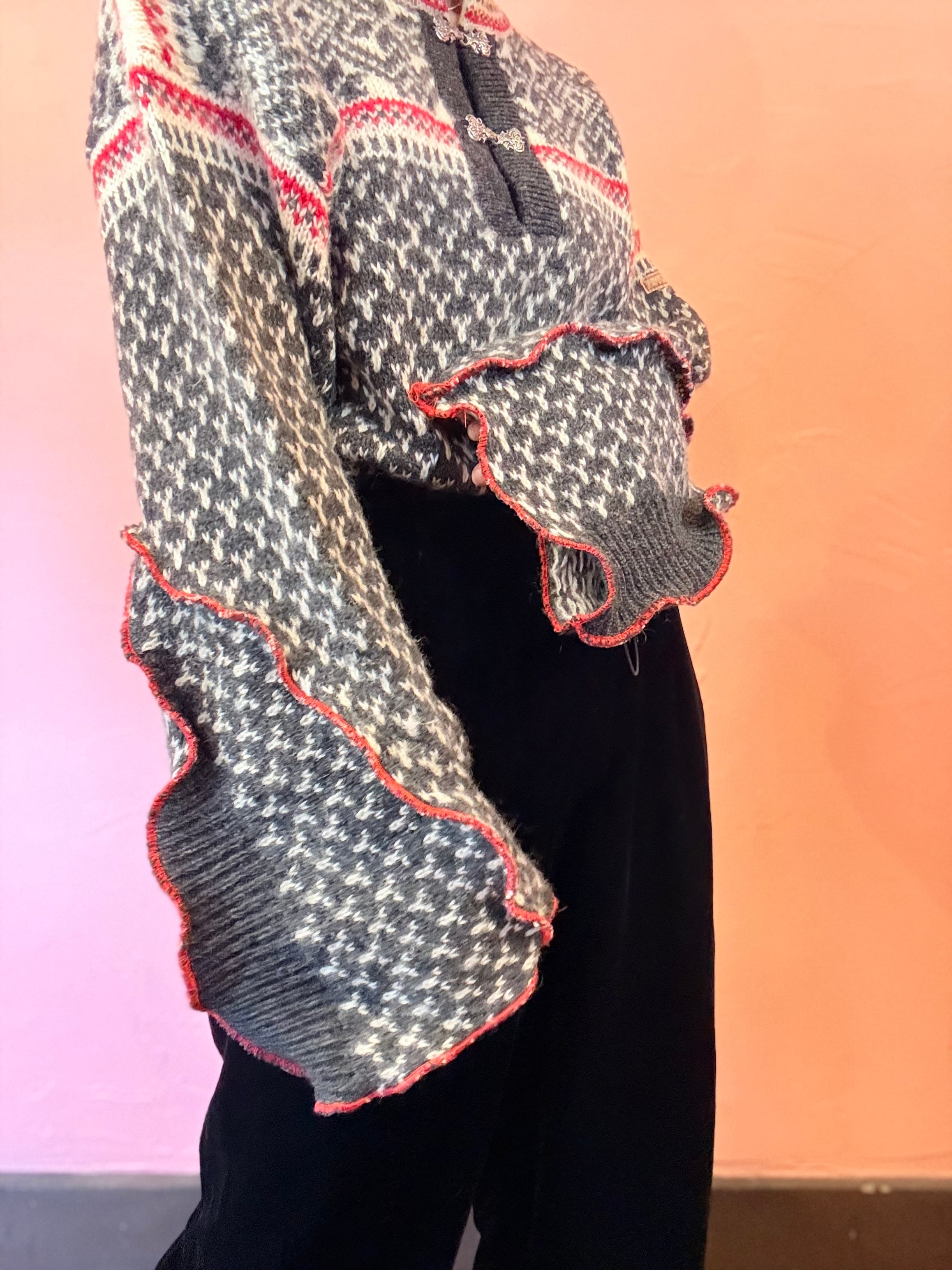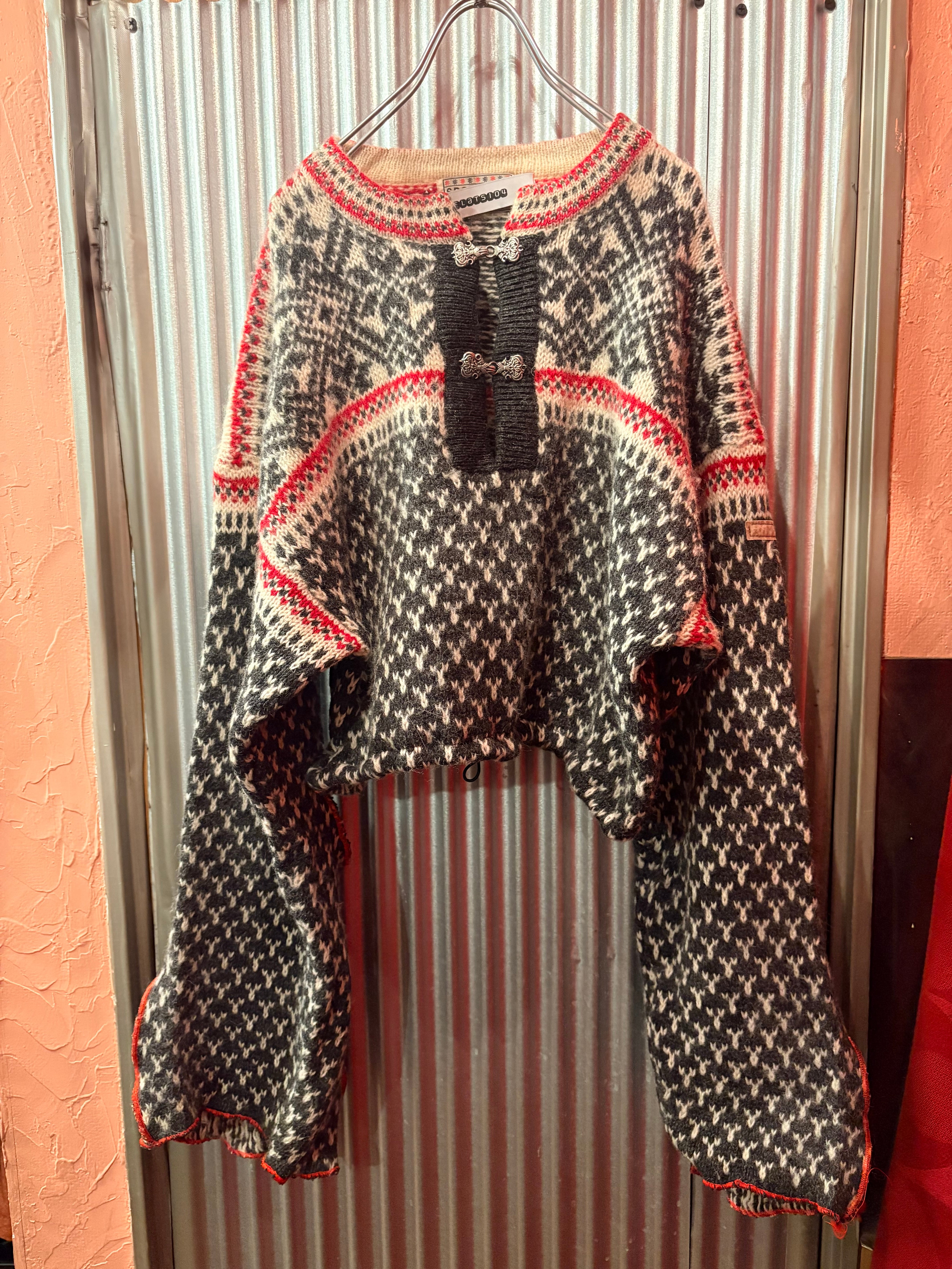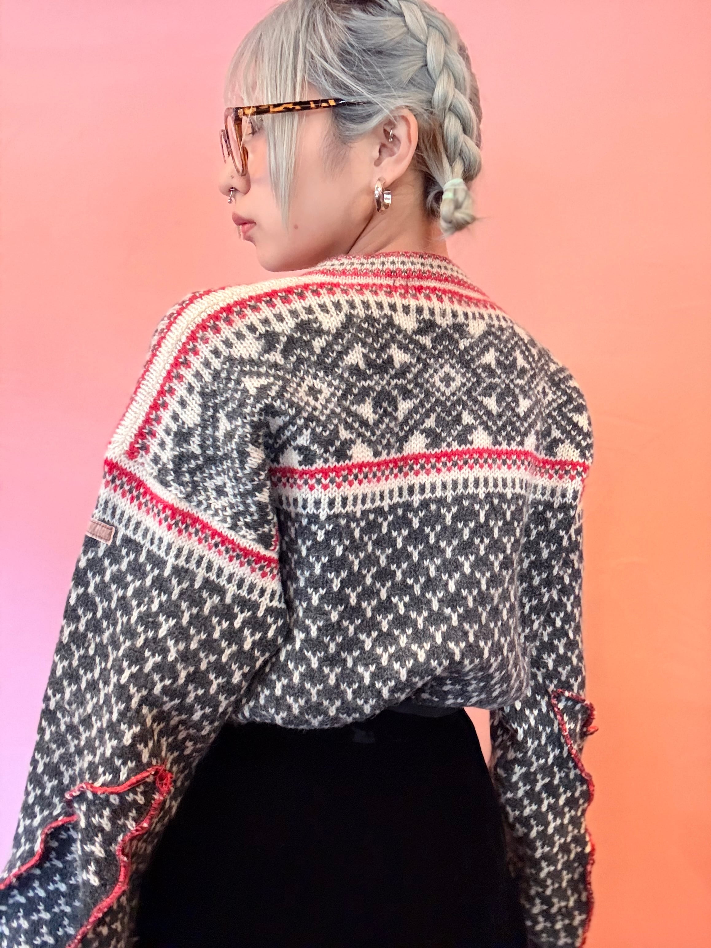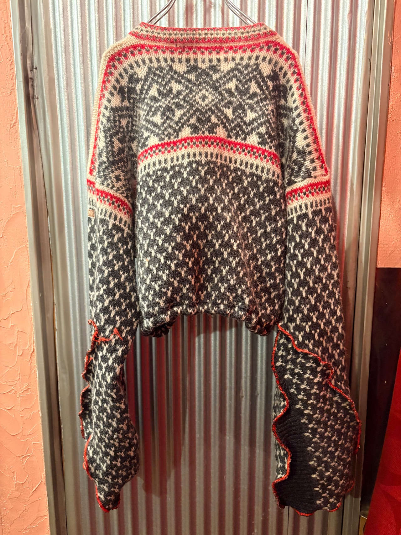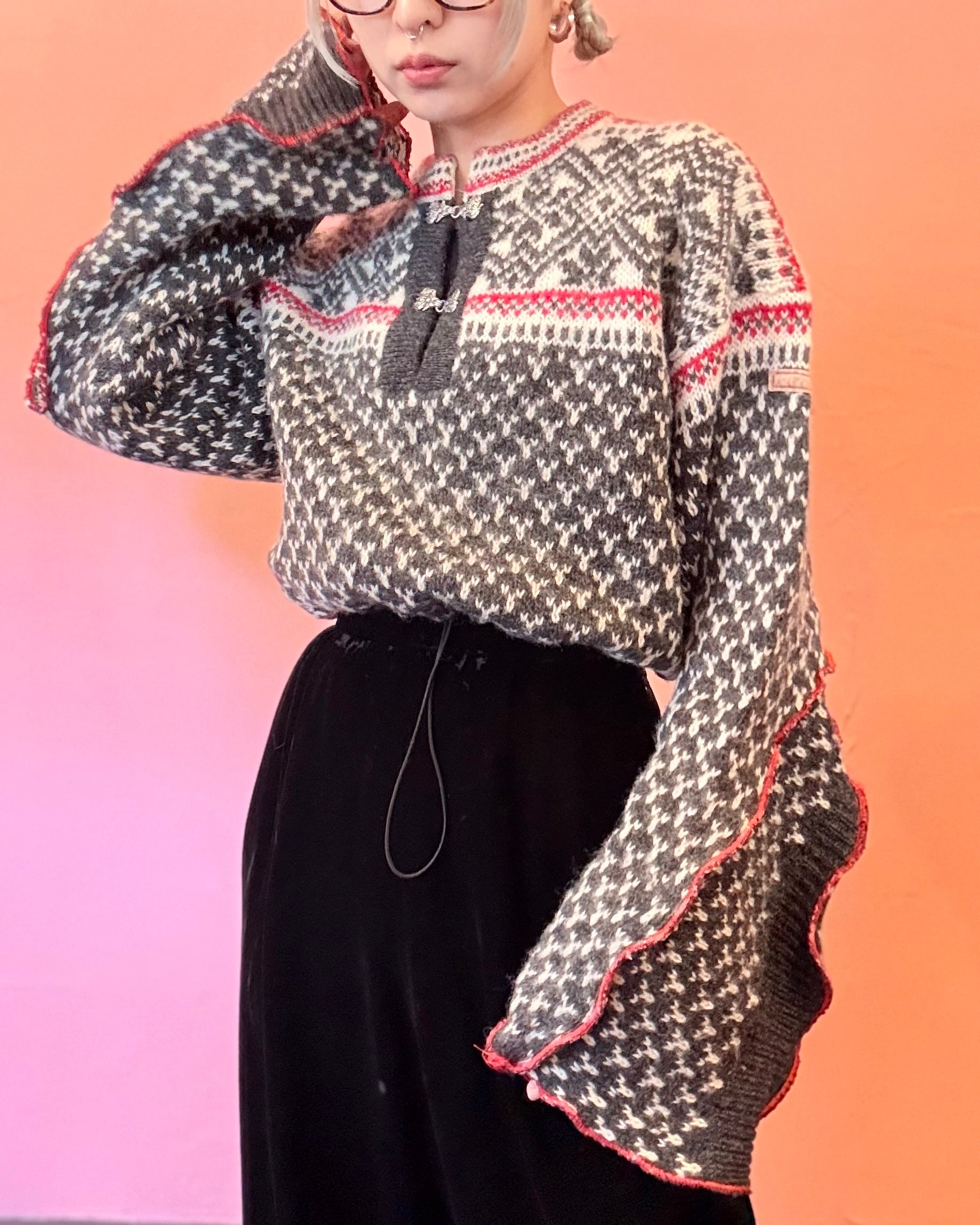 クロップド丈とワイドスリーブで、今っぽいシルエットに再構築されたおすすめのリメイクアイテムです。