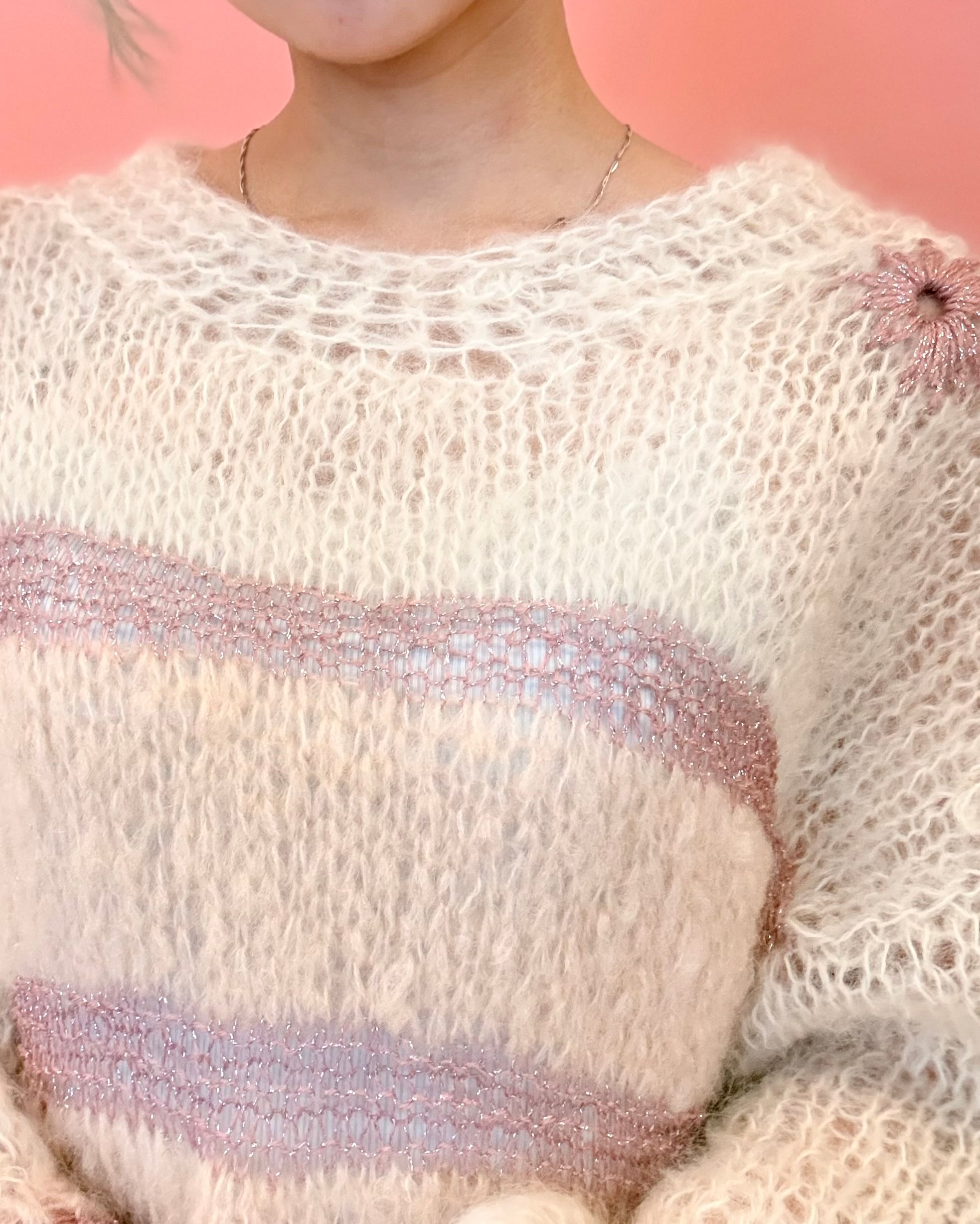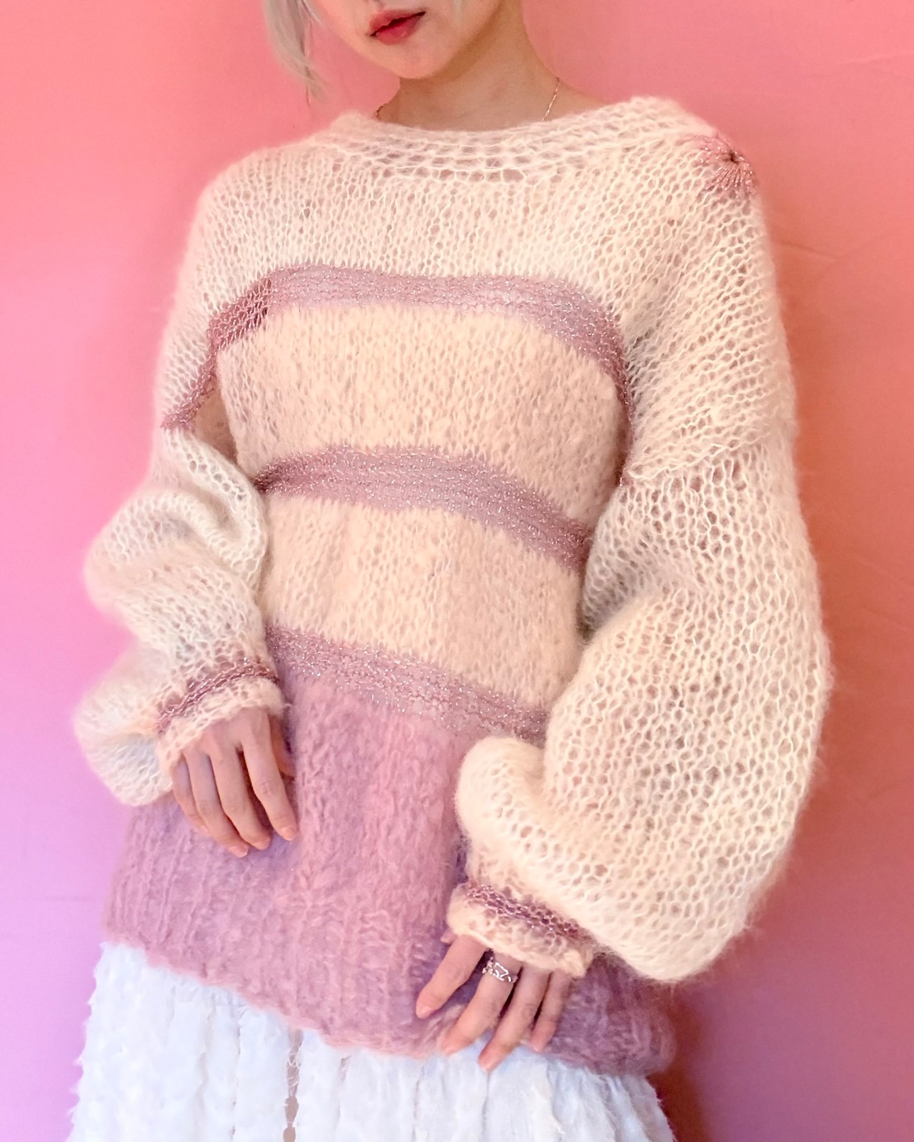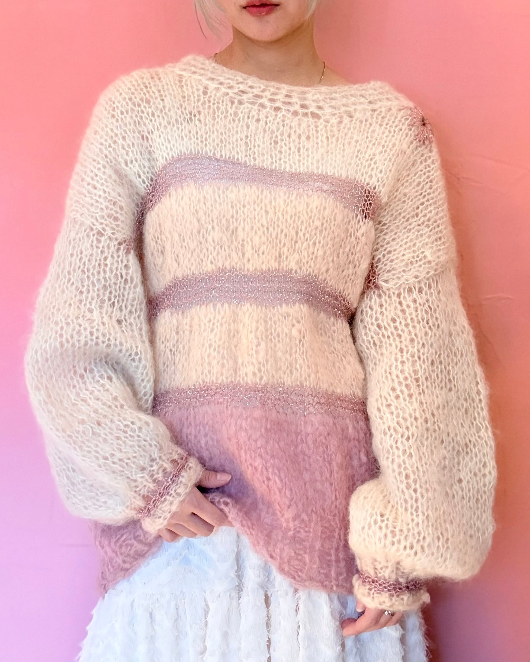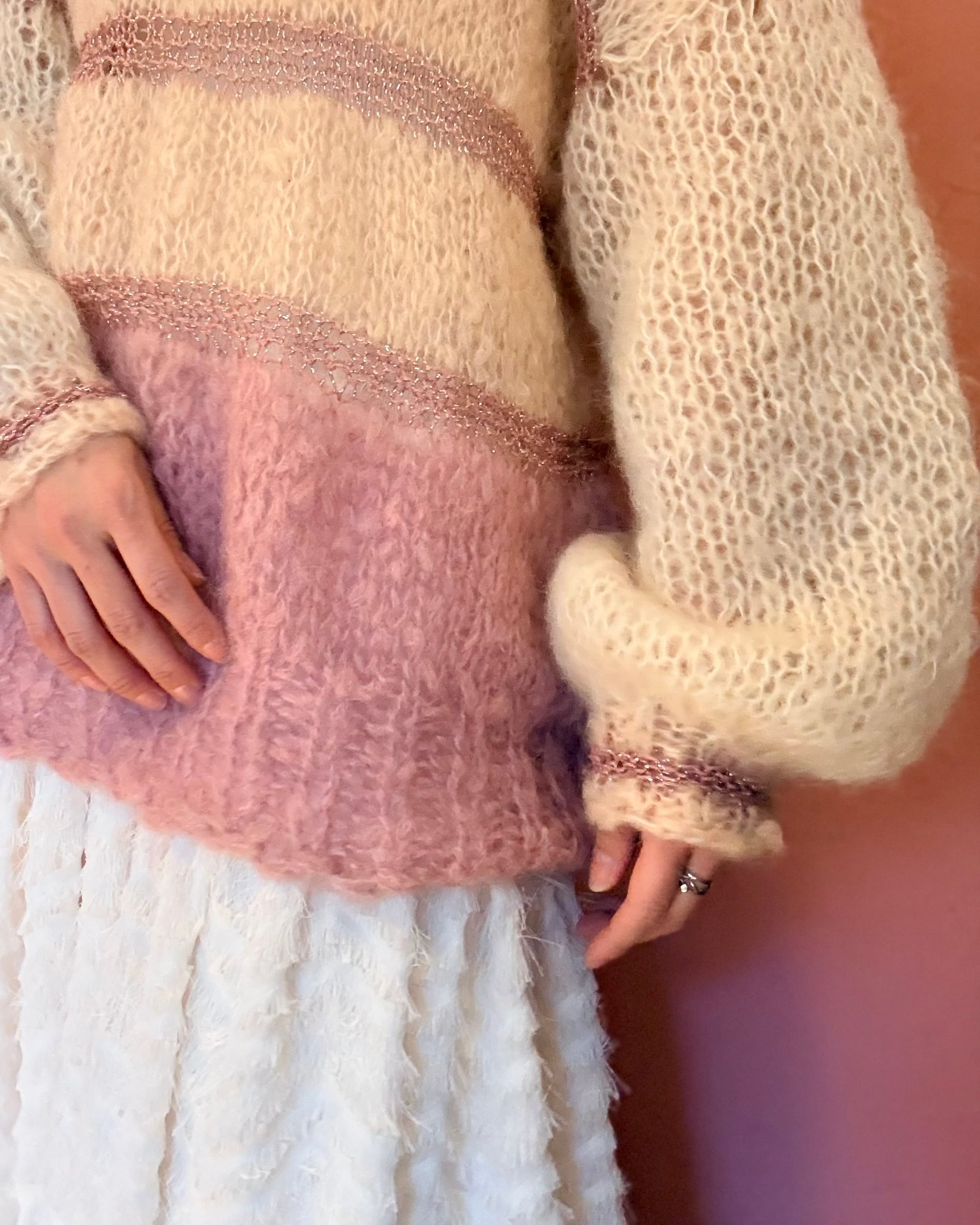 ピンクラメ入りニットで編まれたボーダーデザインもポイント