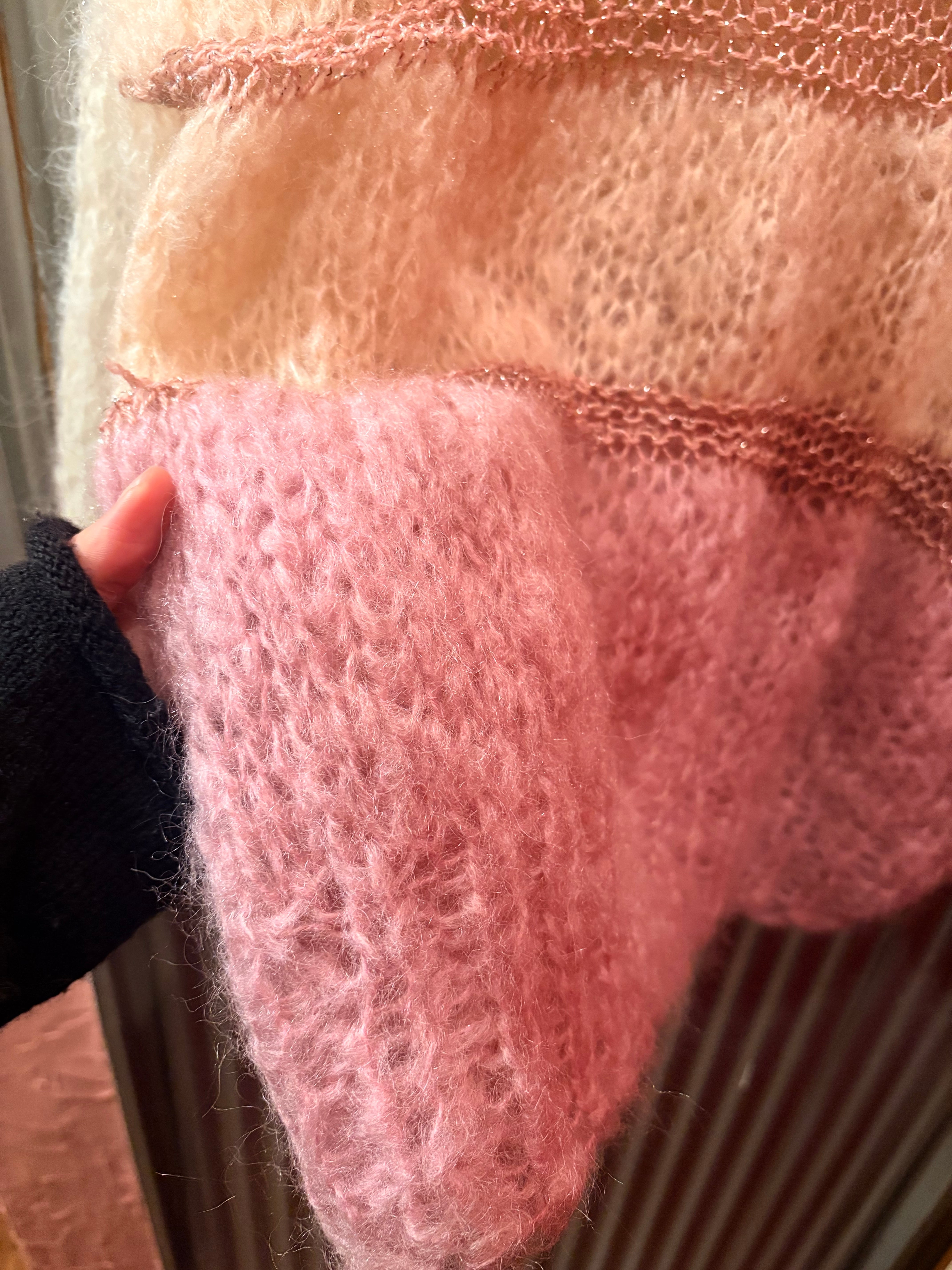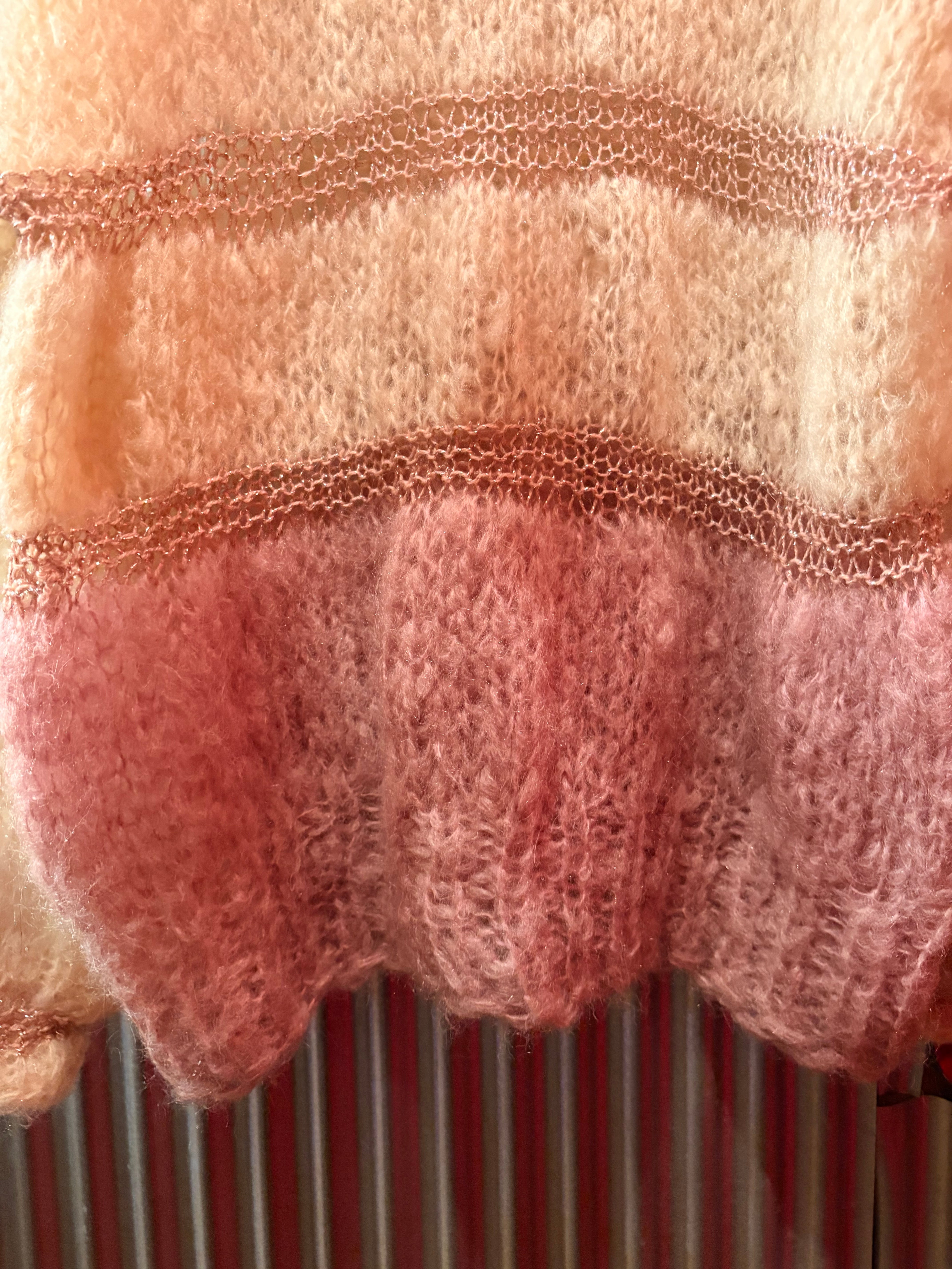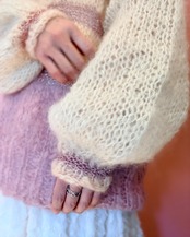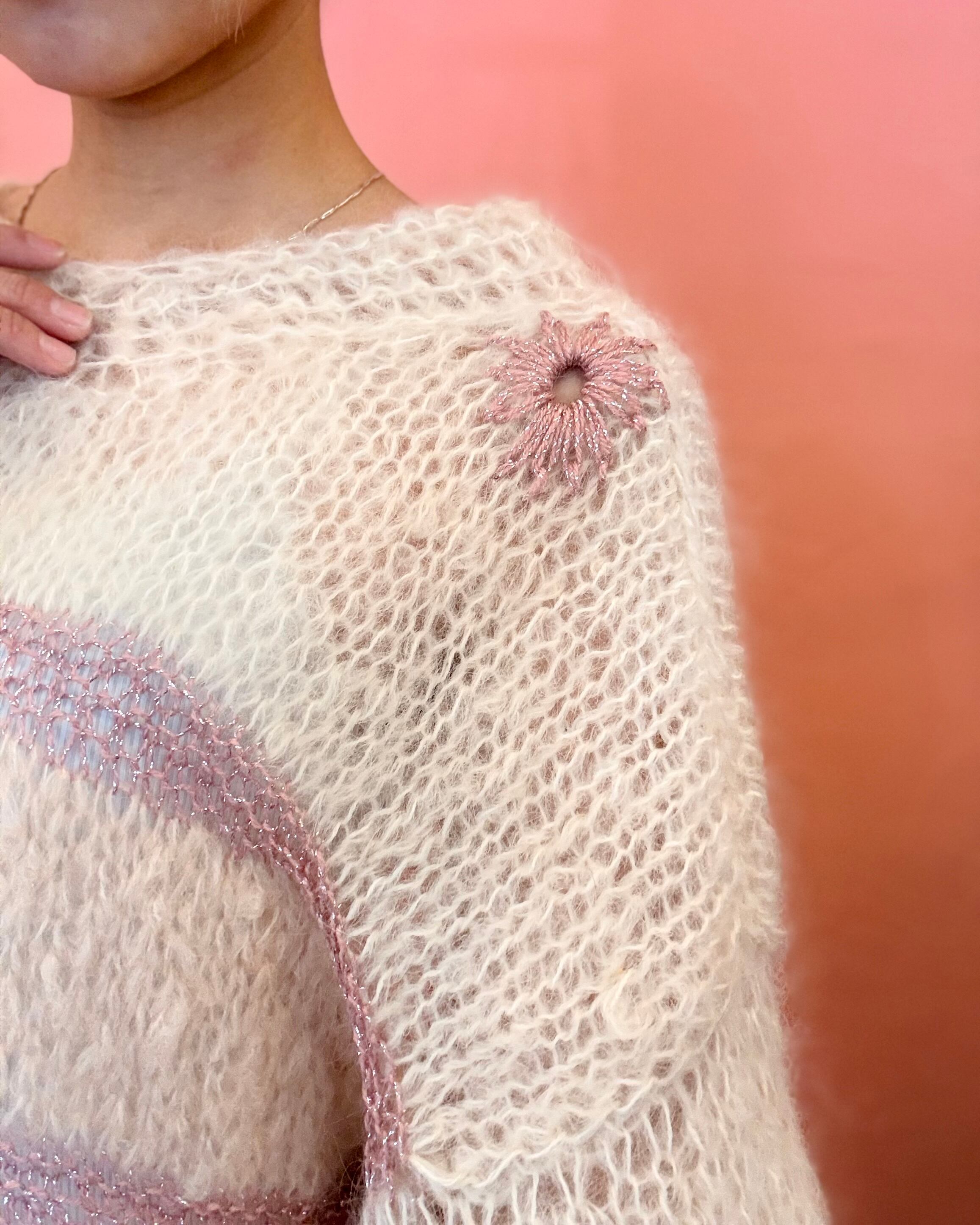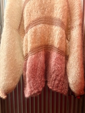 ピンクラメ入りニットで編まれたボーダーデザインもポイント