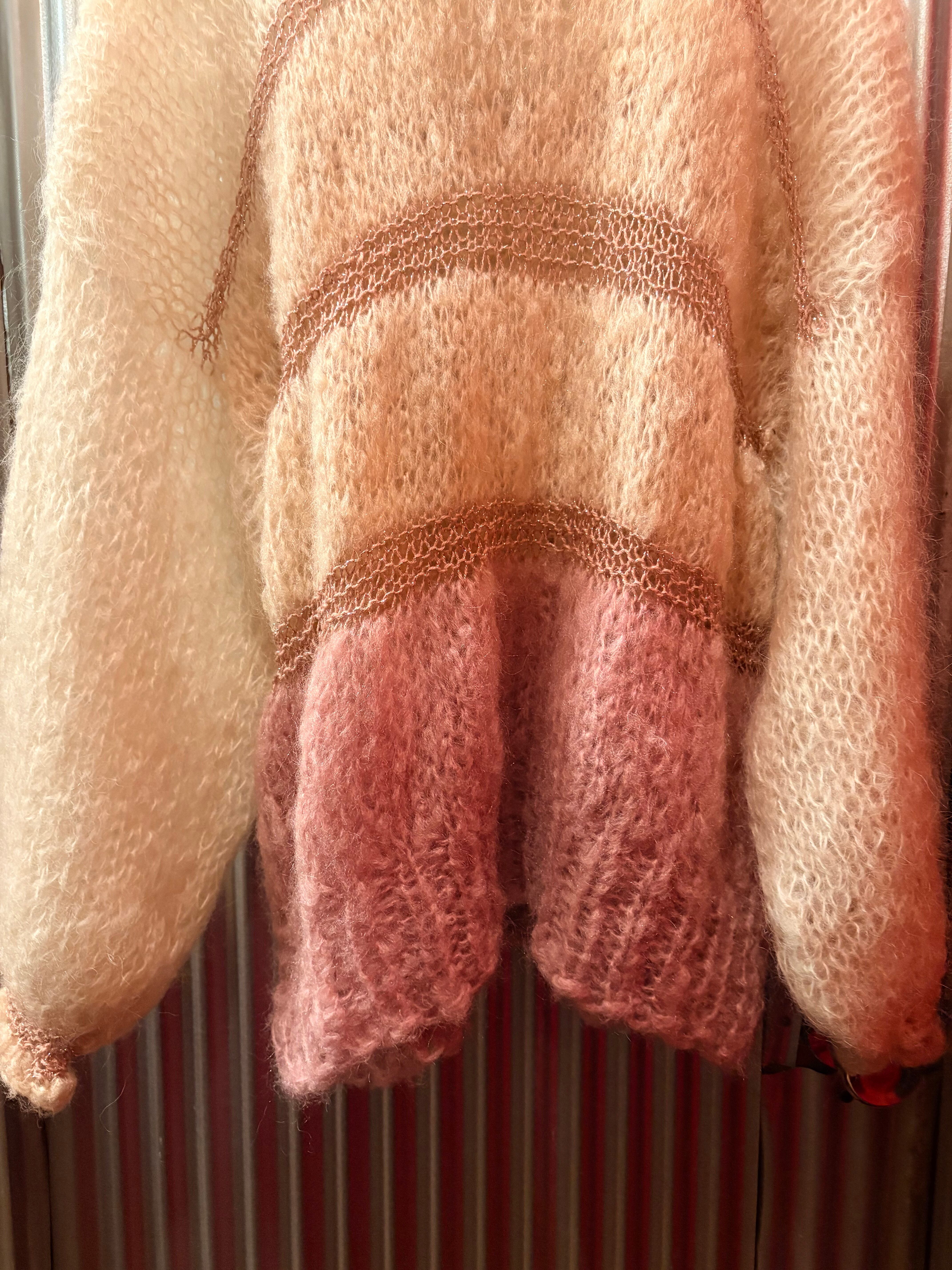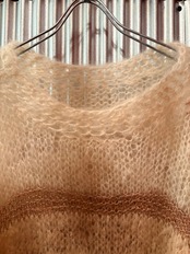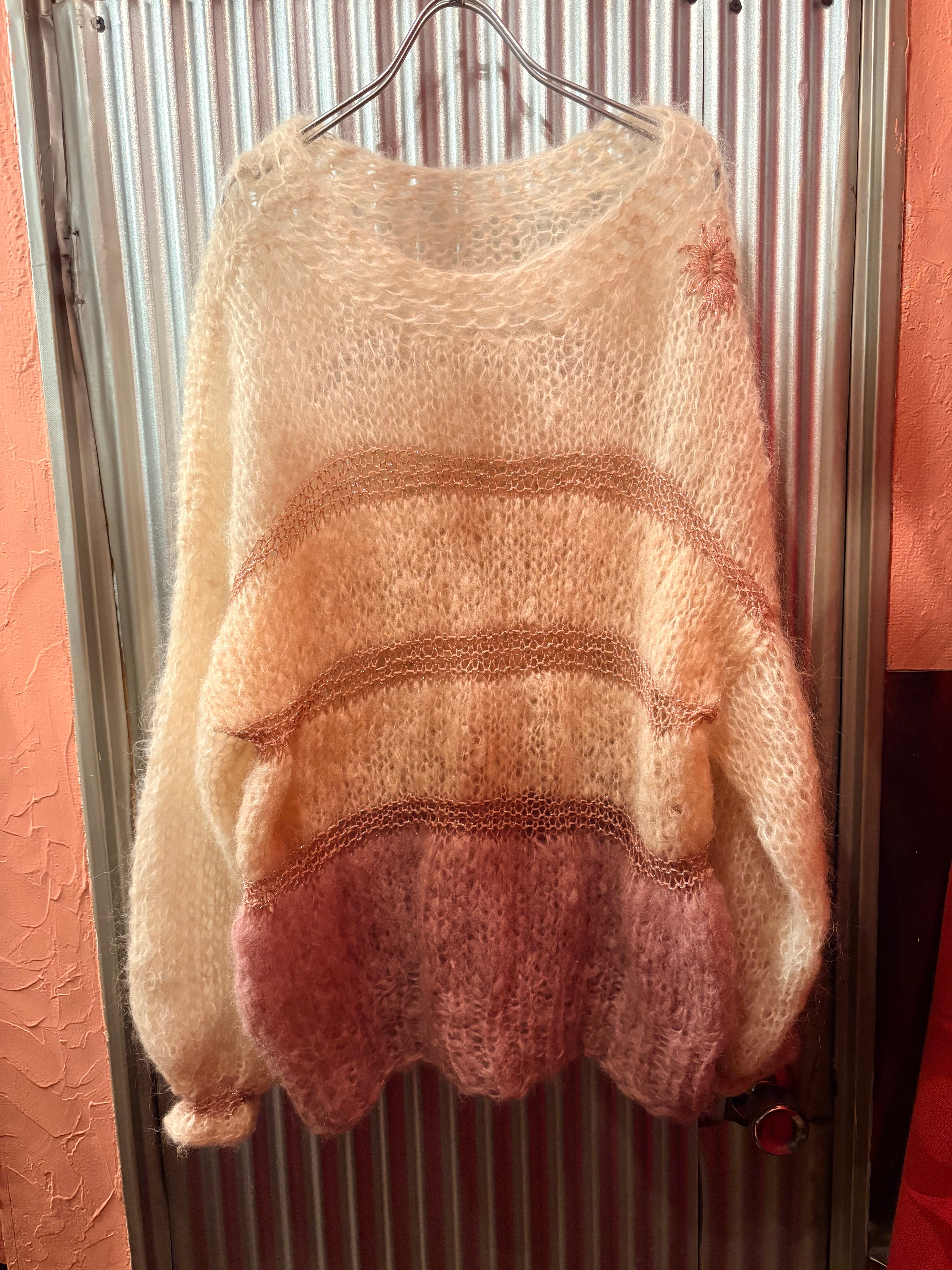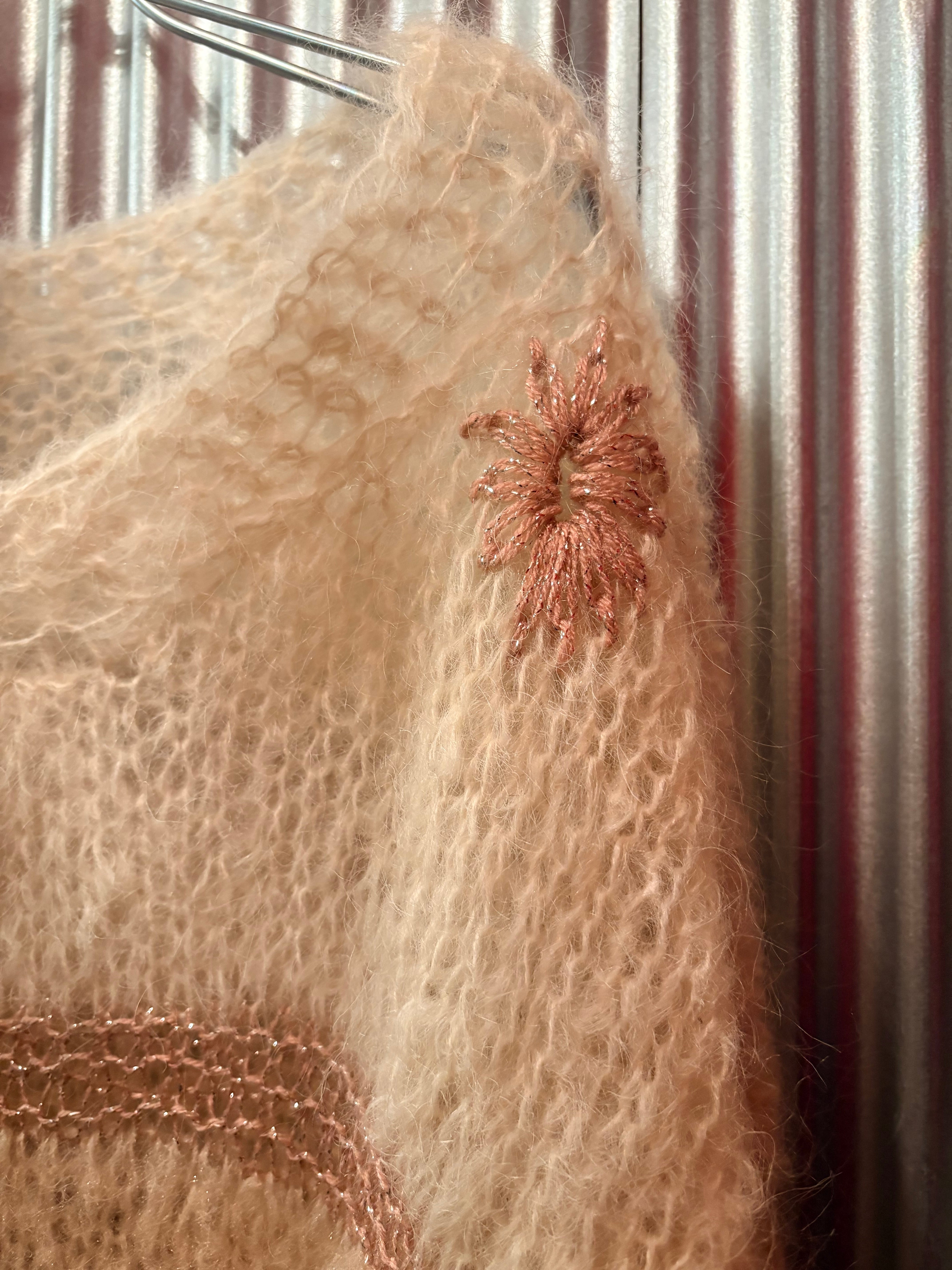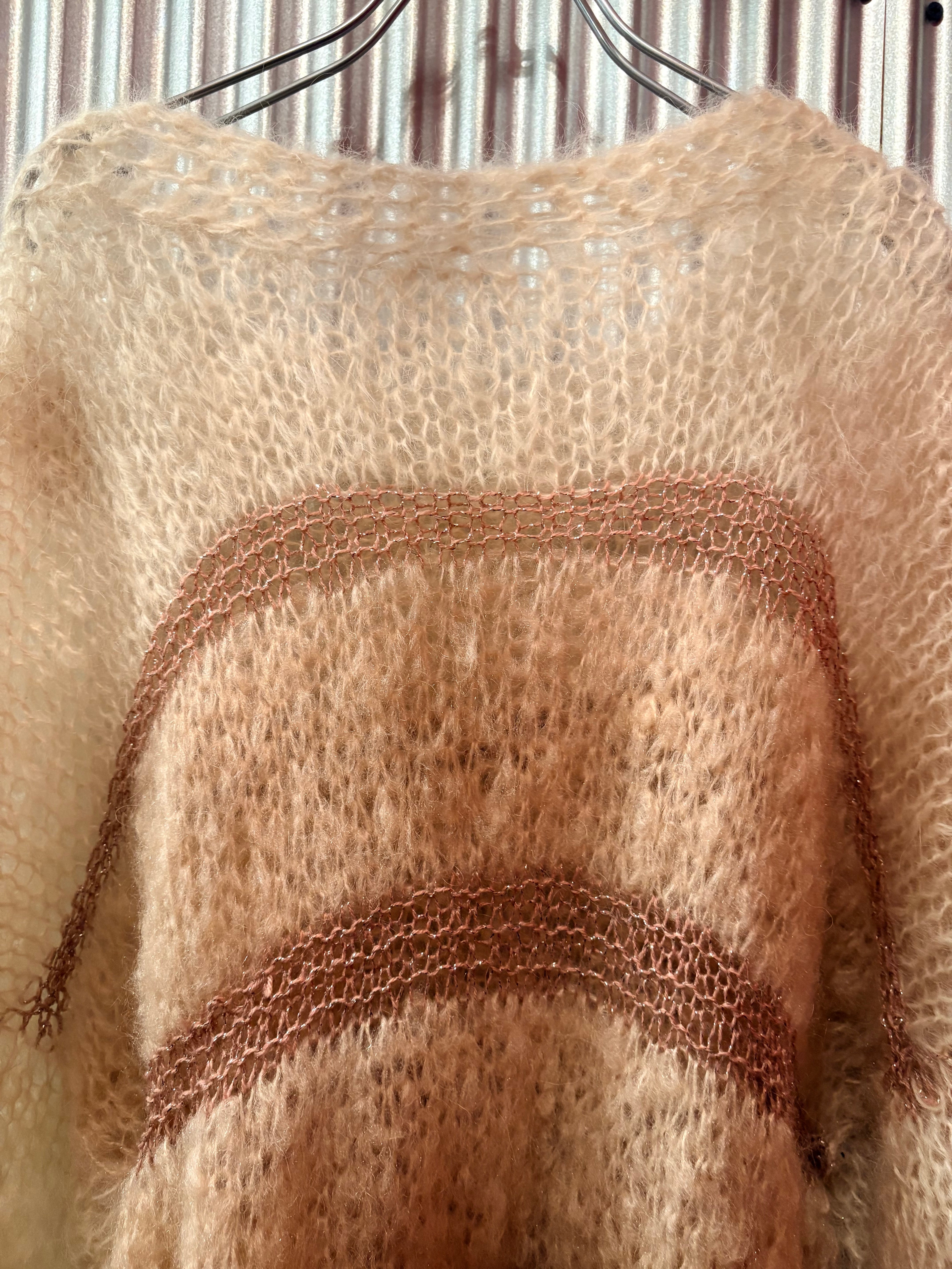 ピンクラメ入りニットで編まれたボーダーデザインもポイント