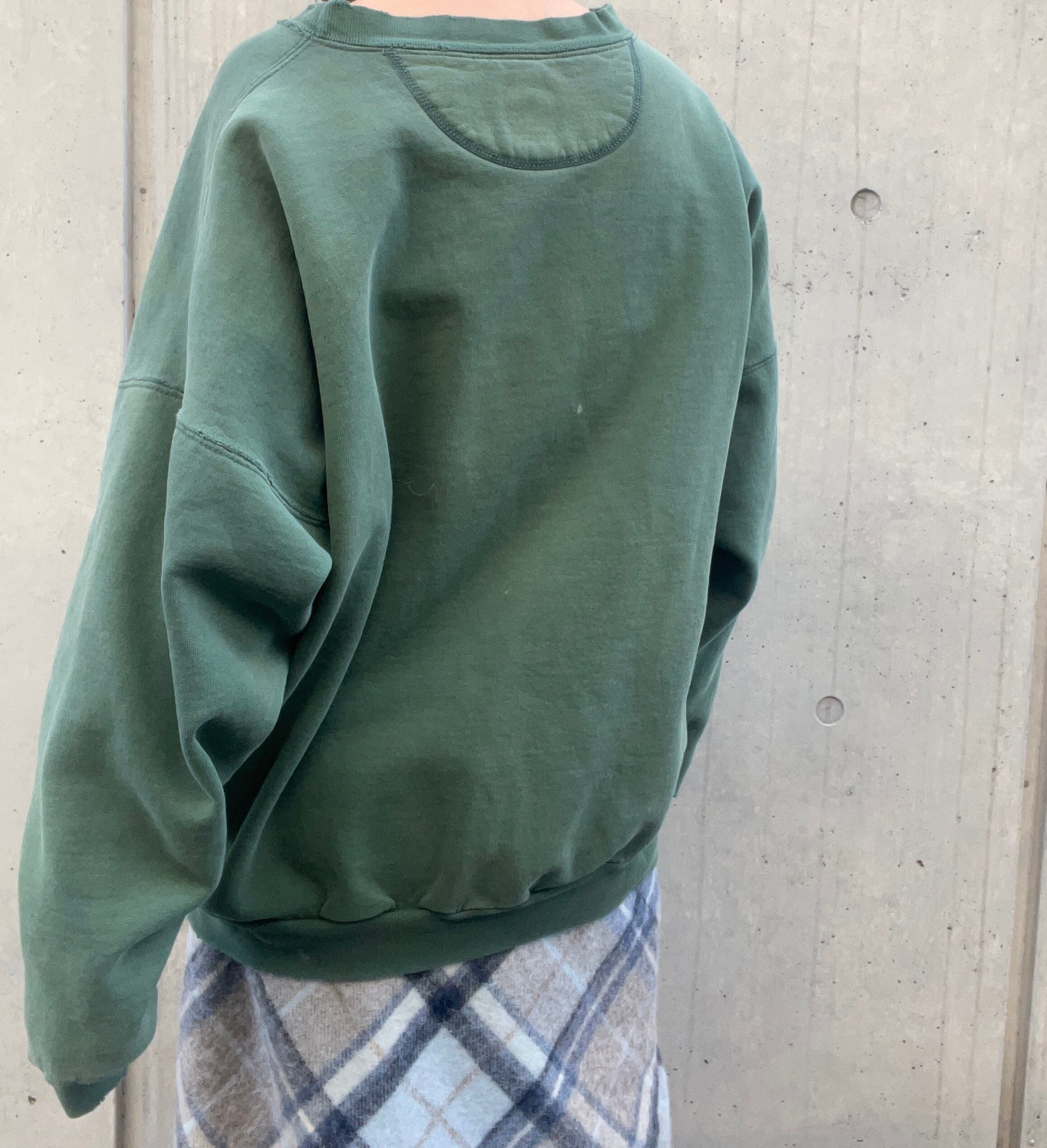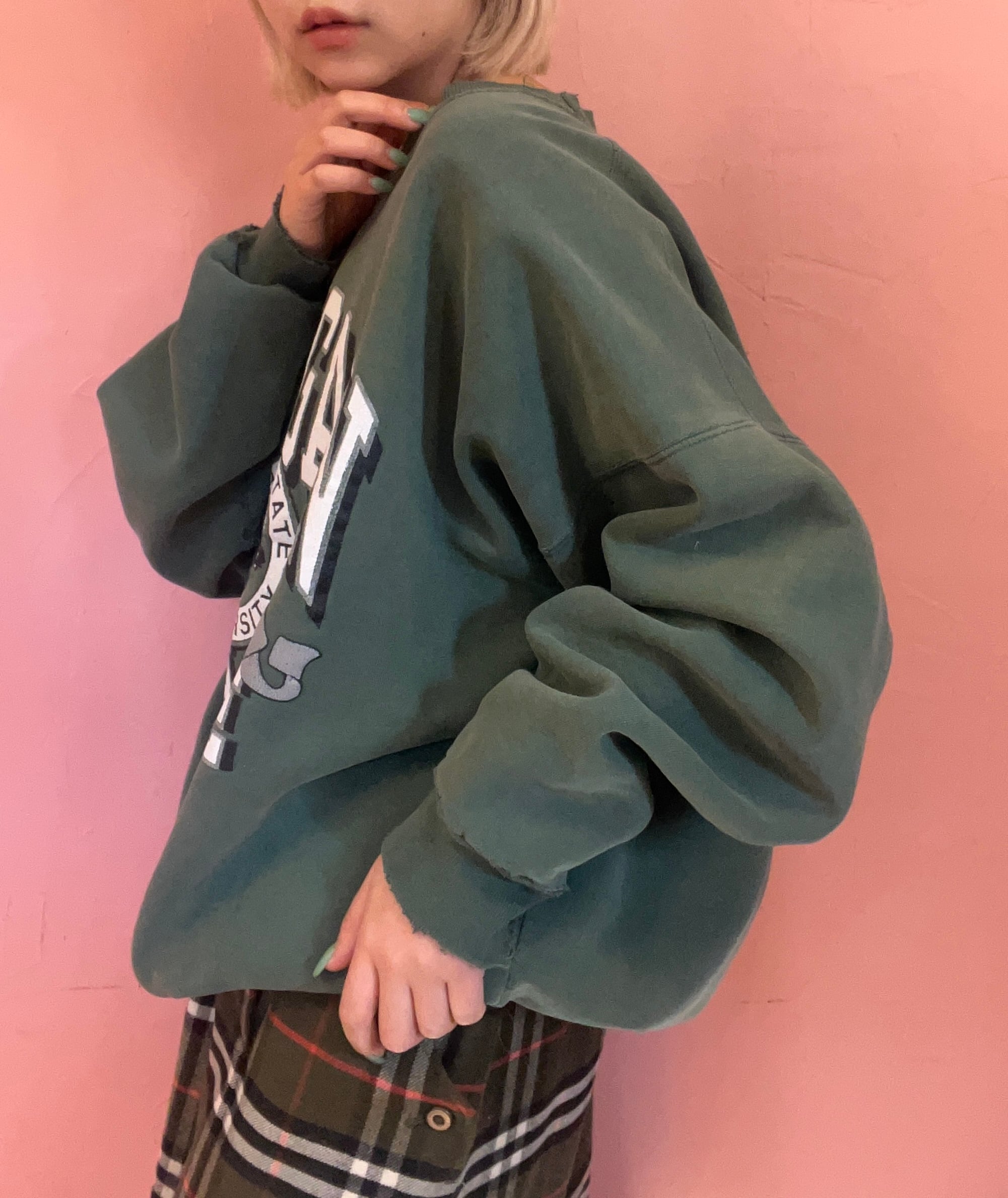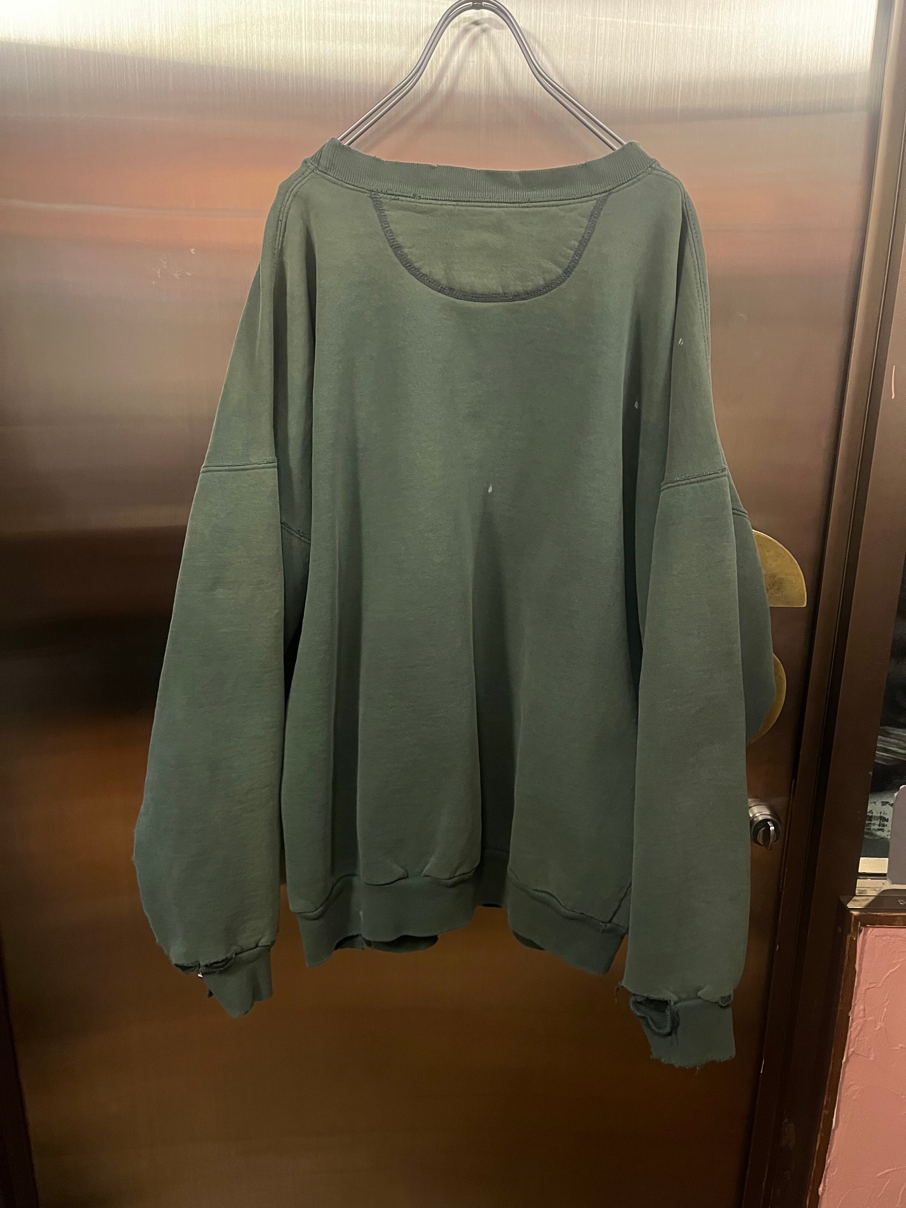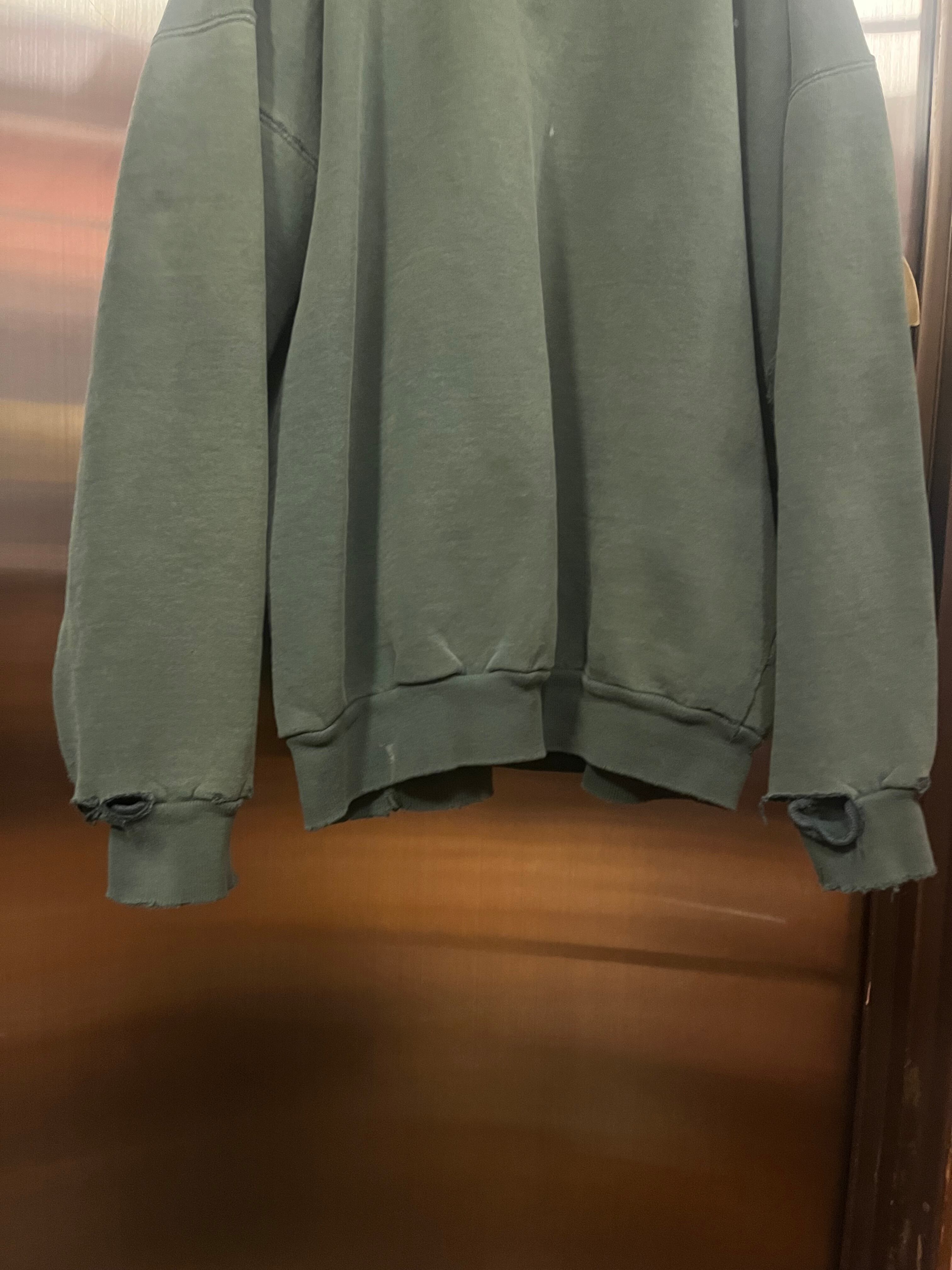 フェードがかったグリーンに、オーバーサイズ、いいダメージ具合