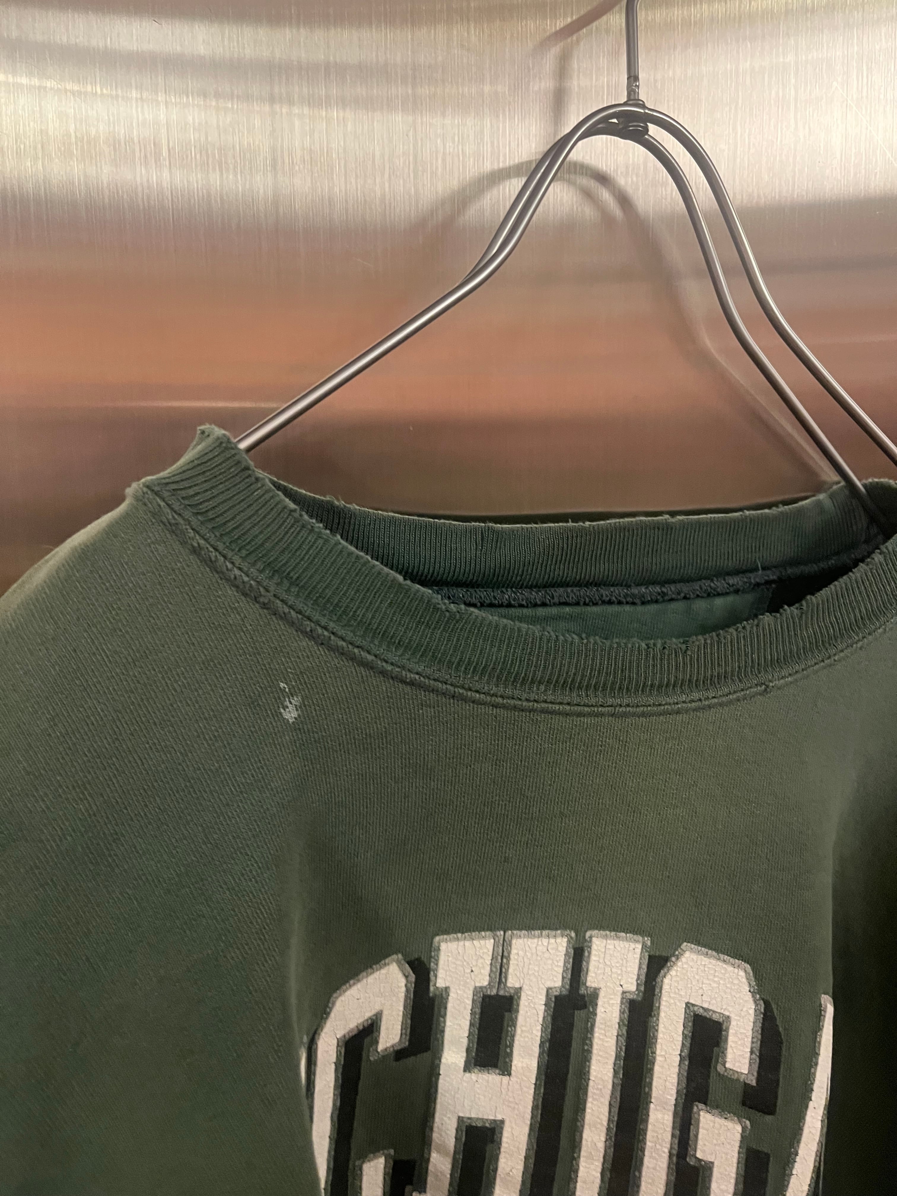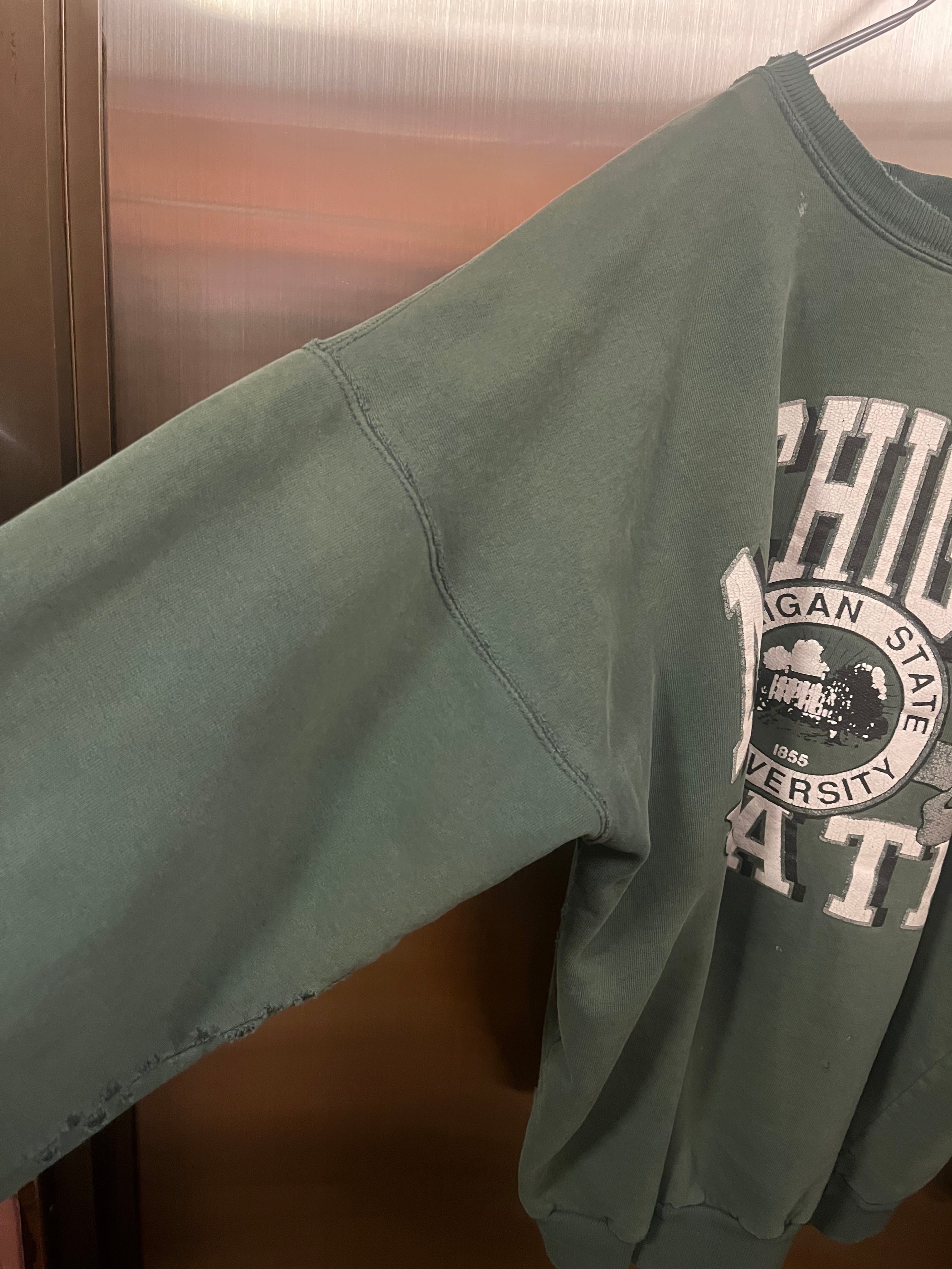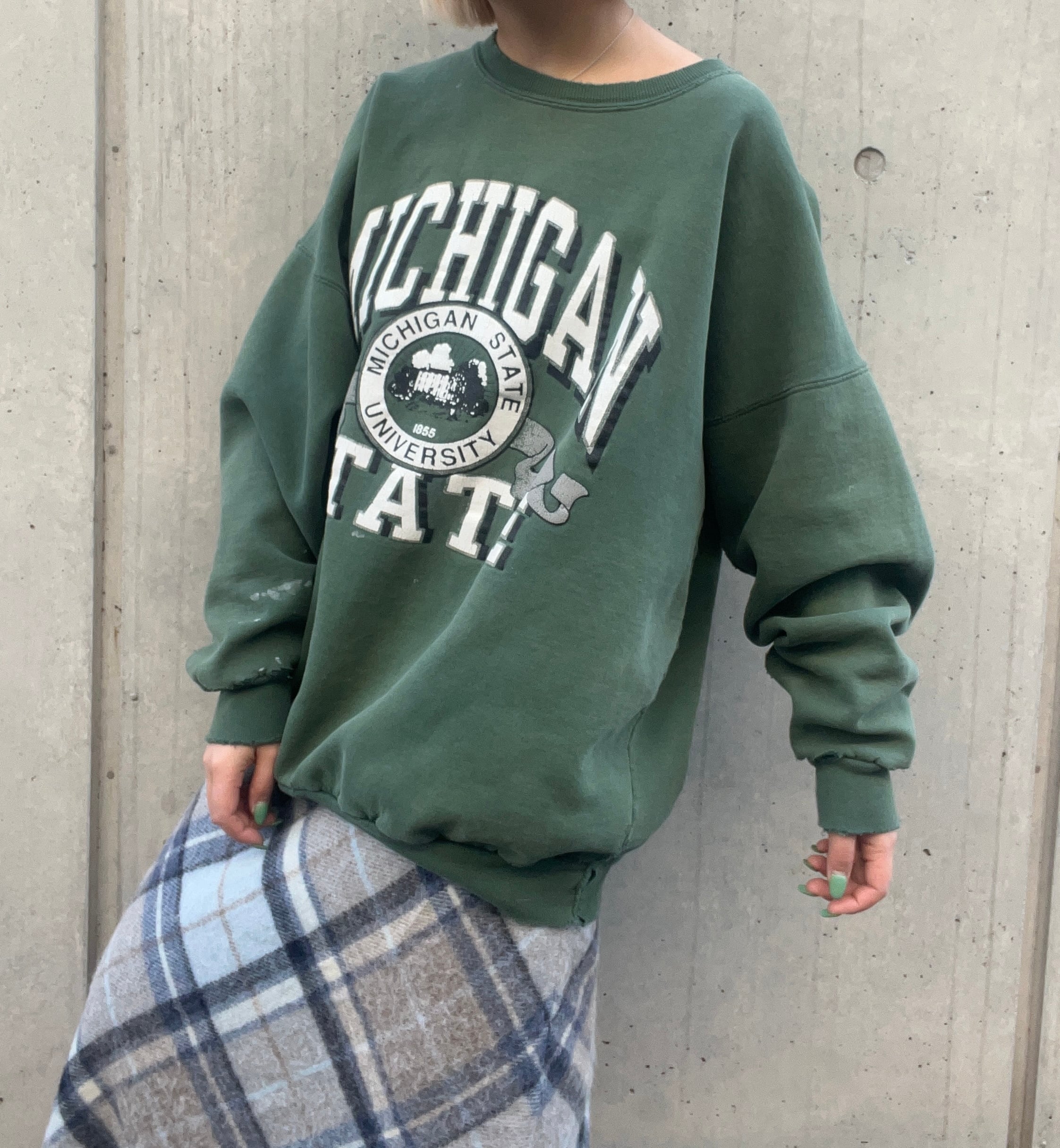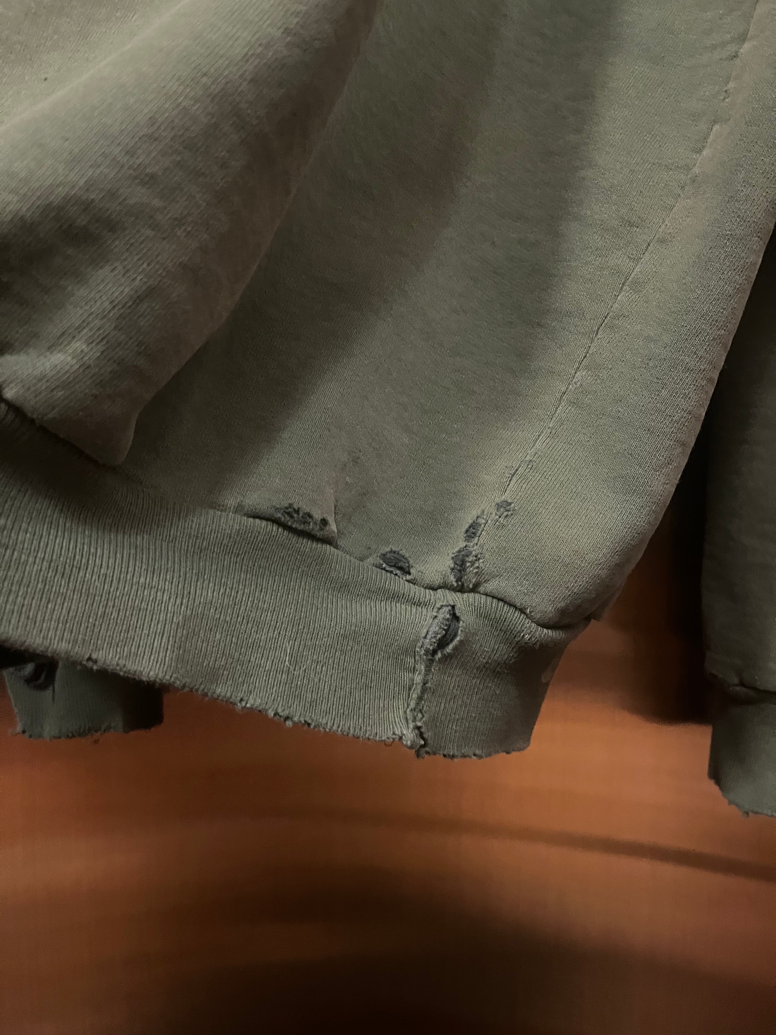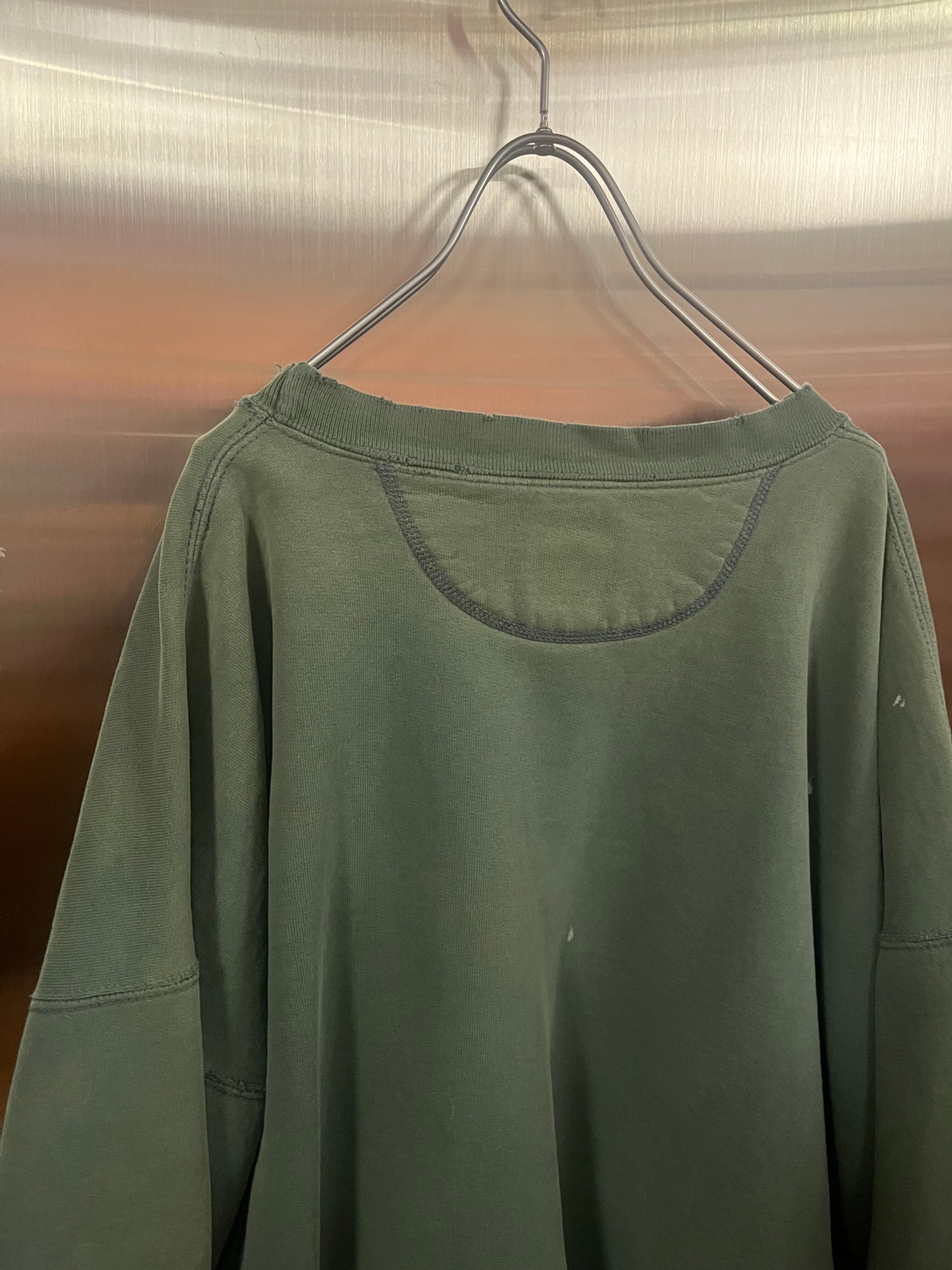 フェードがかったグリーンに、オーバーサイズ、いいダメージ具合