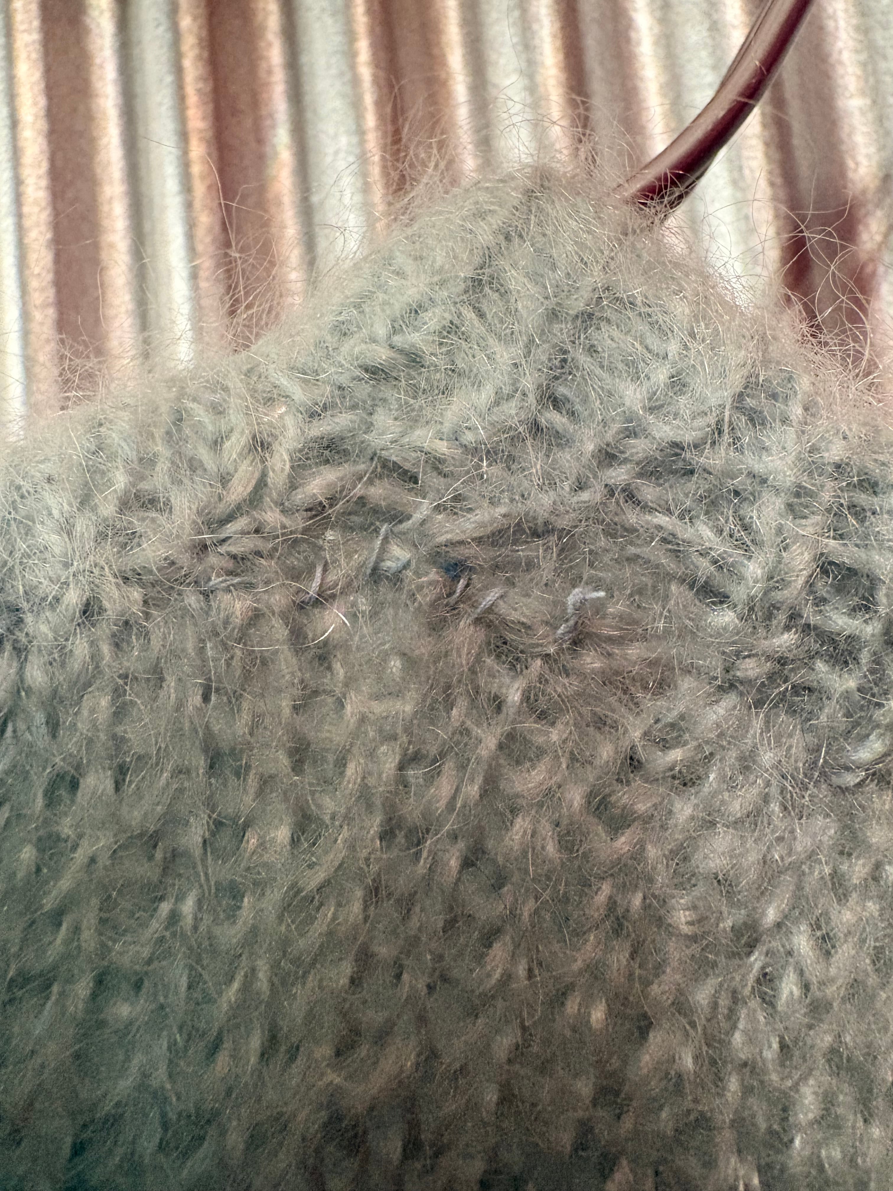 左肩にほつれの修繕跡があり、少し編み地が広がっております。