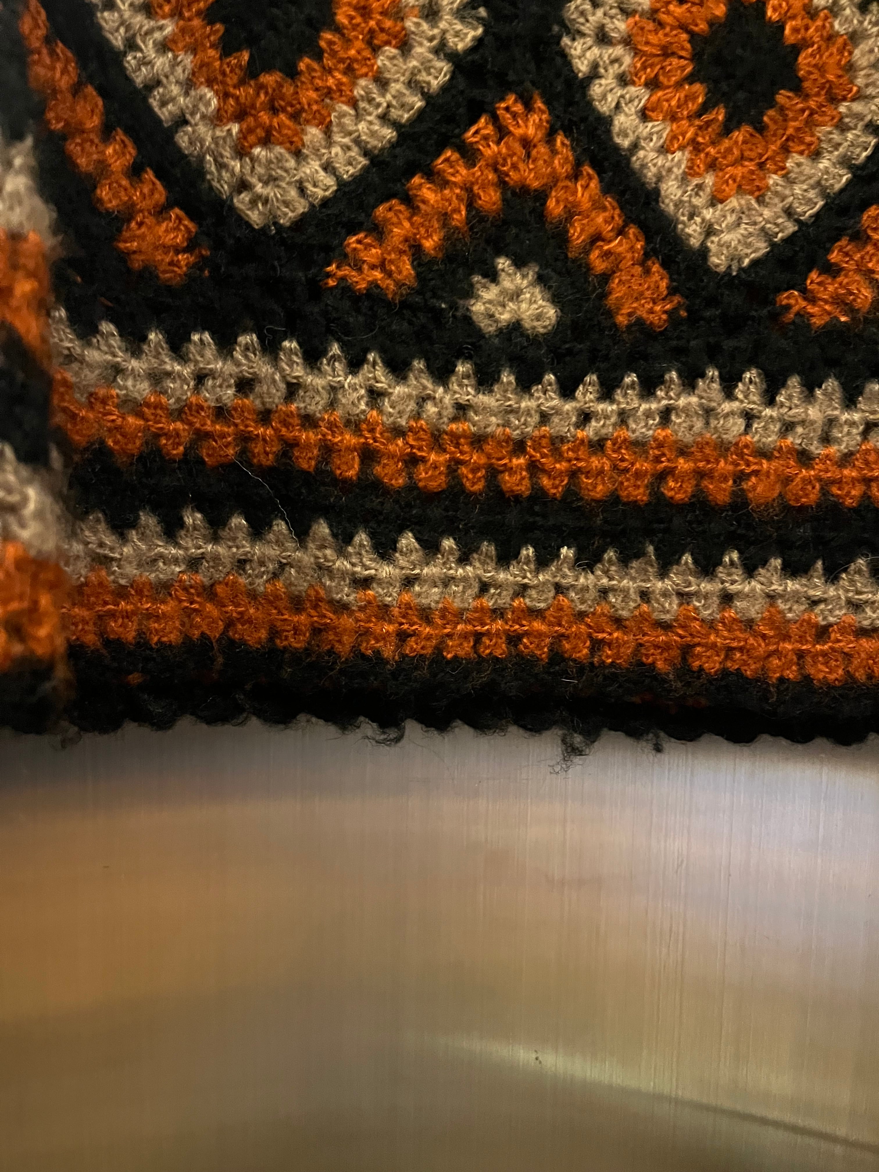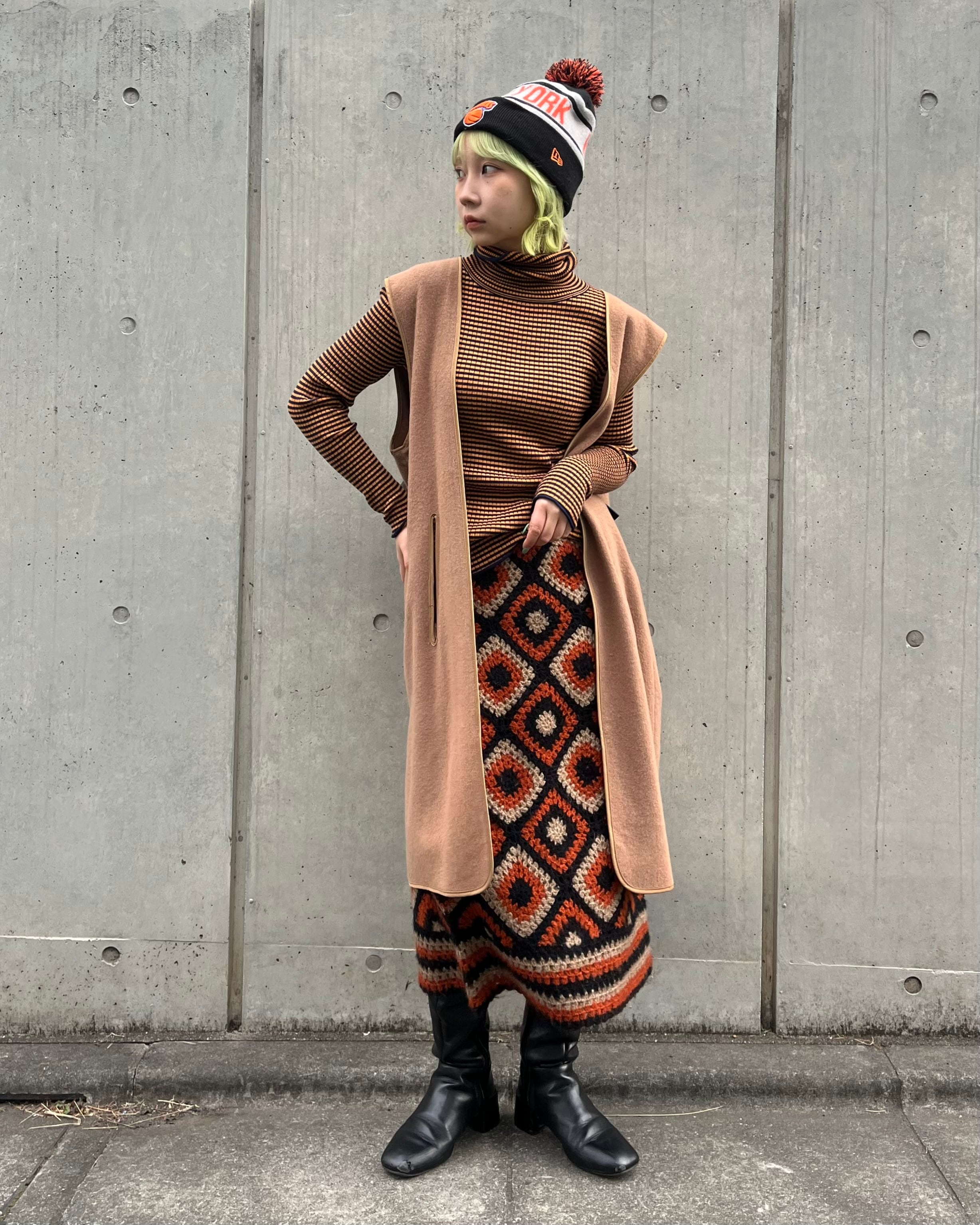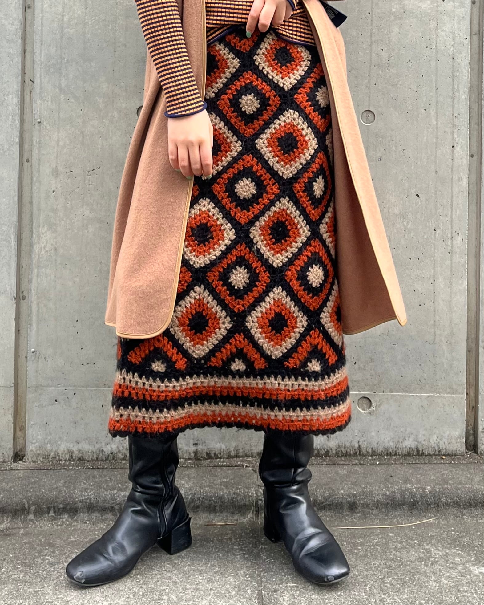 かぎ編みで仕上げた、存在感のある幾何学柄ニットスカート
