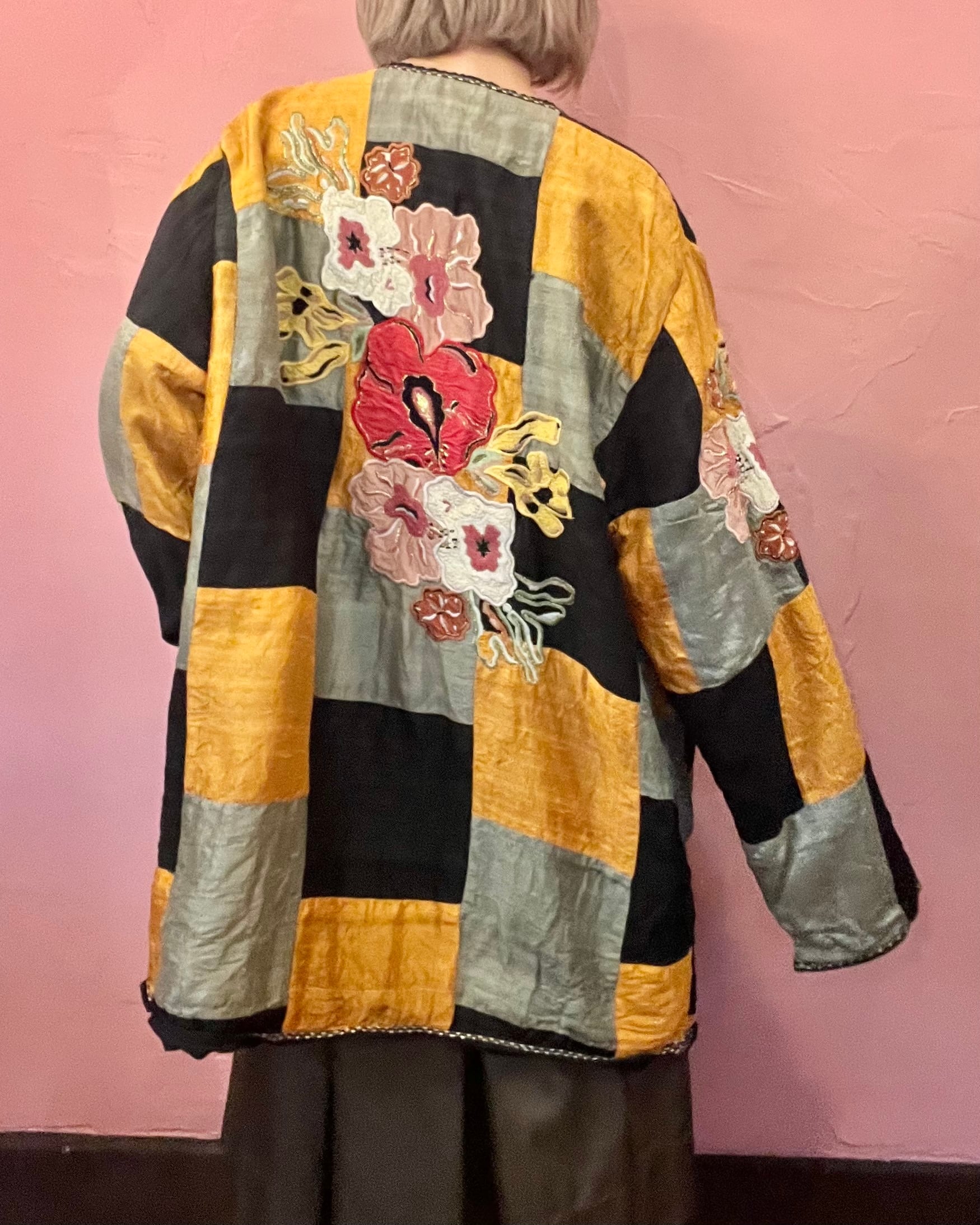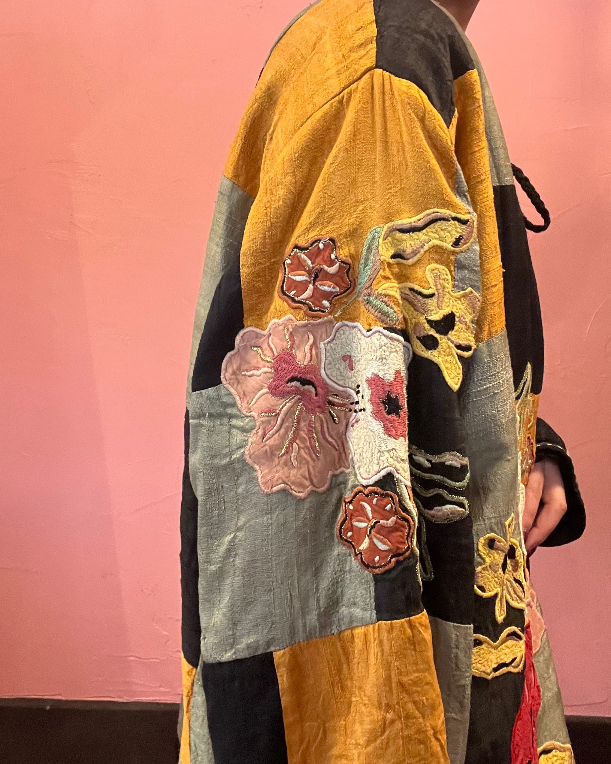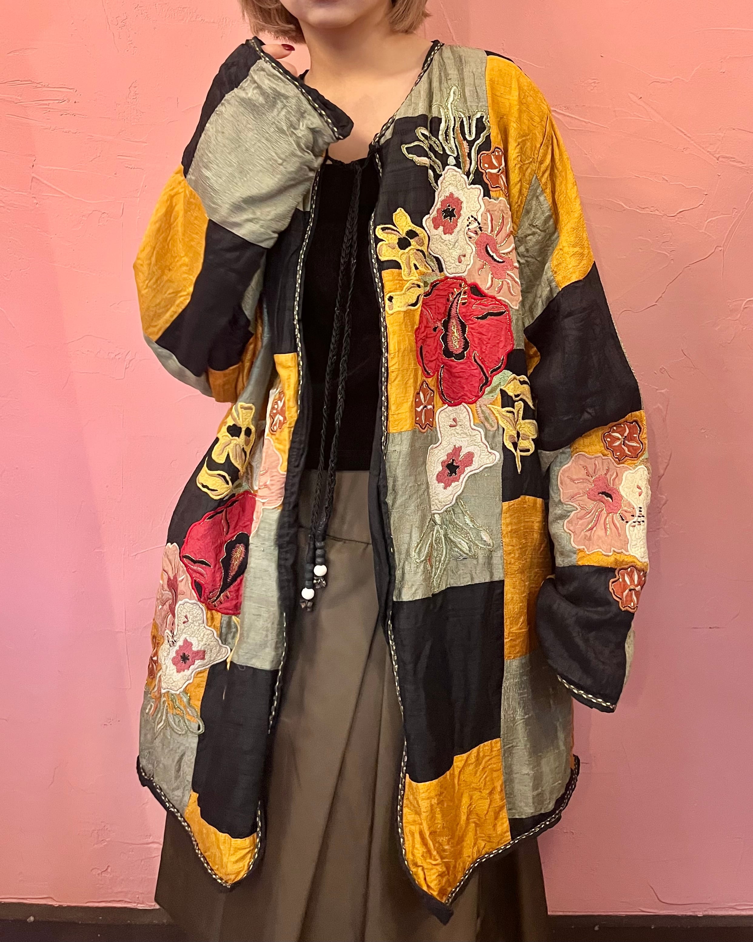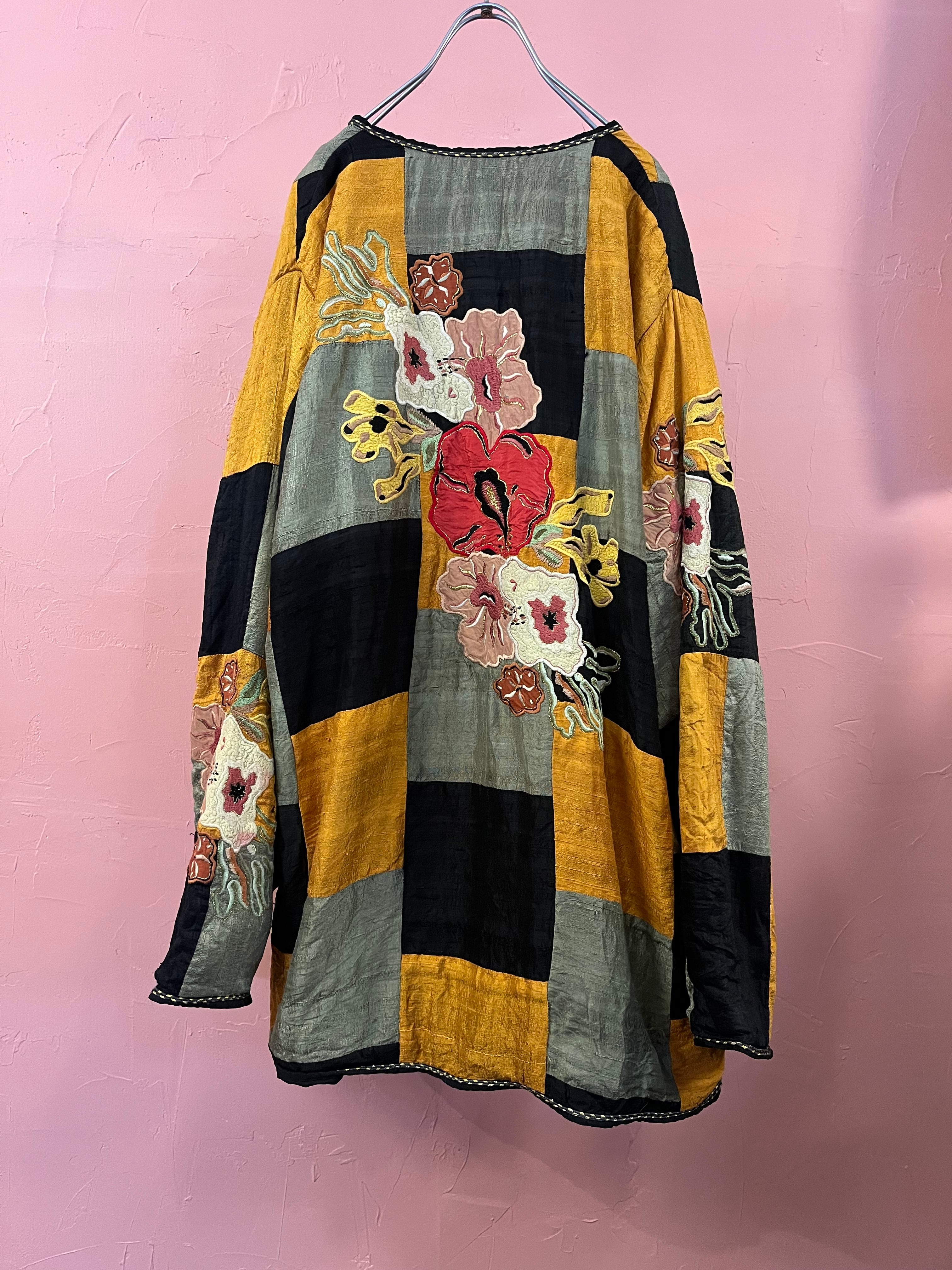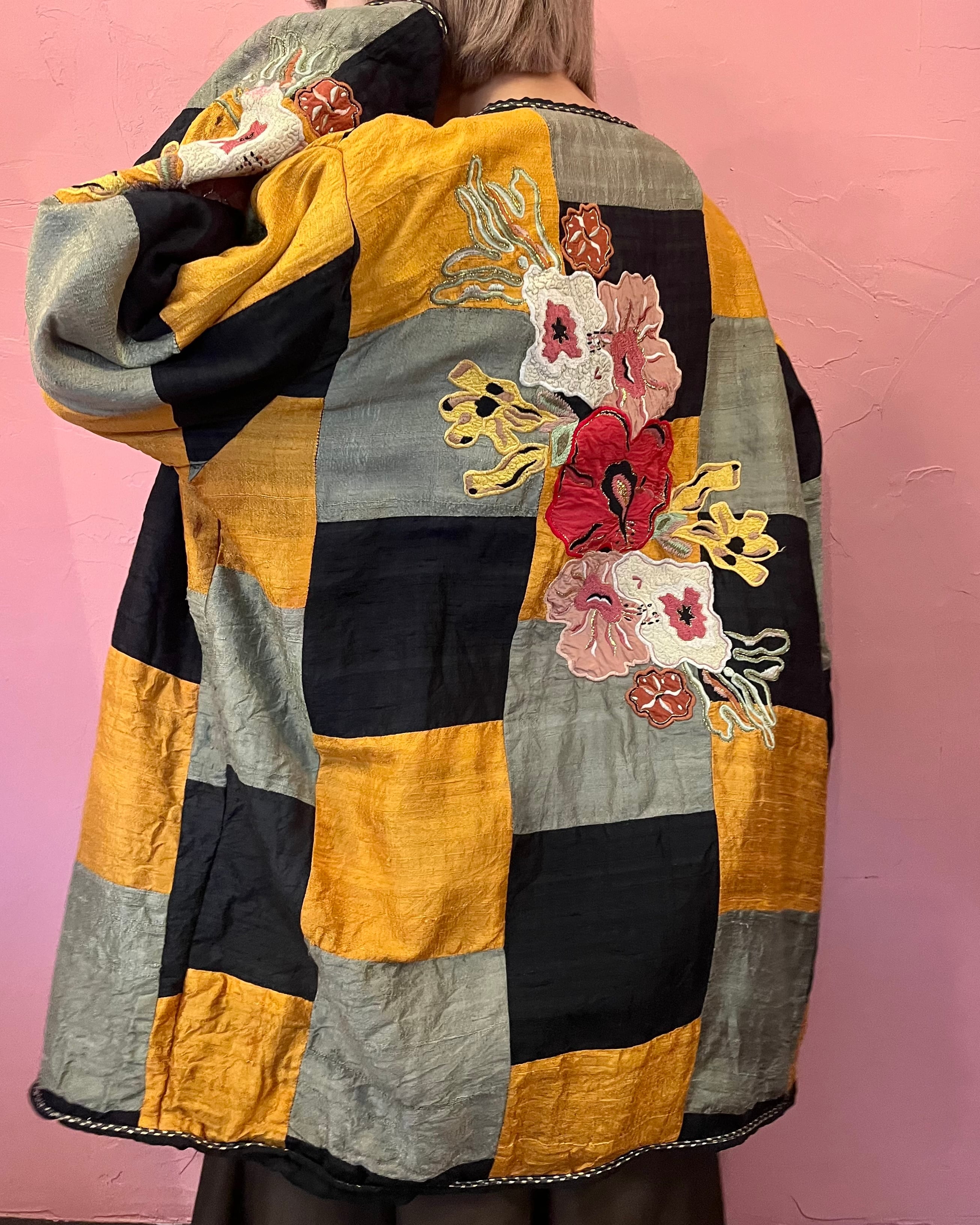 パッチワークにお花の刺繍が大きく入った