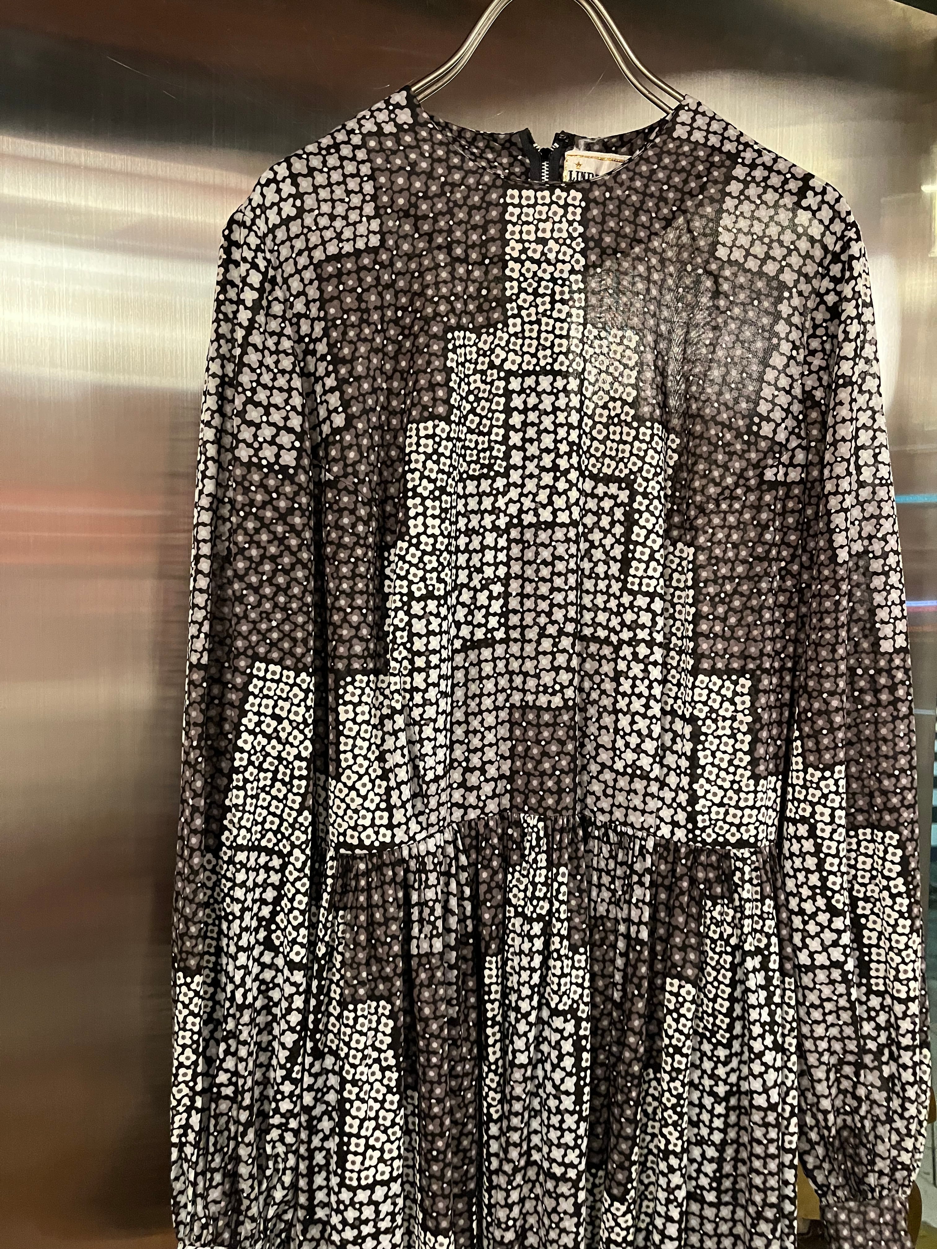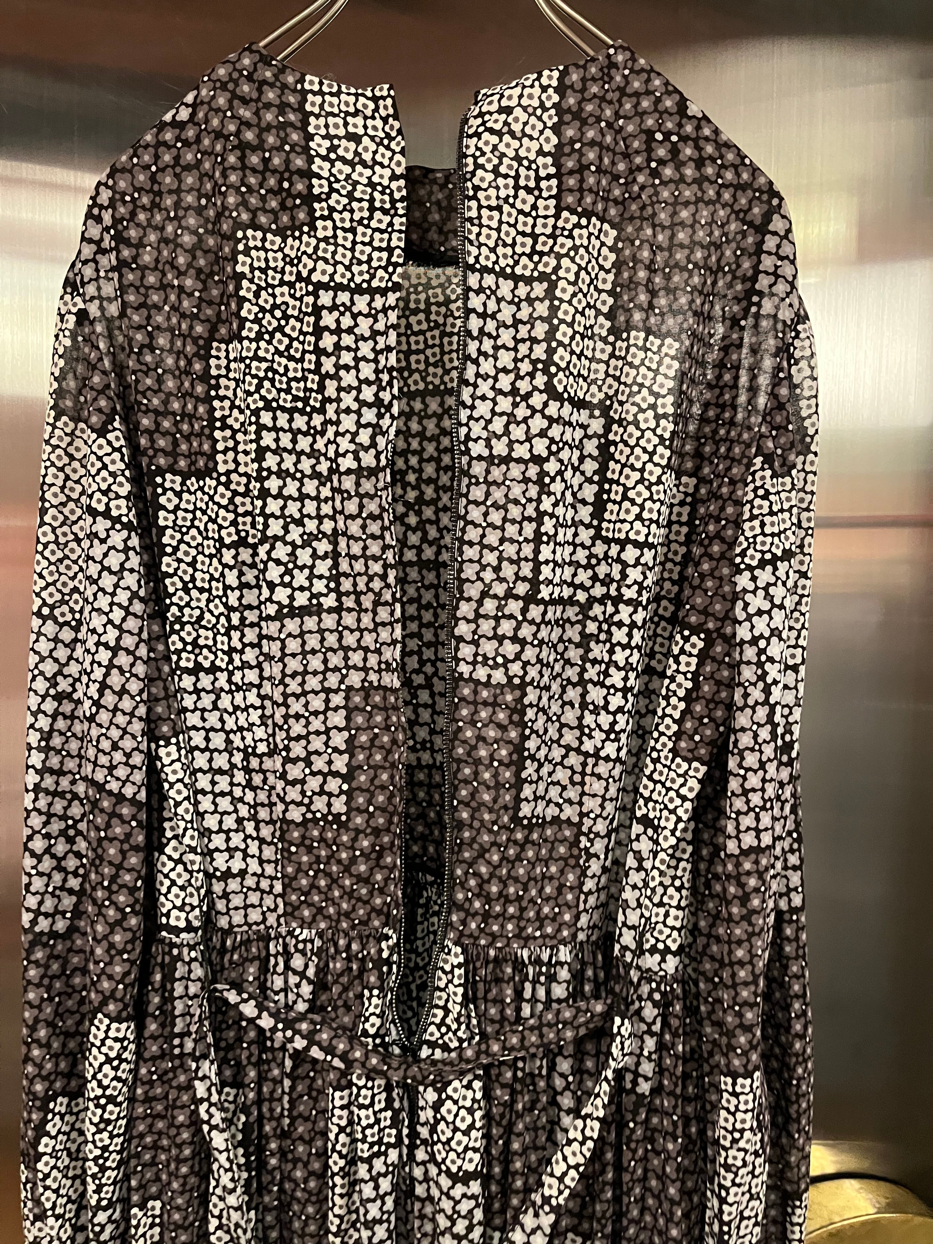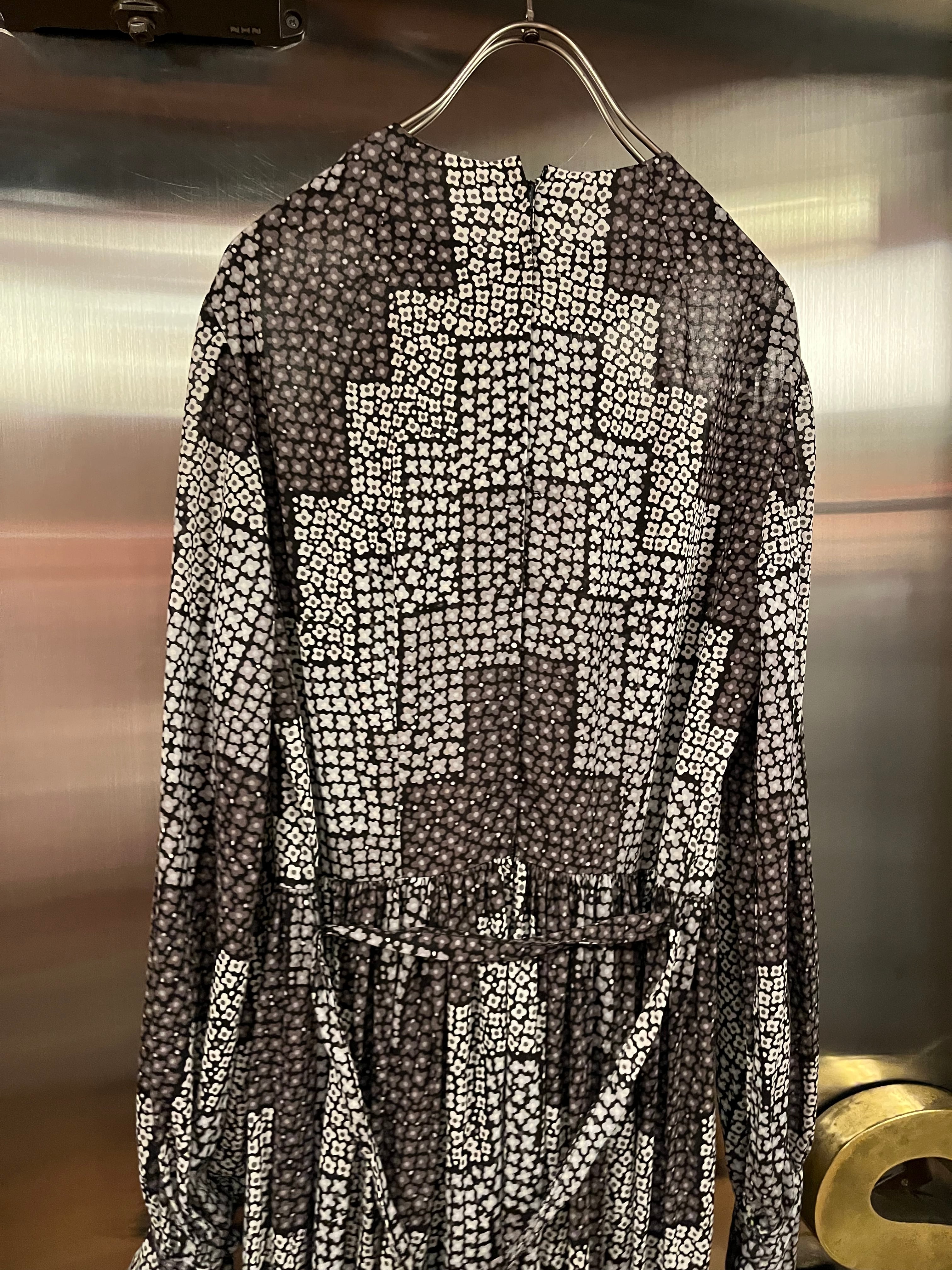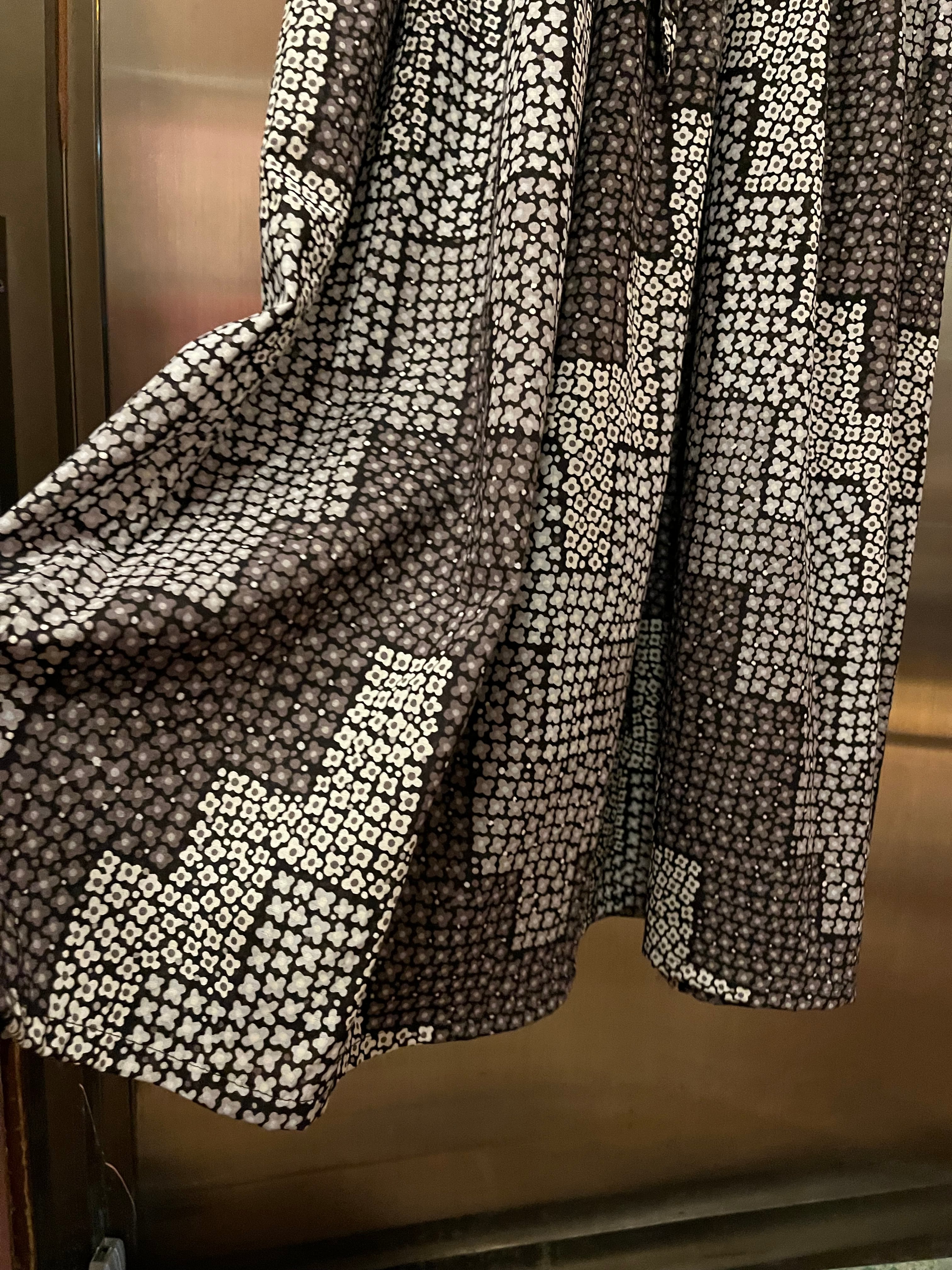 遠目でみるとジグザグとした柄に見えますが、近づくと小さなお花がぎっしりと詰まったかわいいワンピ