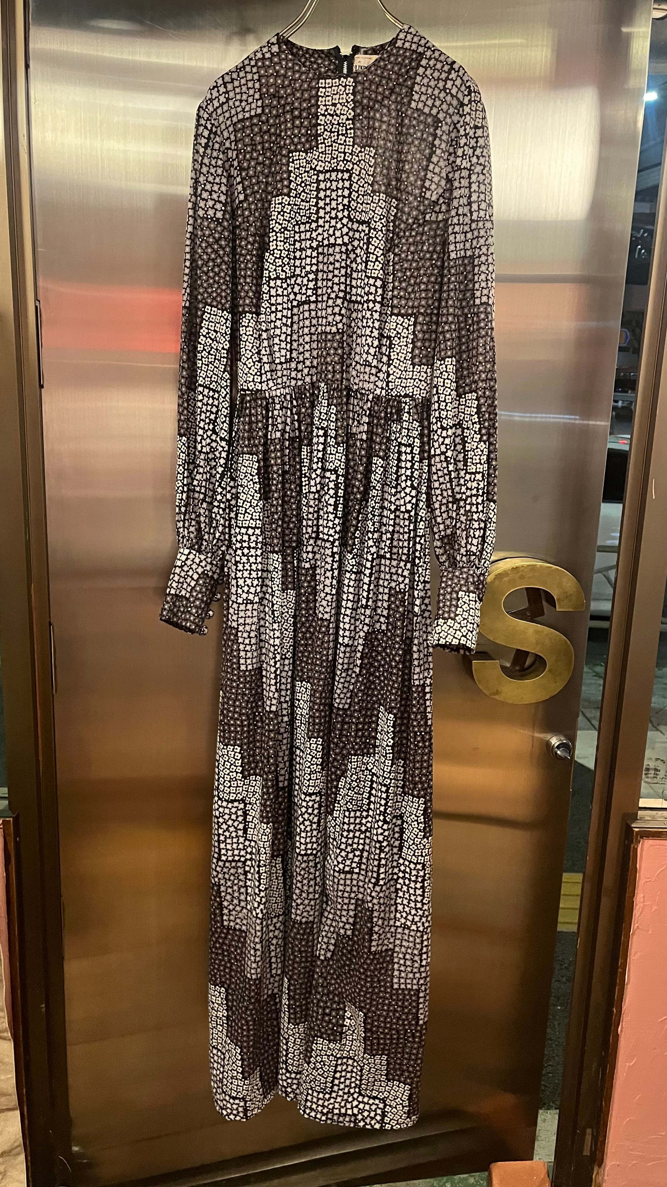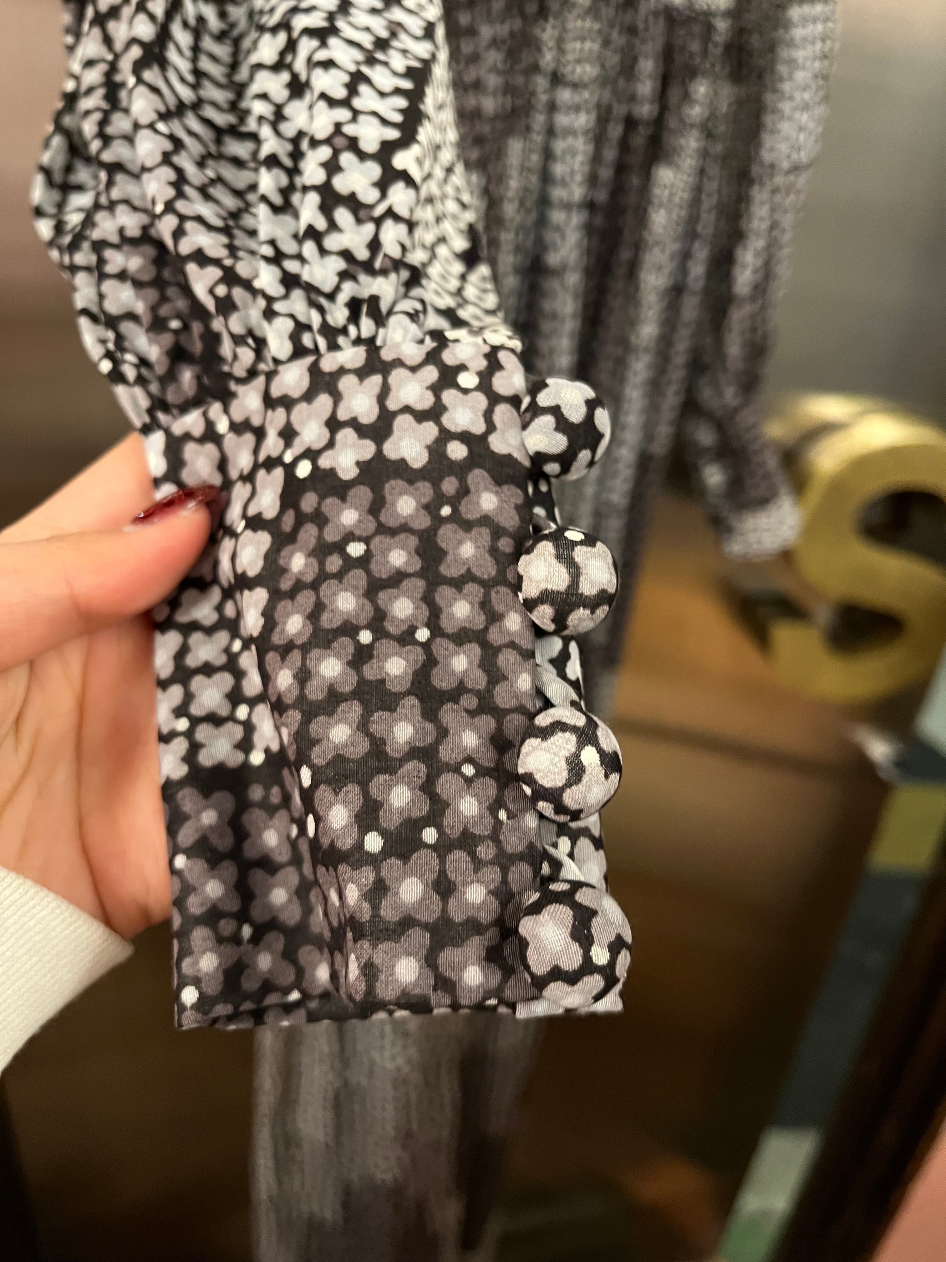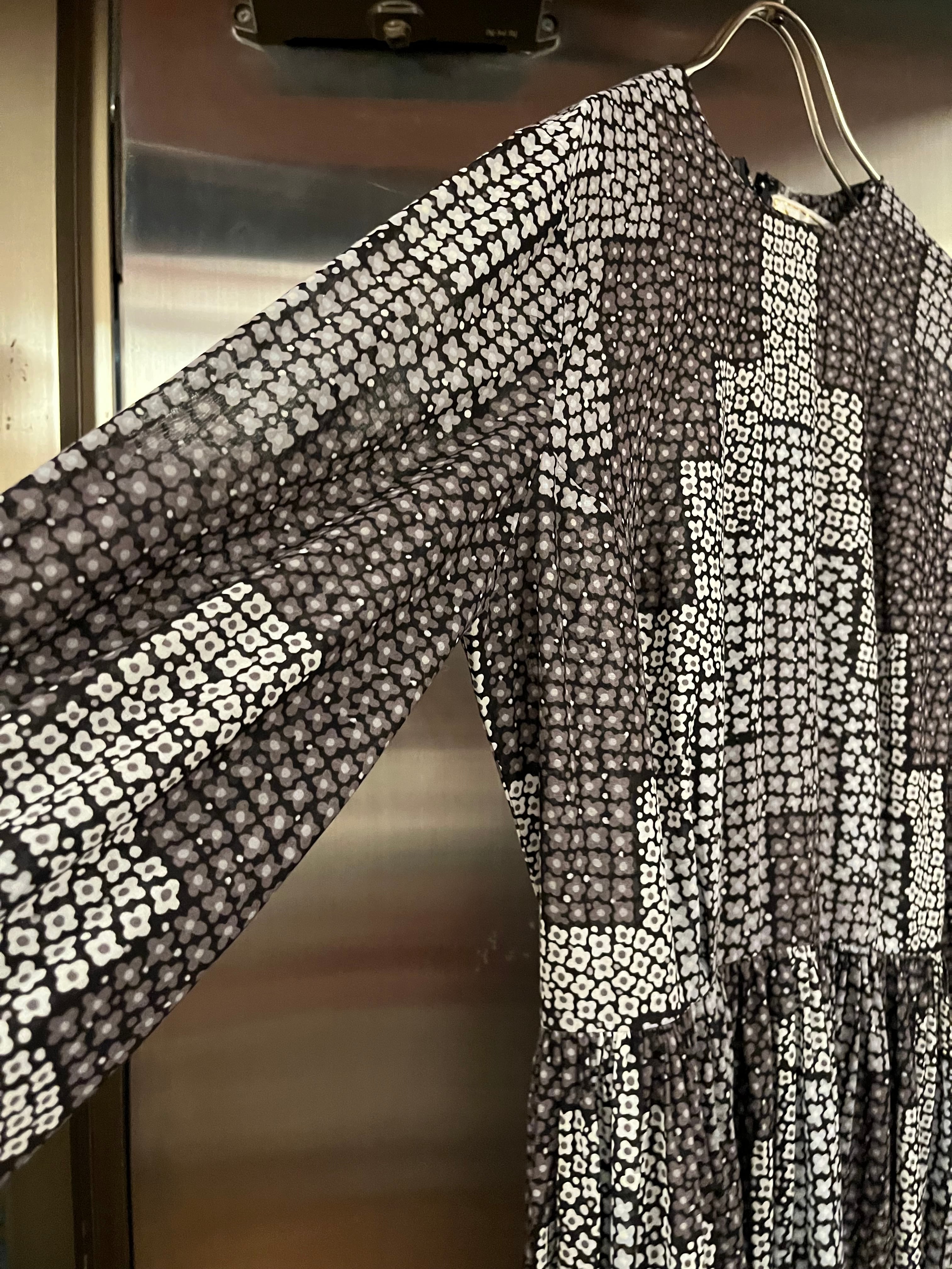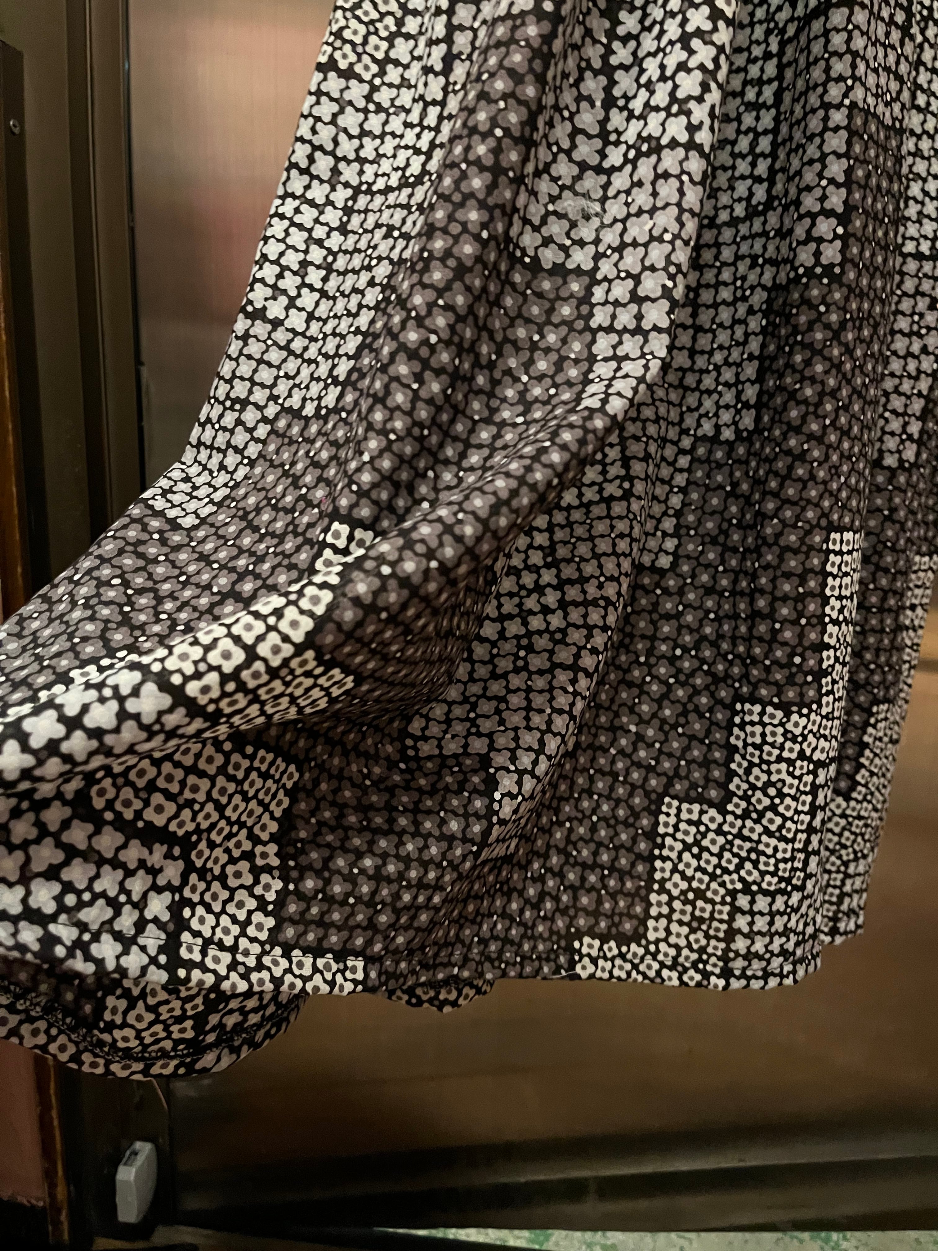 遠目でみるとジグザグとした柄に見えますが、近づくと小さなお花がぎっしりと詰まったかわいいワンピ