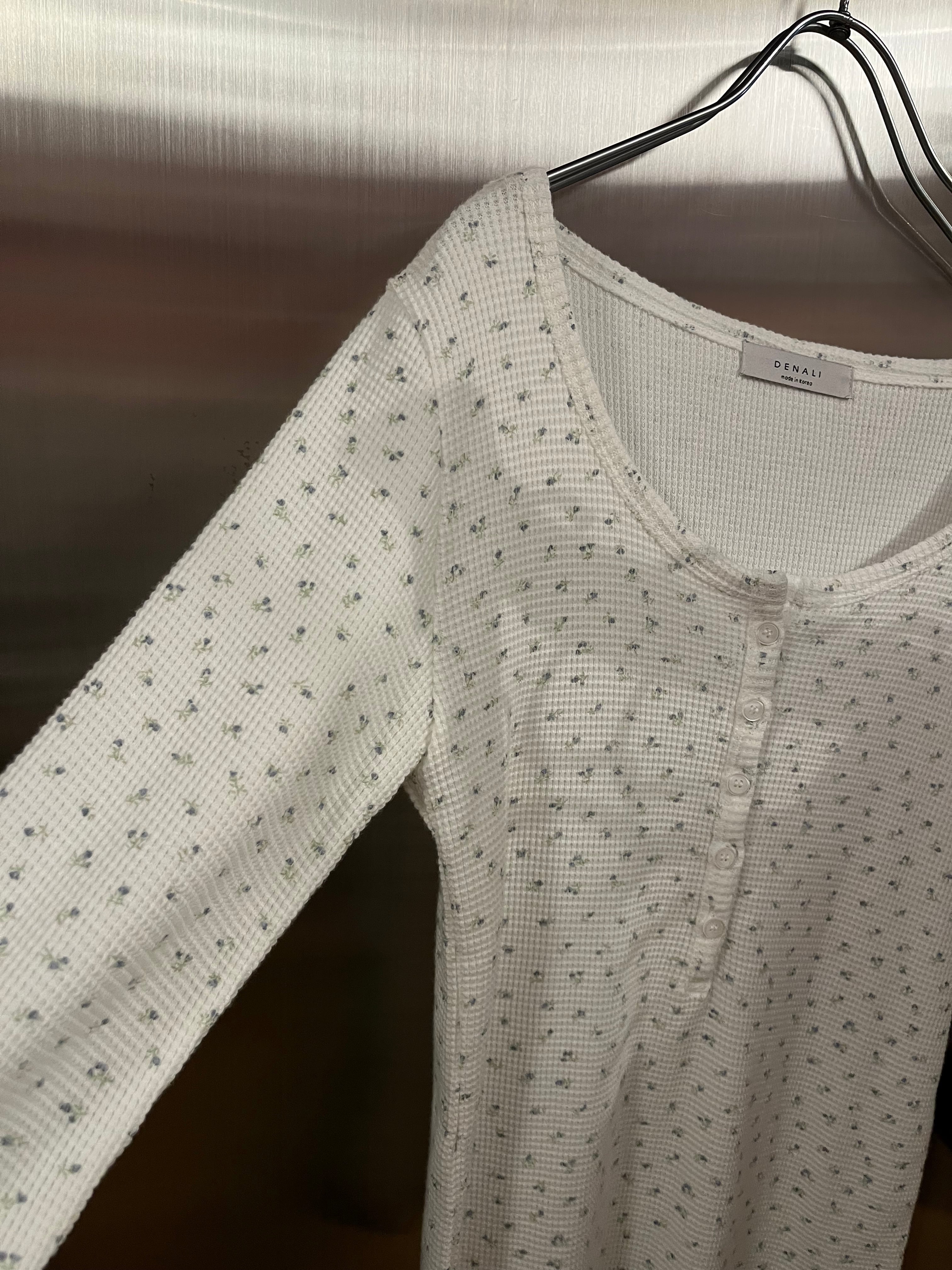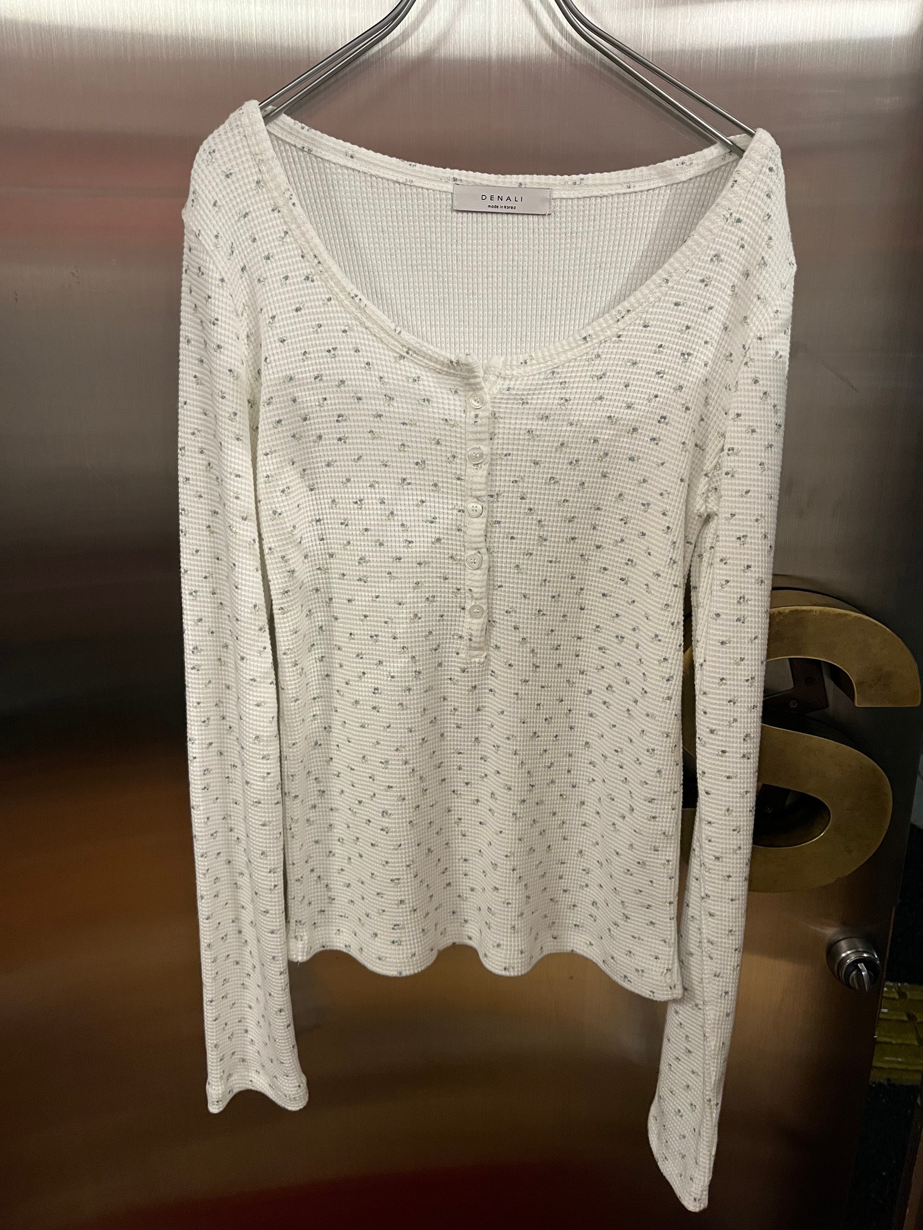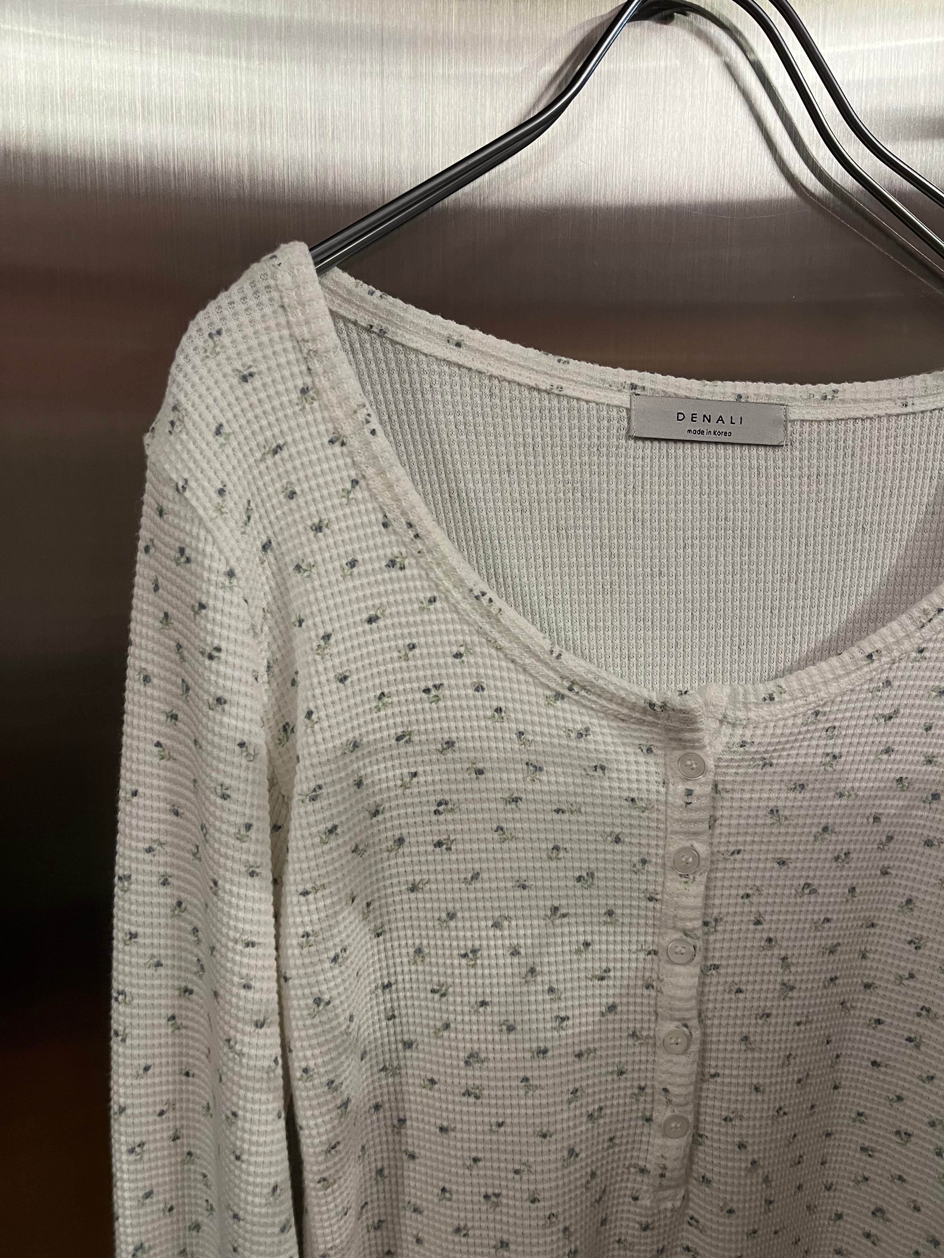 ブルーの小花柄とヘンリーネックのヘルシーなバランスがかわいいトップス。