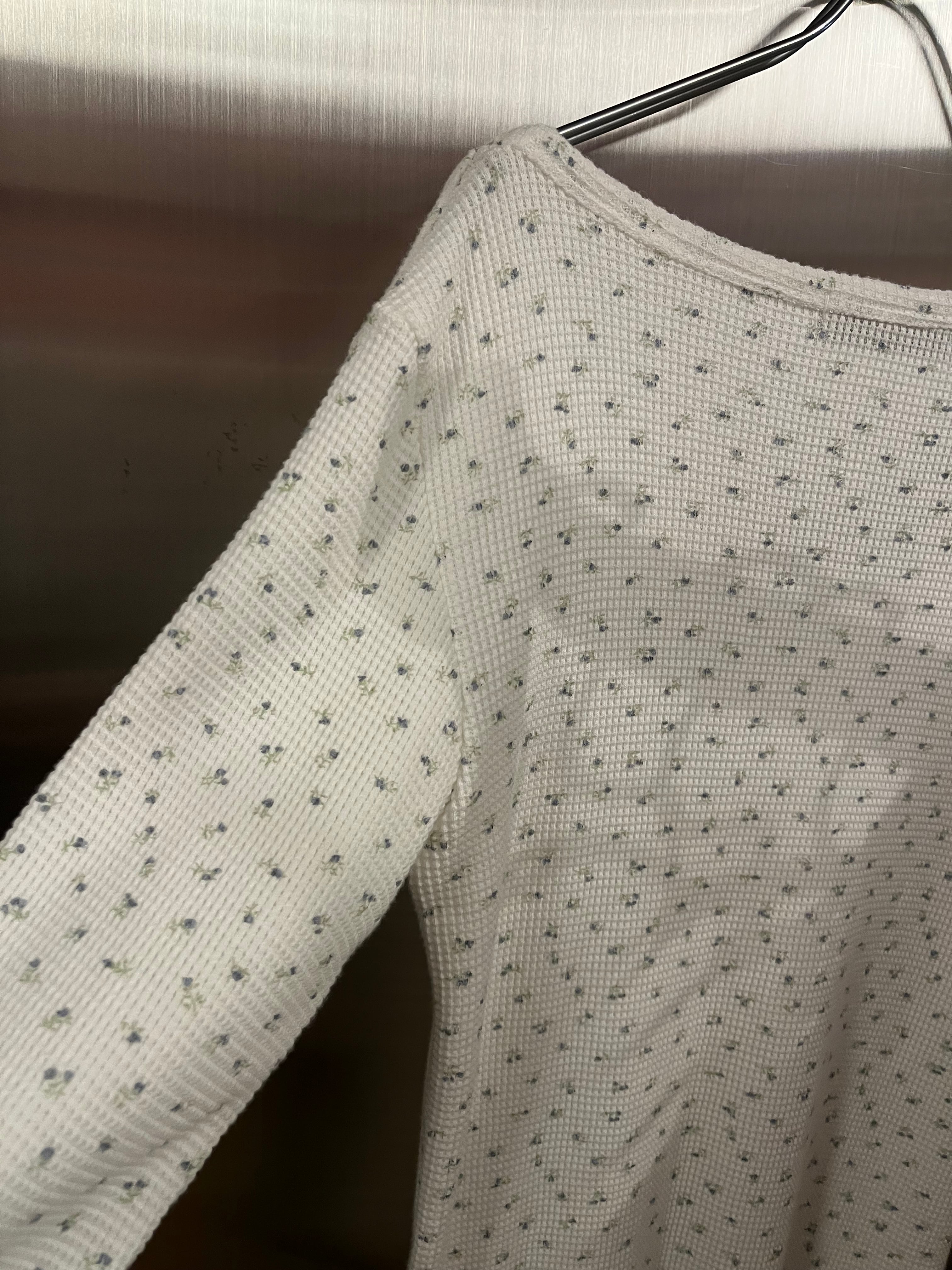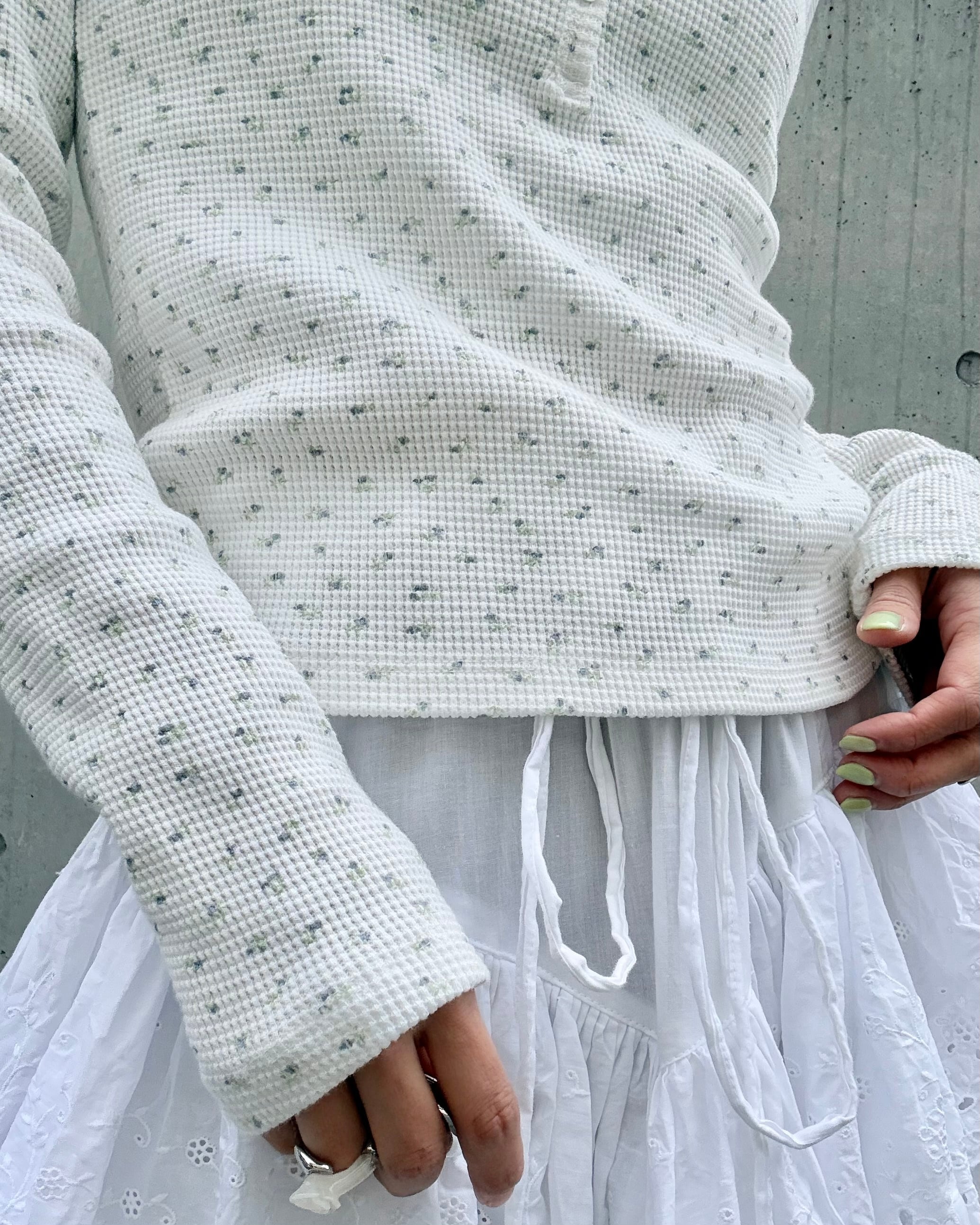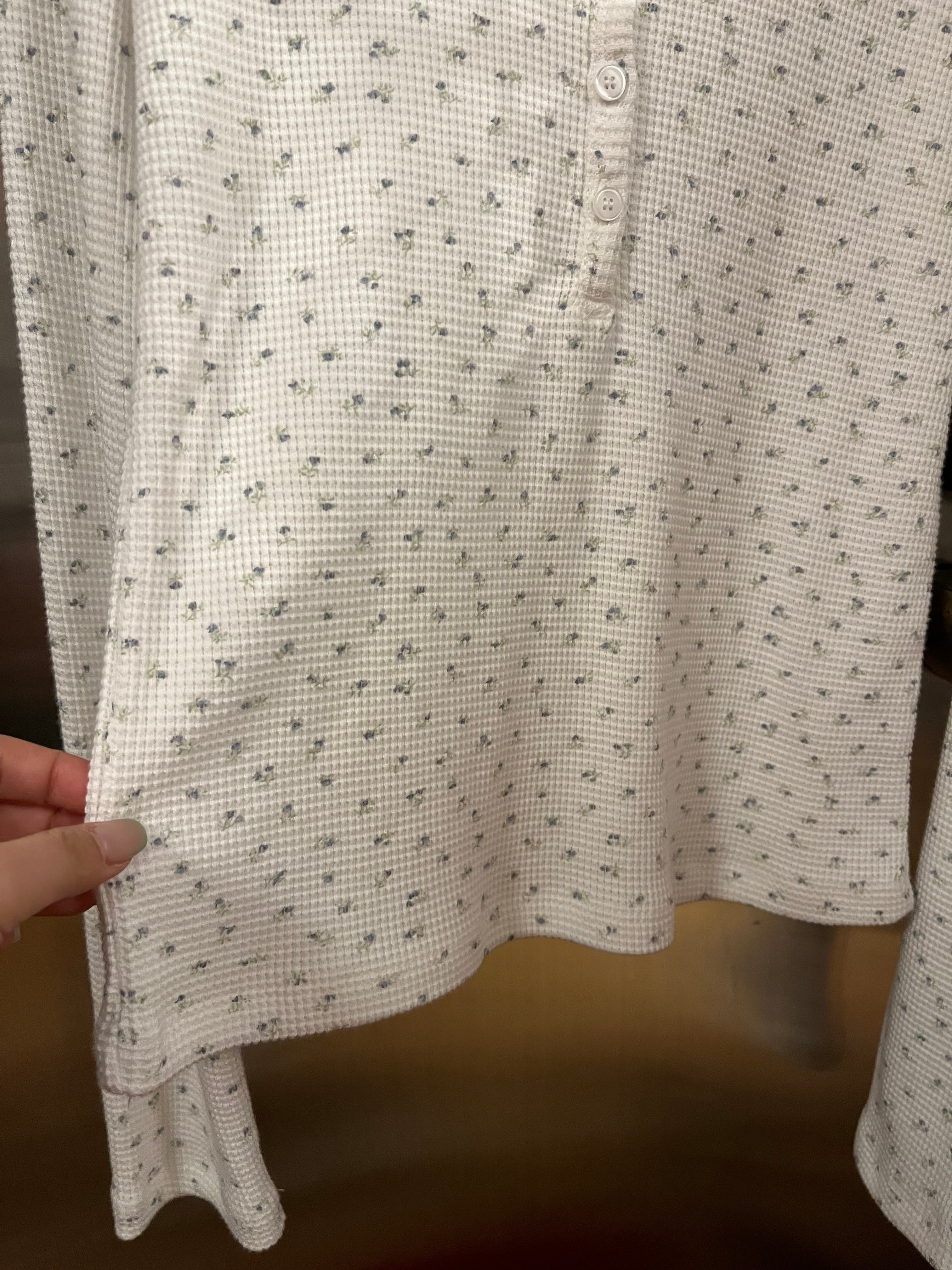ブルーの小花柄とヘンリーネックのヘルシーなバランスがかわいいトップス。