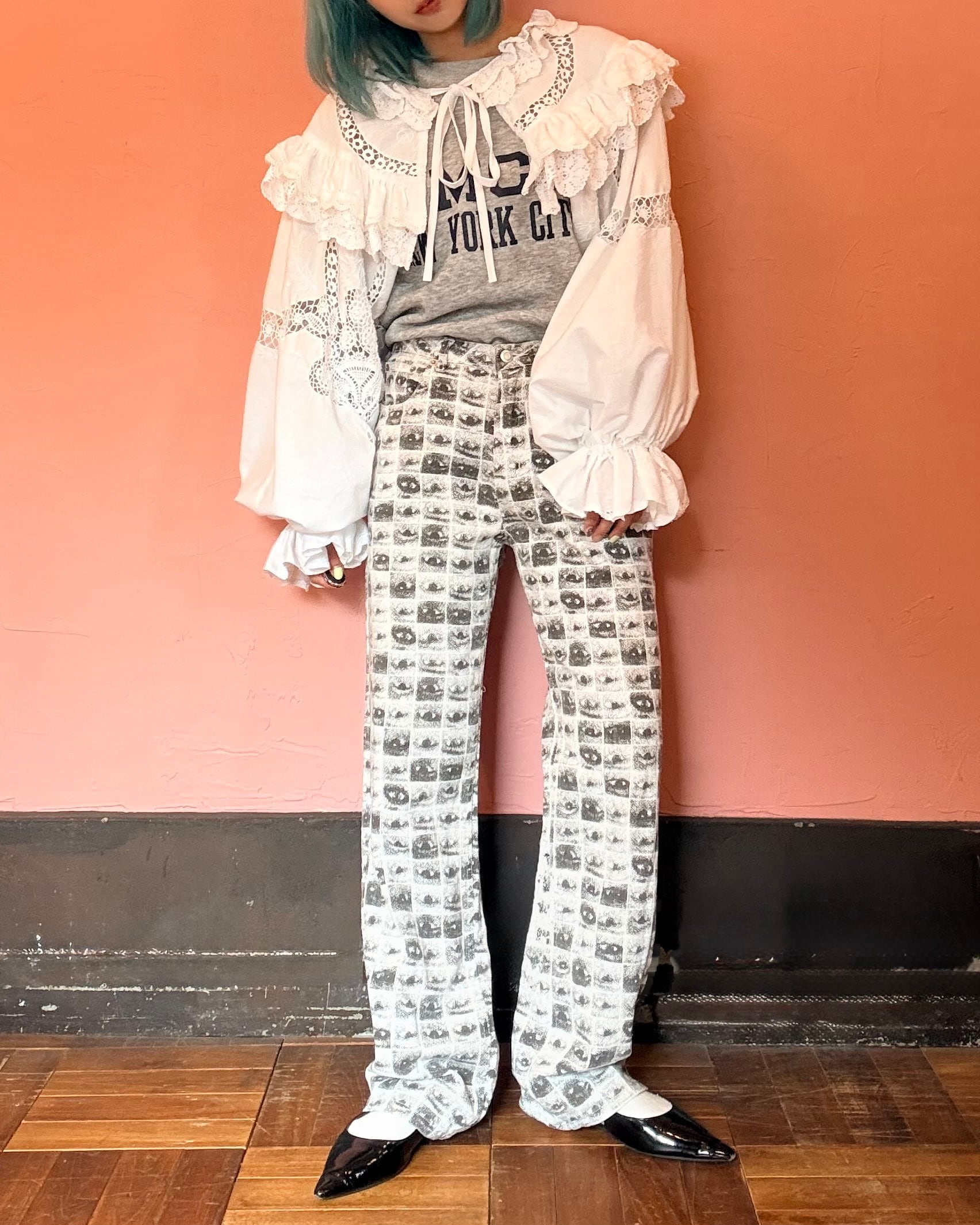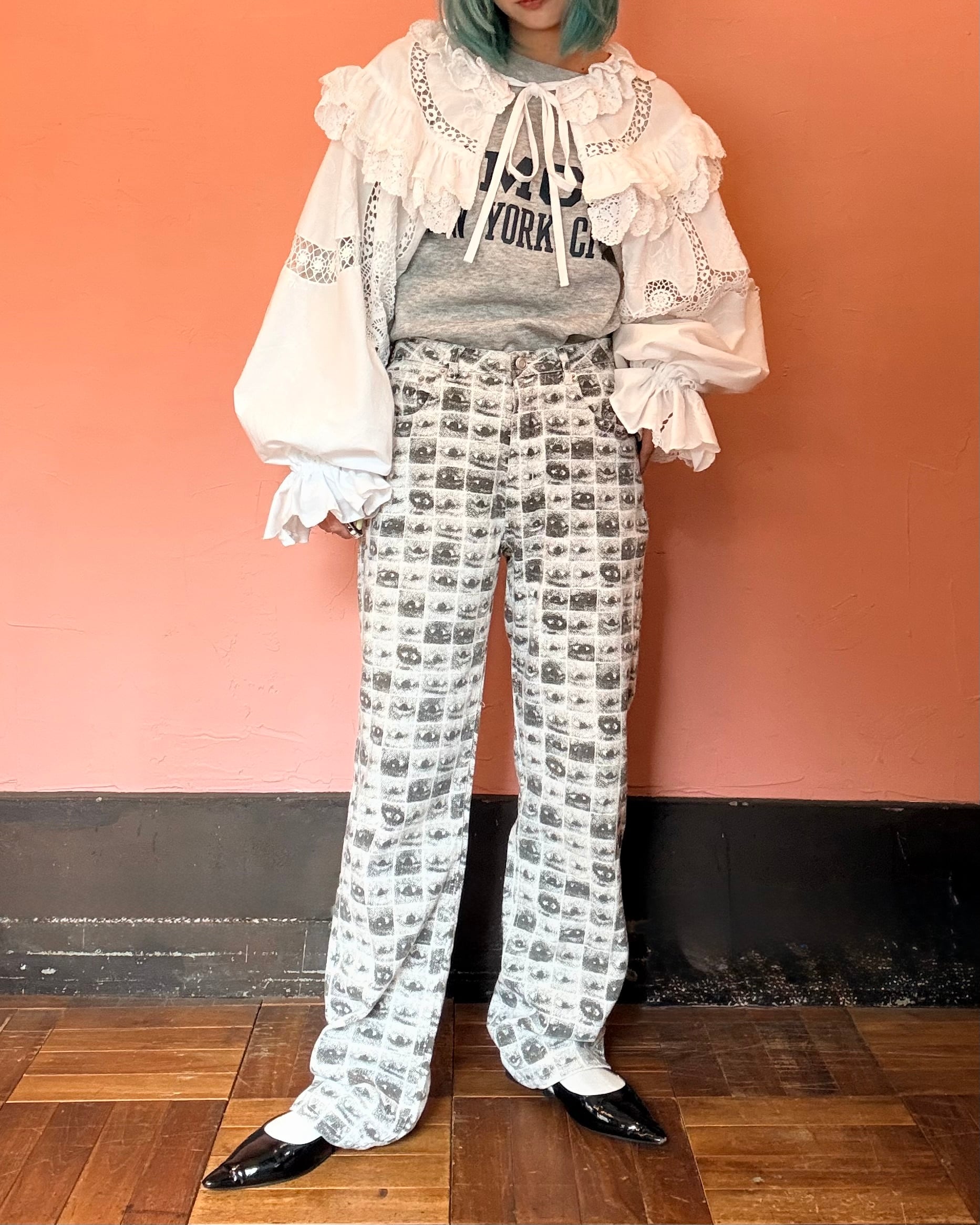 片目のプリントが個性的なパンツ。